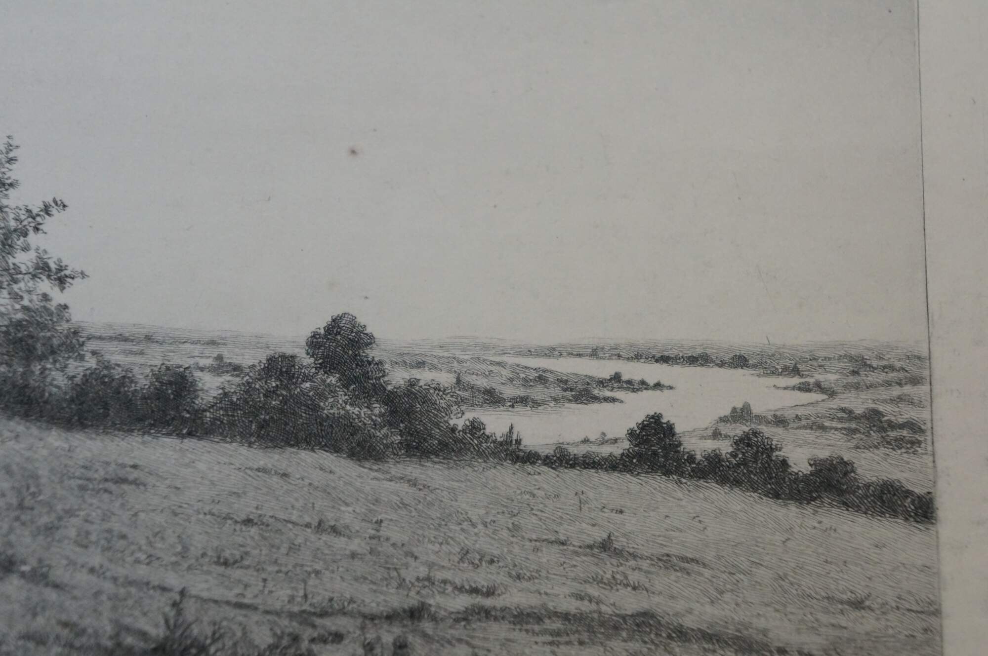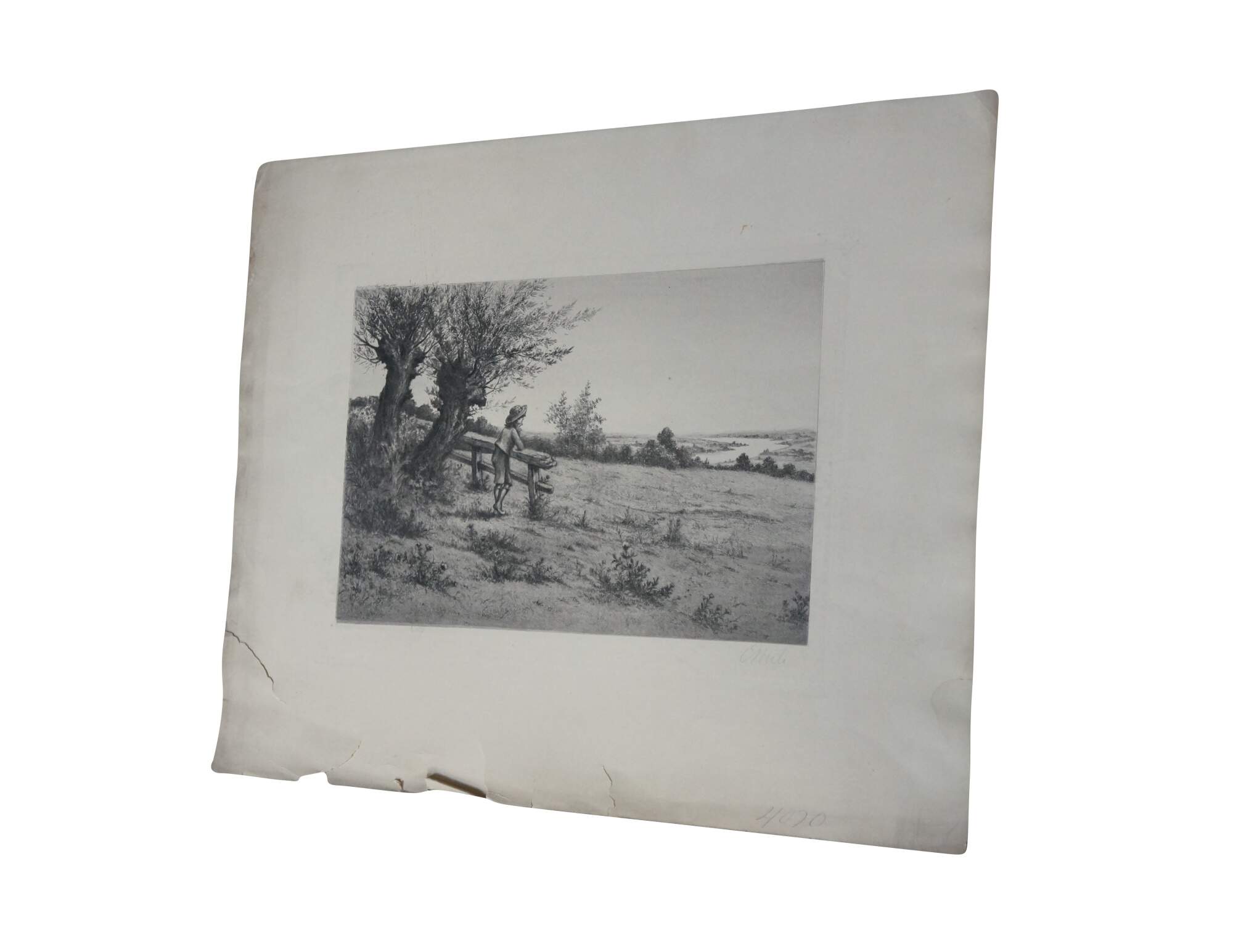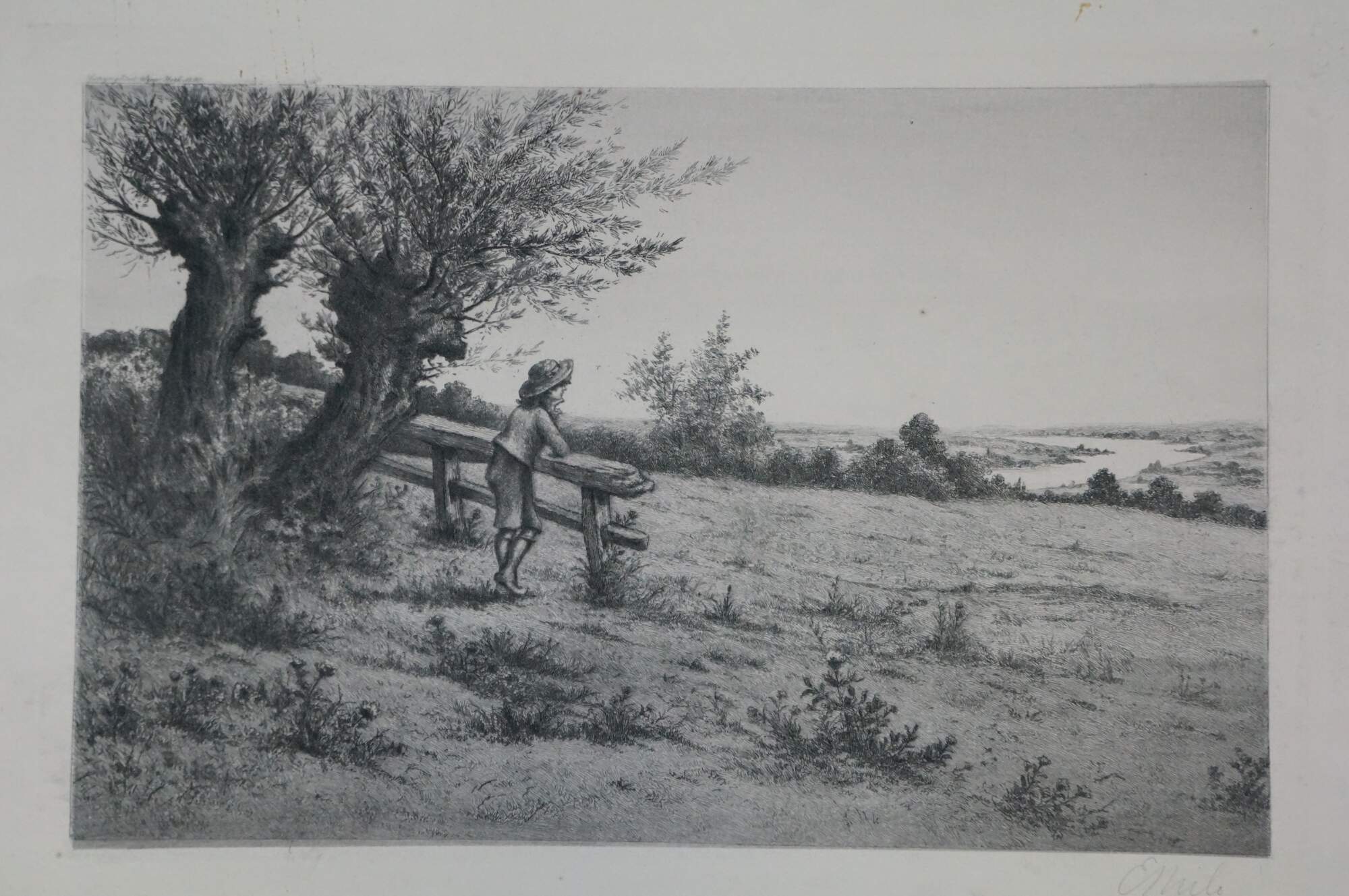 Late 19th century black and white etching titled "The Survey" by Emil Milo. Show a figure leaning on a fence and looking over a sweeping country landscape and river. Copyrighted, New York, 1890. Pencil signed, lower right. Paper; unframed.