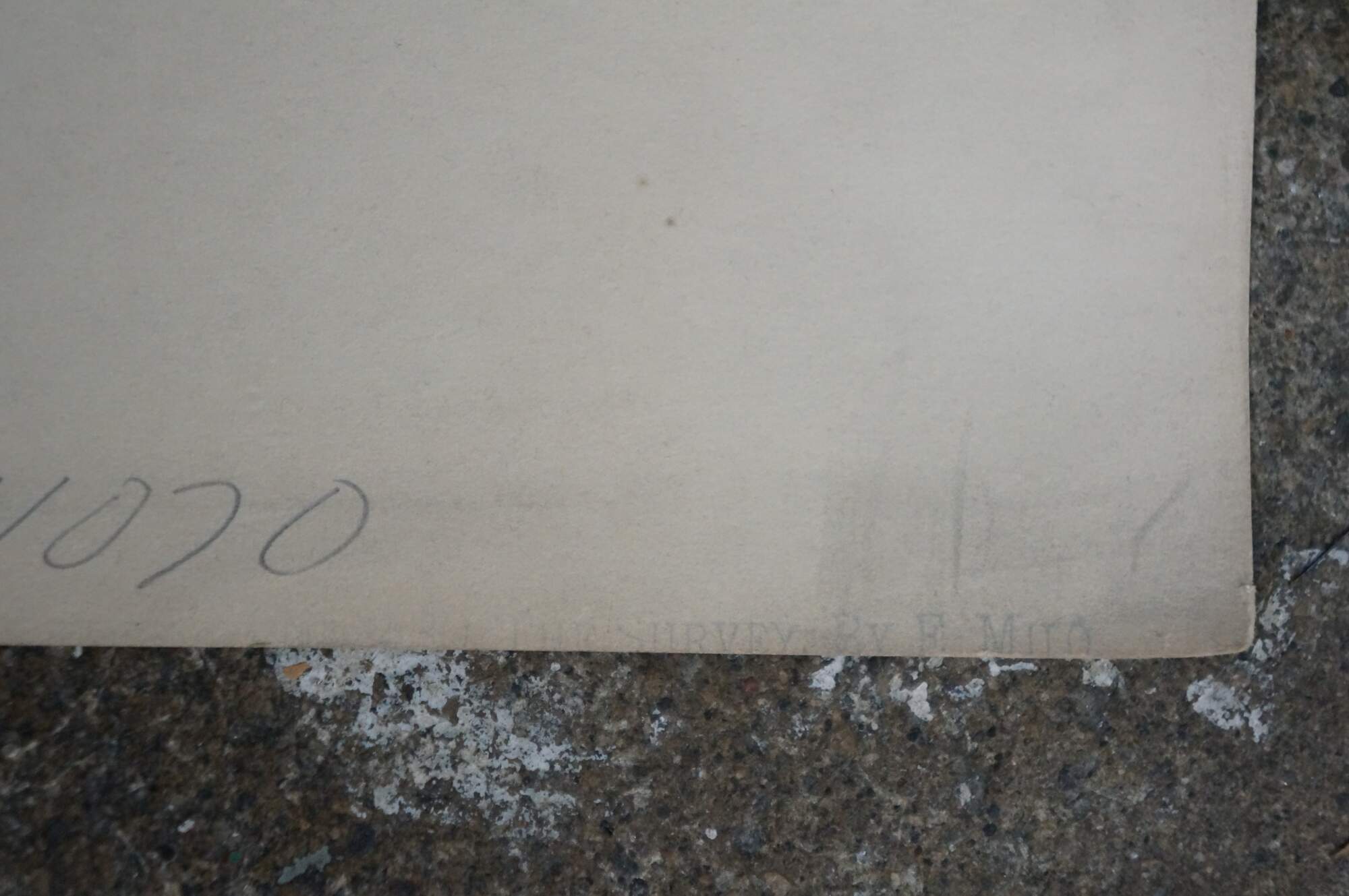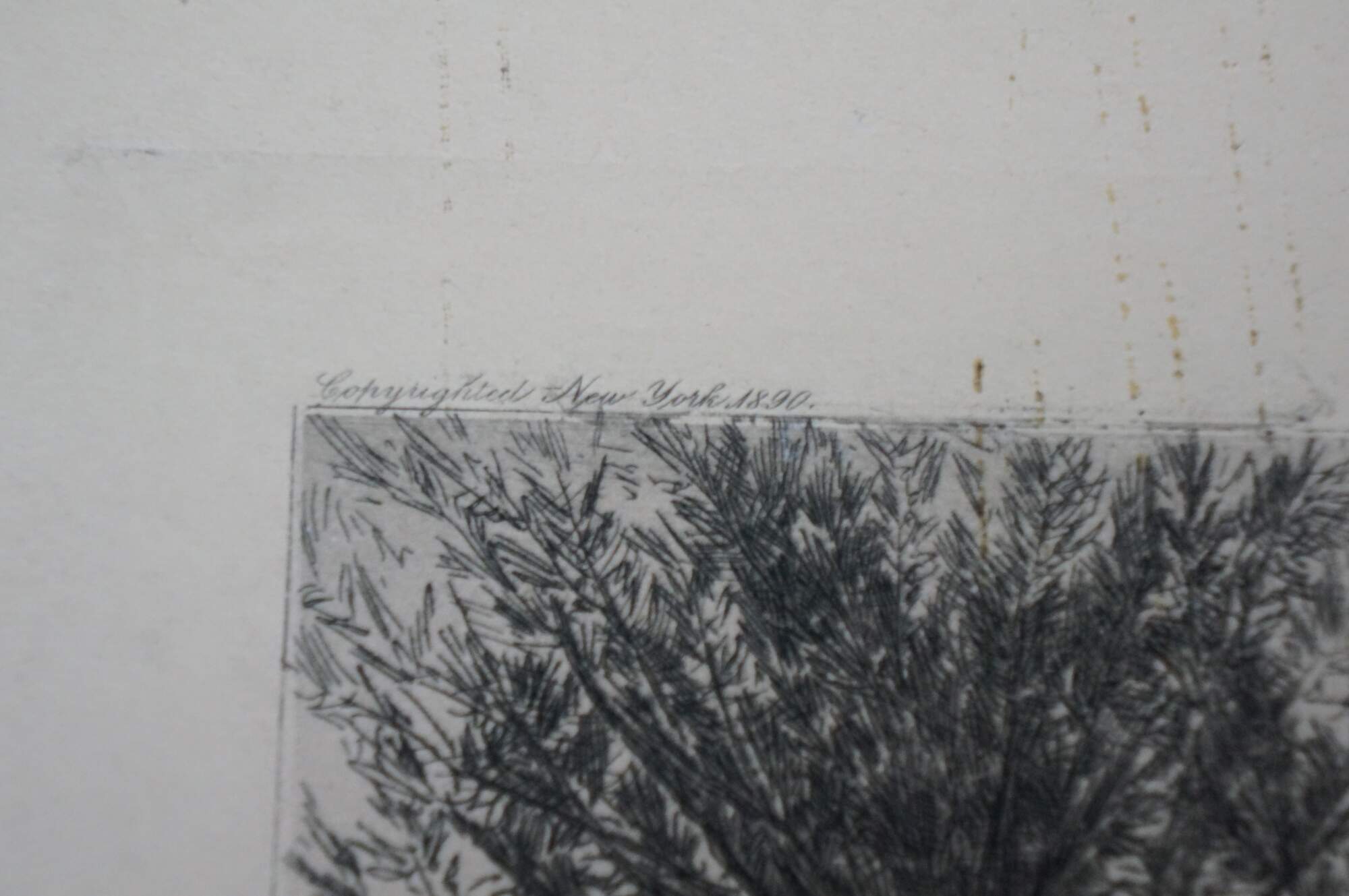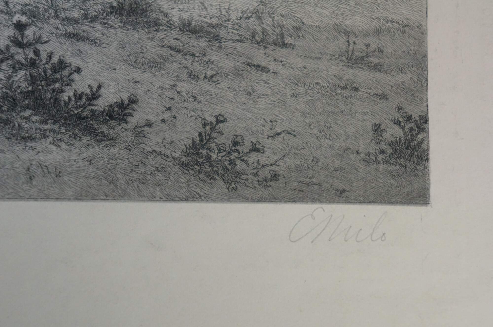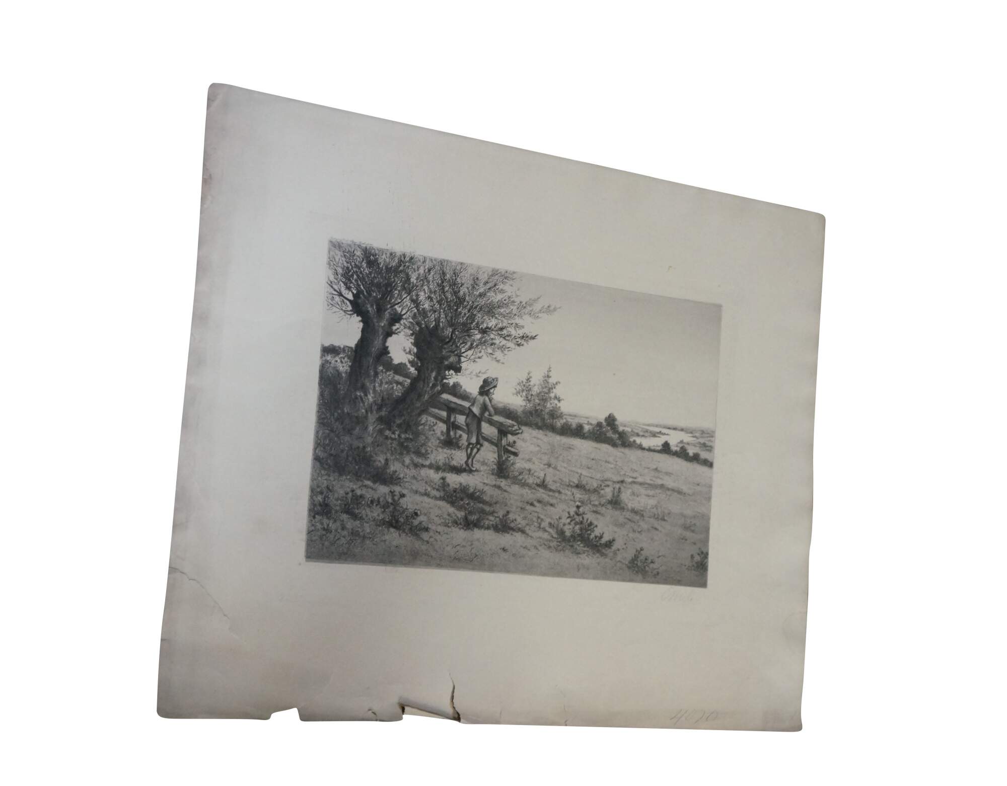 Late 19th century black and white etching titled "The Survey" by Emil Milo. Show a figure leaning on a fence and looking over a sweeping country landscape and river. Copyrighted, New York, 1890. Pencil signed, lower right. Paper; unframed.