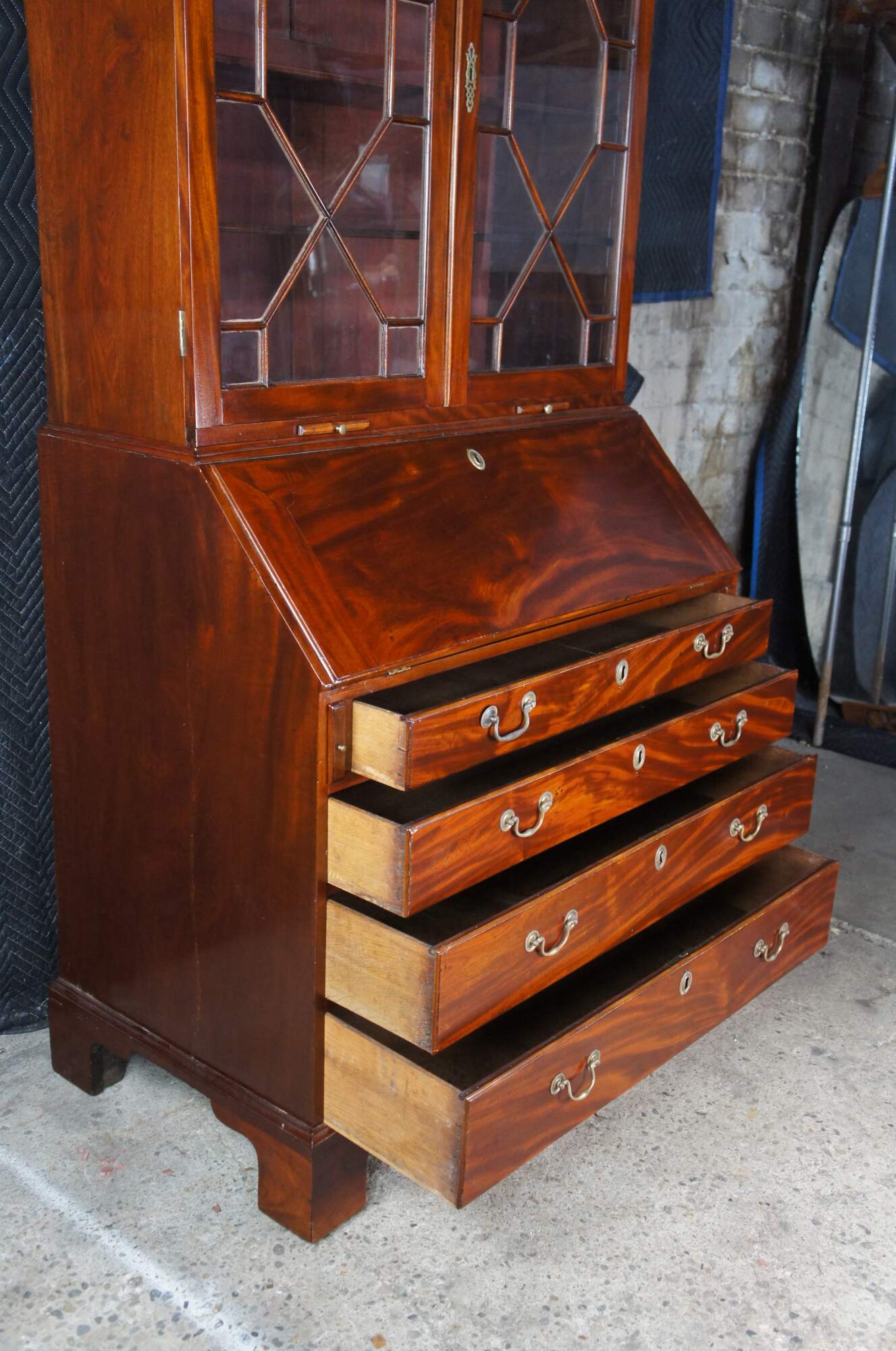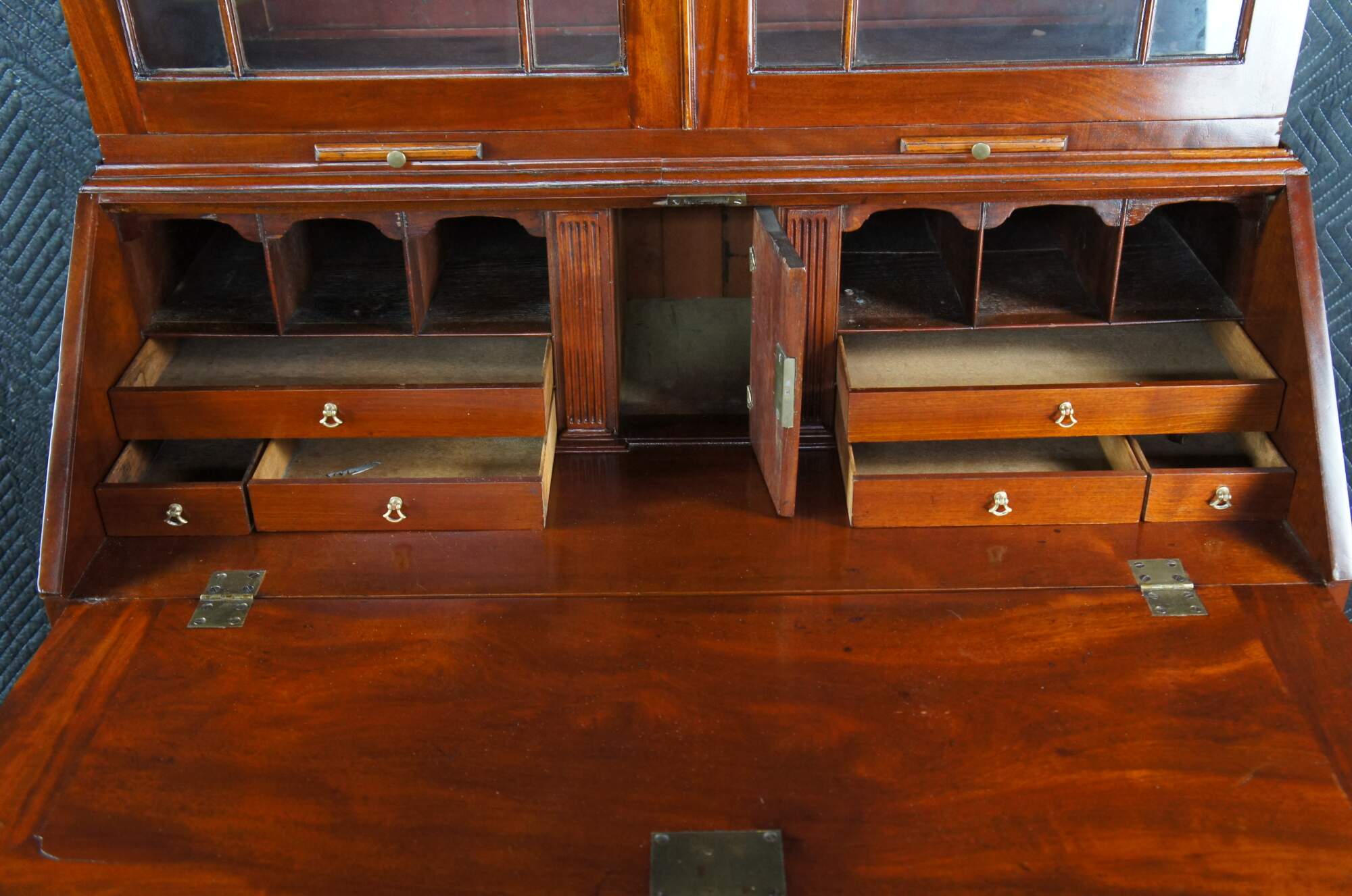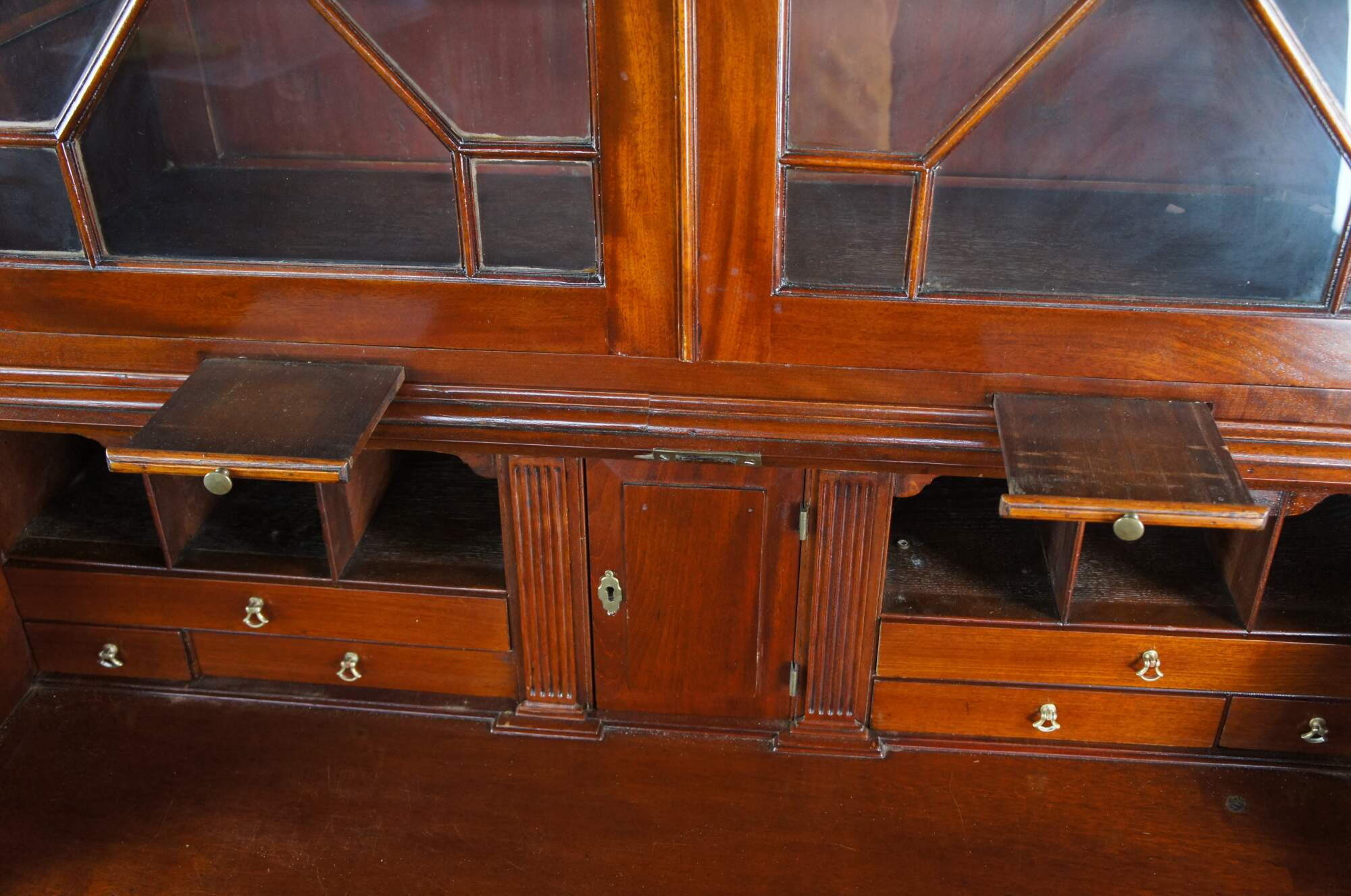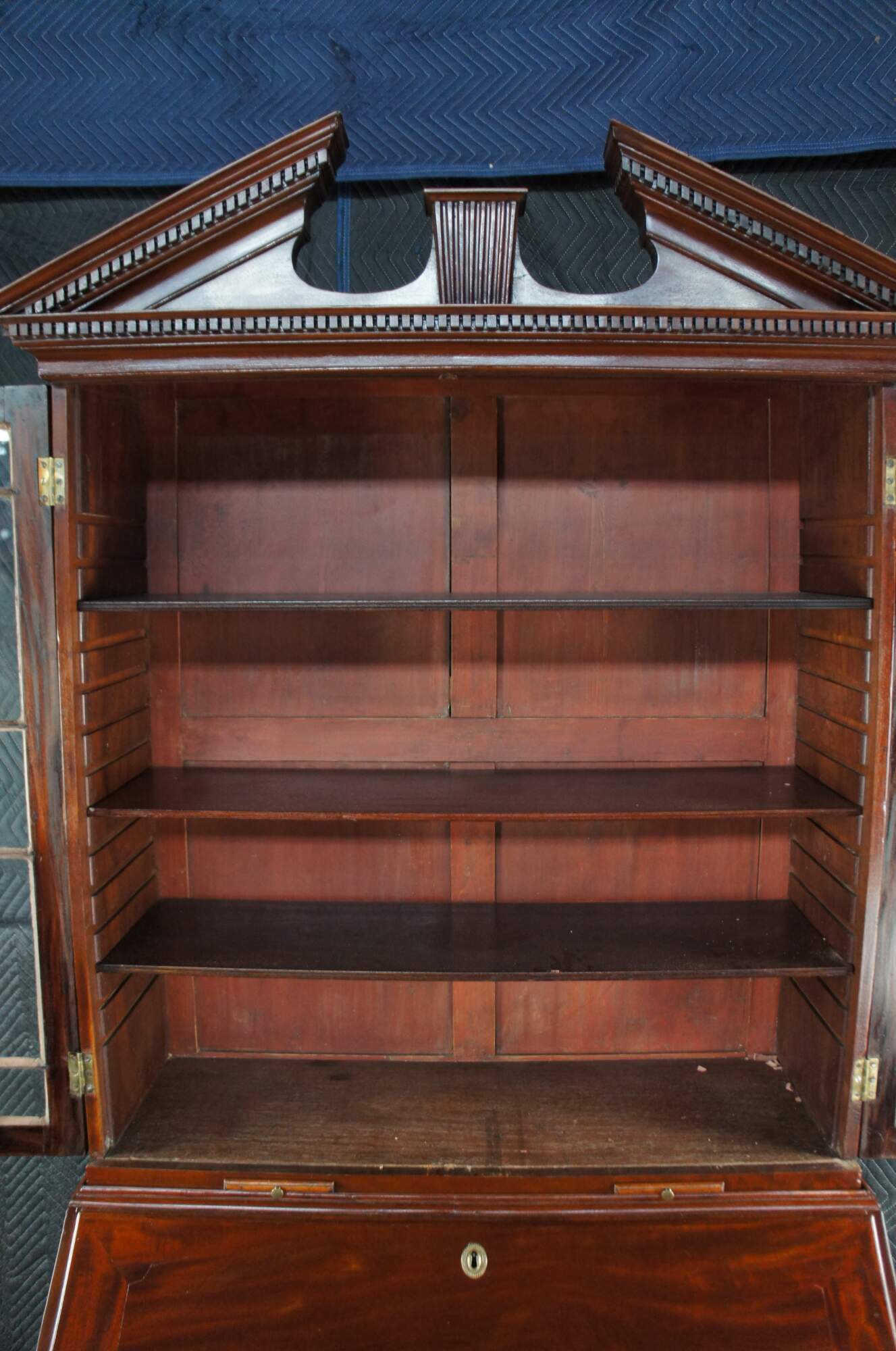 Late 18th Century George III Period Secretary Desk & Bookcase. Made from mahogany with a hooded pediment showcasing dentil molding over a glass covered display portion with beautiful fretwork opening to three adustable shelves. The slant top or 'Fall Front' portion of the desk opens to reveal hand dovetailed drawers and pigeon holes flanking a central cabinet and hidden slides. Above the desk portion are two pull-out shelves which would have been used as candle stands so that the desk could be used in the evening. The case of the secretary features four hand dovetailed oak drawers with traditional brass bale hardware and ornate escutcheon plates. The case of the cabinet is supported by bracket feet. This large and beautiful bookcase exhibits rich mahogany grains and will make a statement in any space.