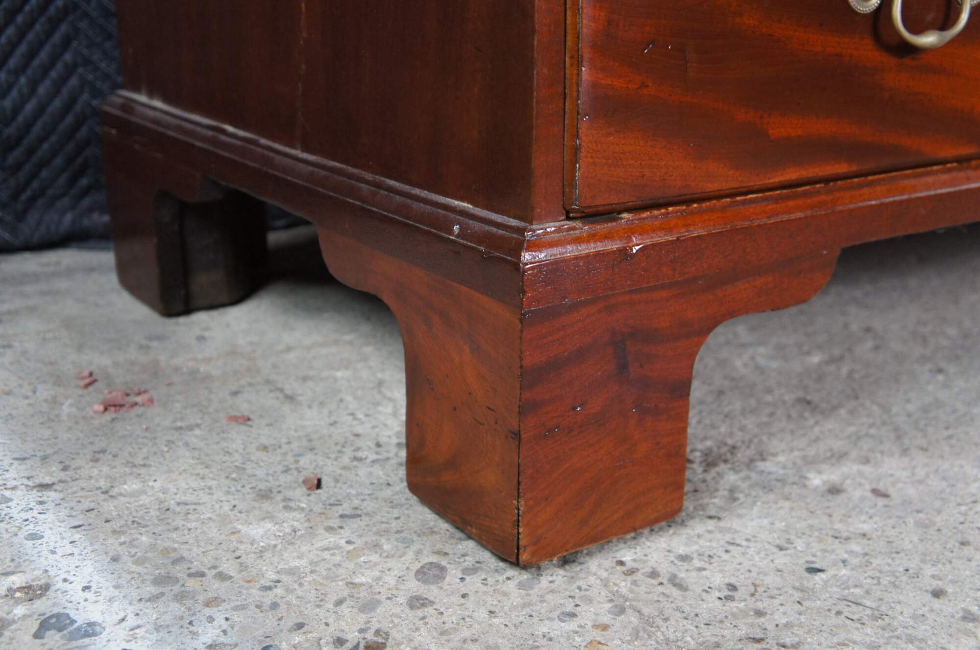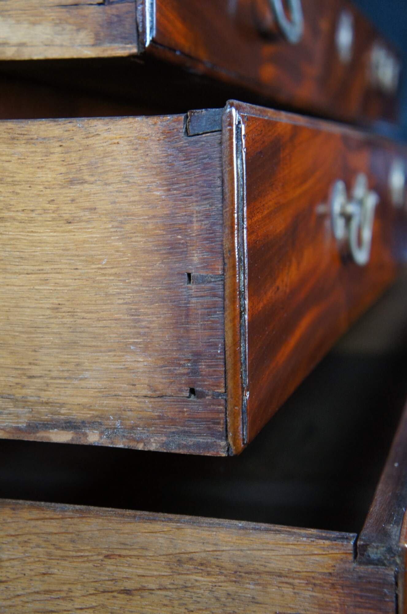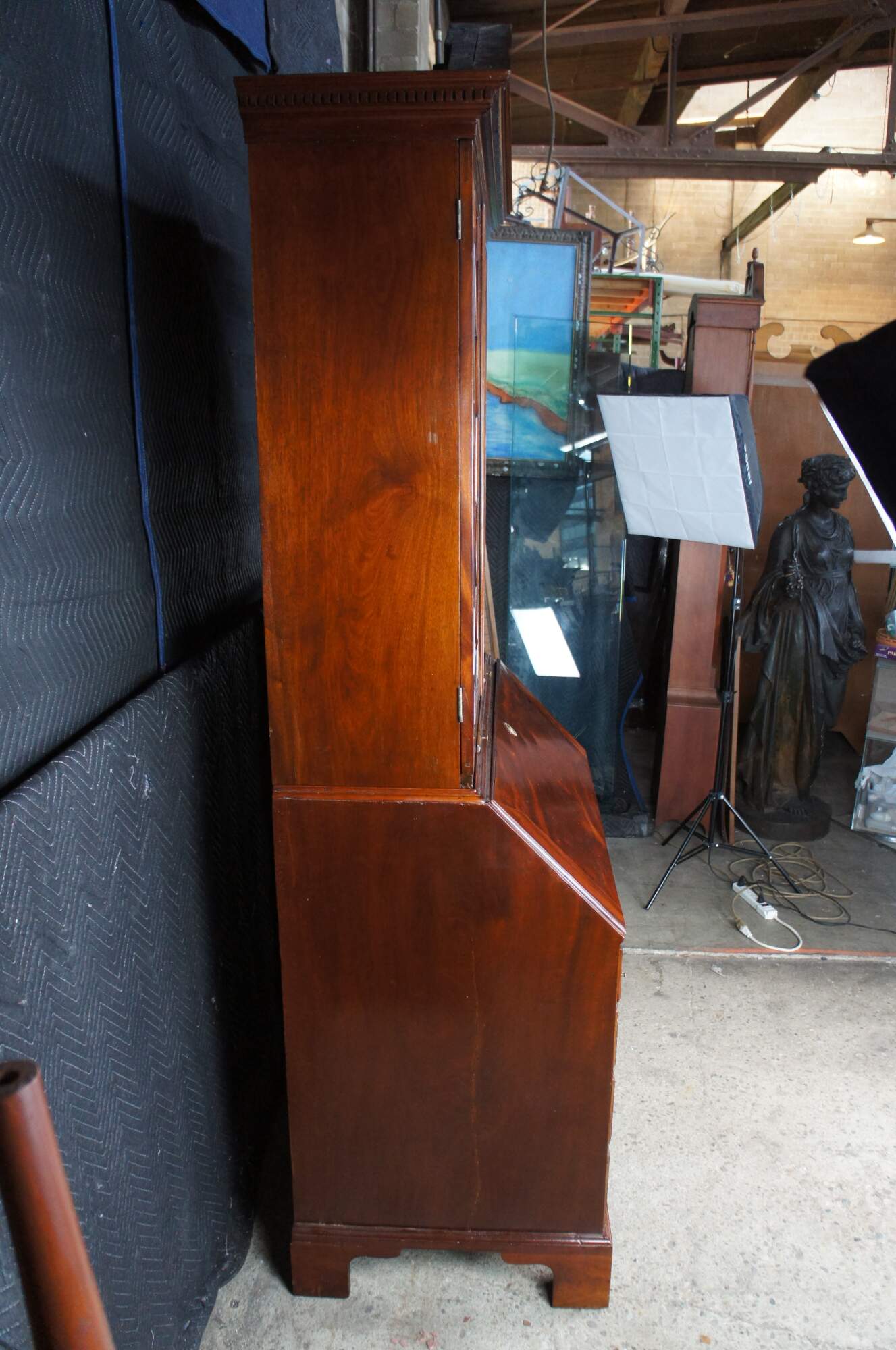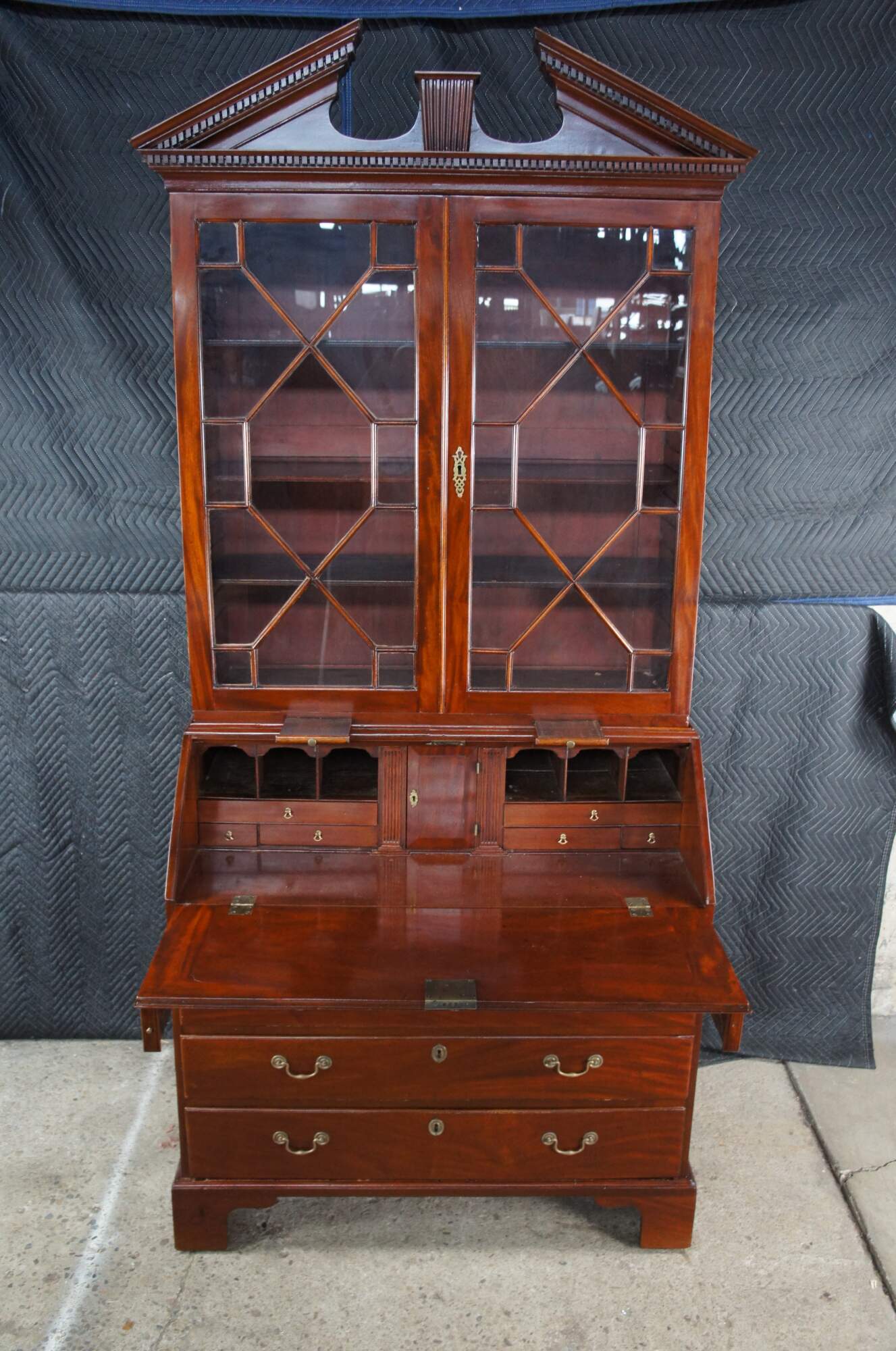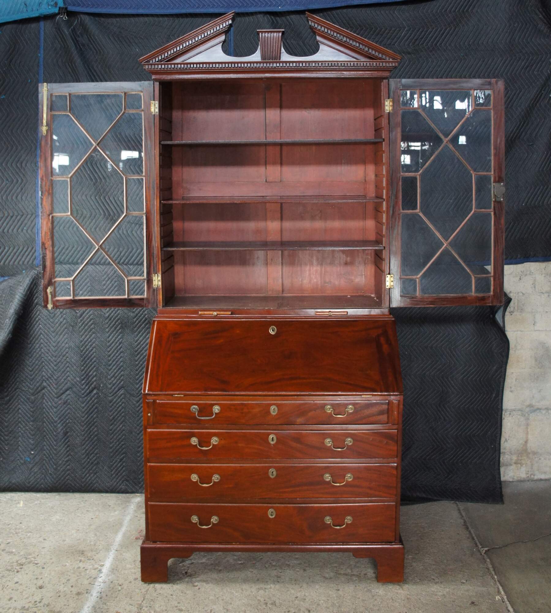 Late 18th Century George III Period Secretary Desk & Bookcase. Made from mahogany with a hooded pediment showcasing dentil molding over a glass covered display portion with beautiful fretwork opening to three adustable shelves. The slant top or 'Fall Front' portion of the desk opens to reveal hand dovetailed drawers and pigeon holes flanking a central cabinet and hidden slides. Above the desk portion are two pull-out shelves which would have been used as candle stands so that the desk could be used in the evening. The case of the secretary features four hand dovetailed oak drawers with traditional brass bale hardware and ornate escutcheon plates. The case of the cabinet is supported by bracket feet. This large and beautiful bookcase exhibits rich mahogany grains and will make a statement in any space.