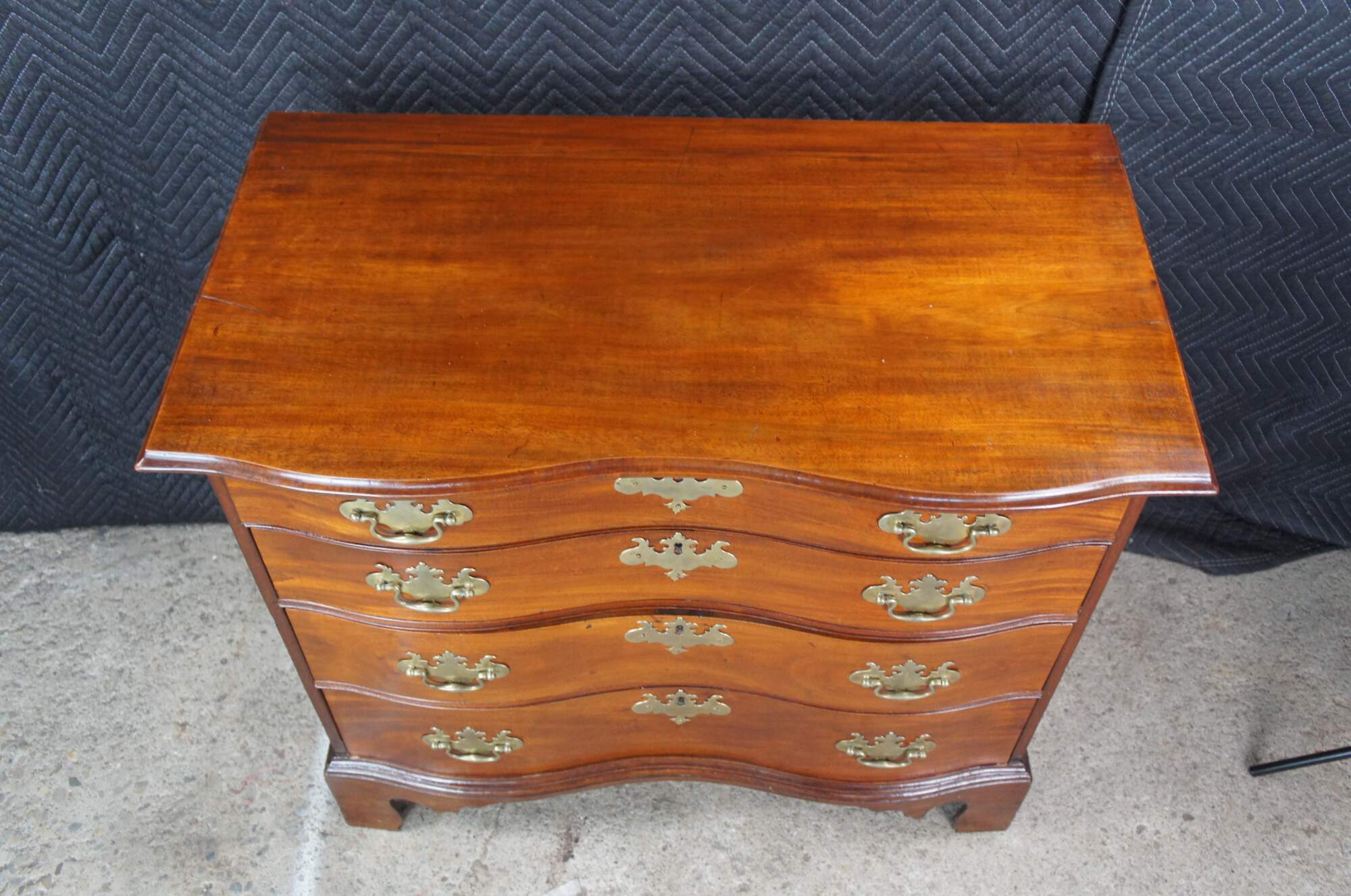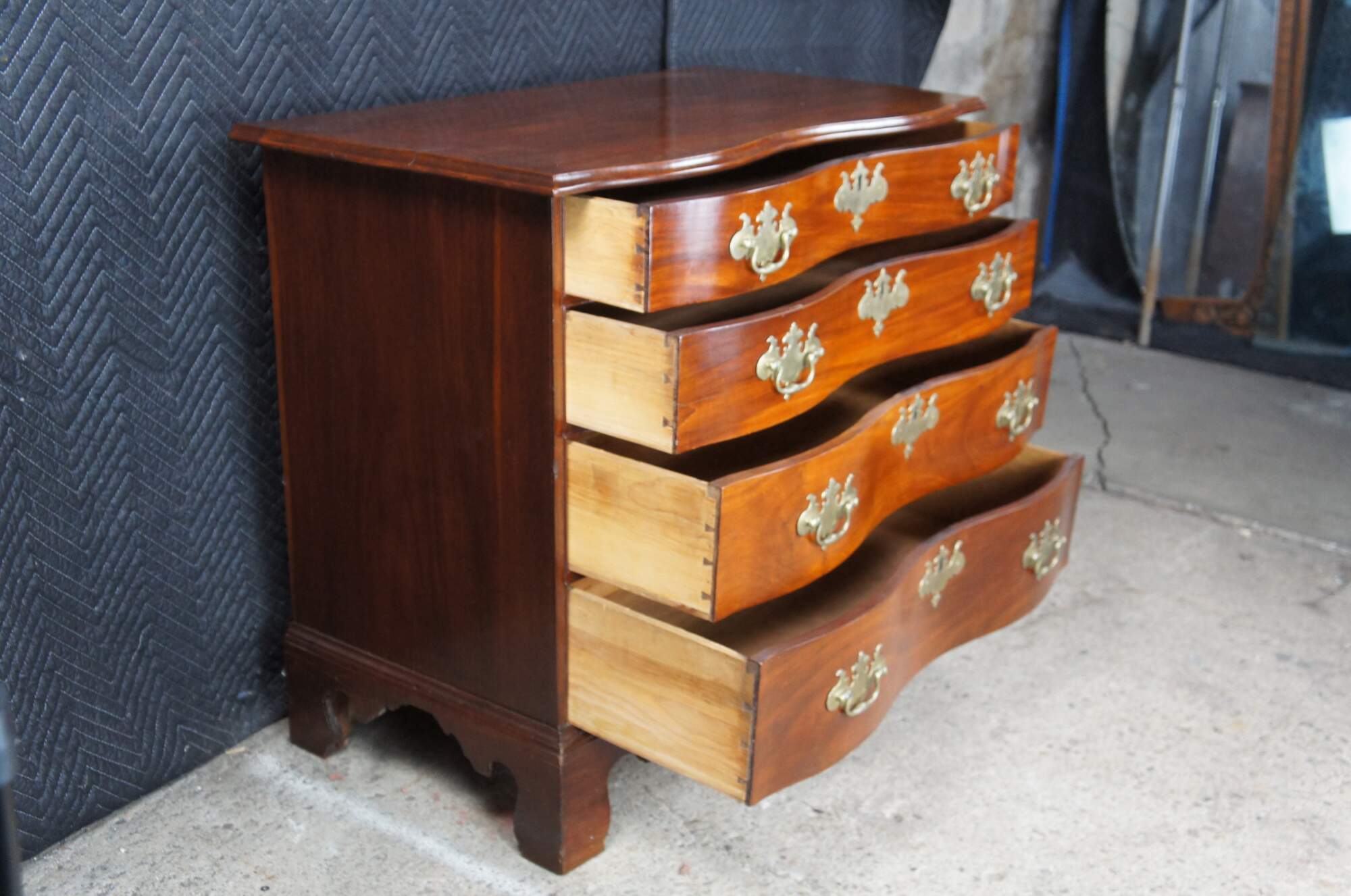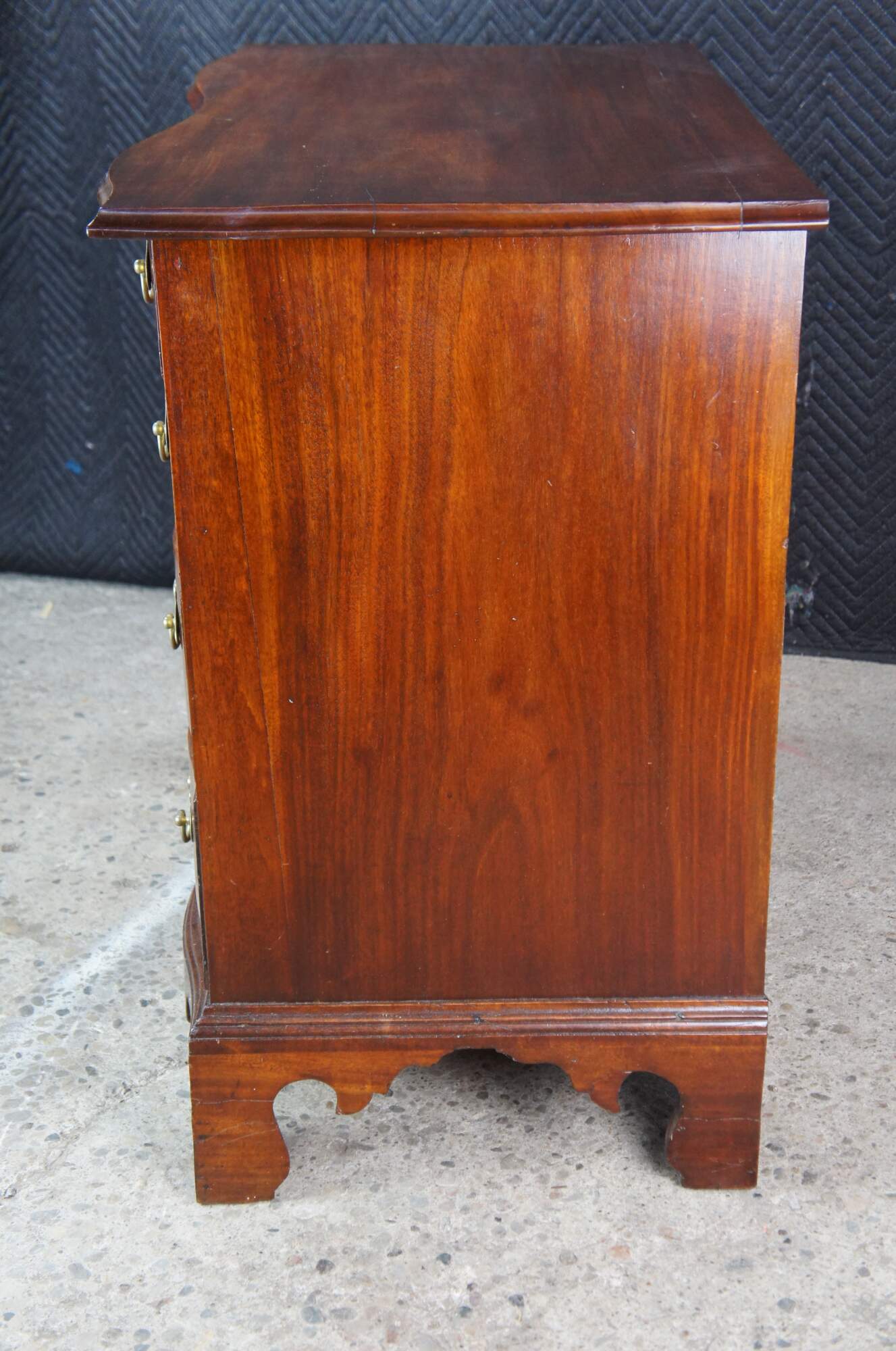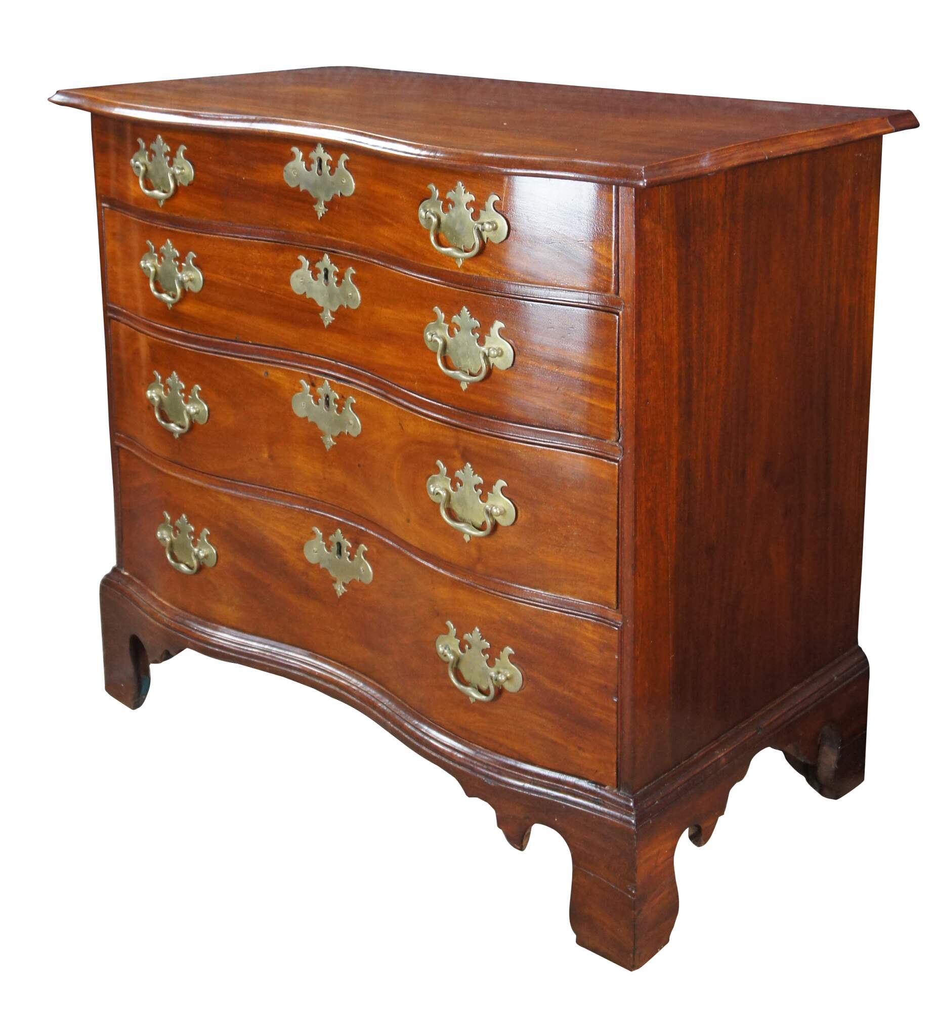 An American Chippendale Beachelor's Chest or Dresser. Made from mahogany with a rectangular serpentine fronted case with four hand dovetailed drawers and solid brass batwing hardware. The case is supported by ogee bracket feet.