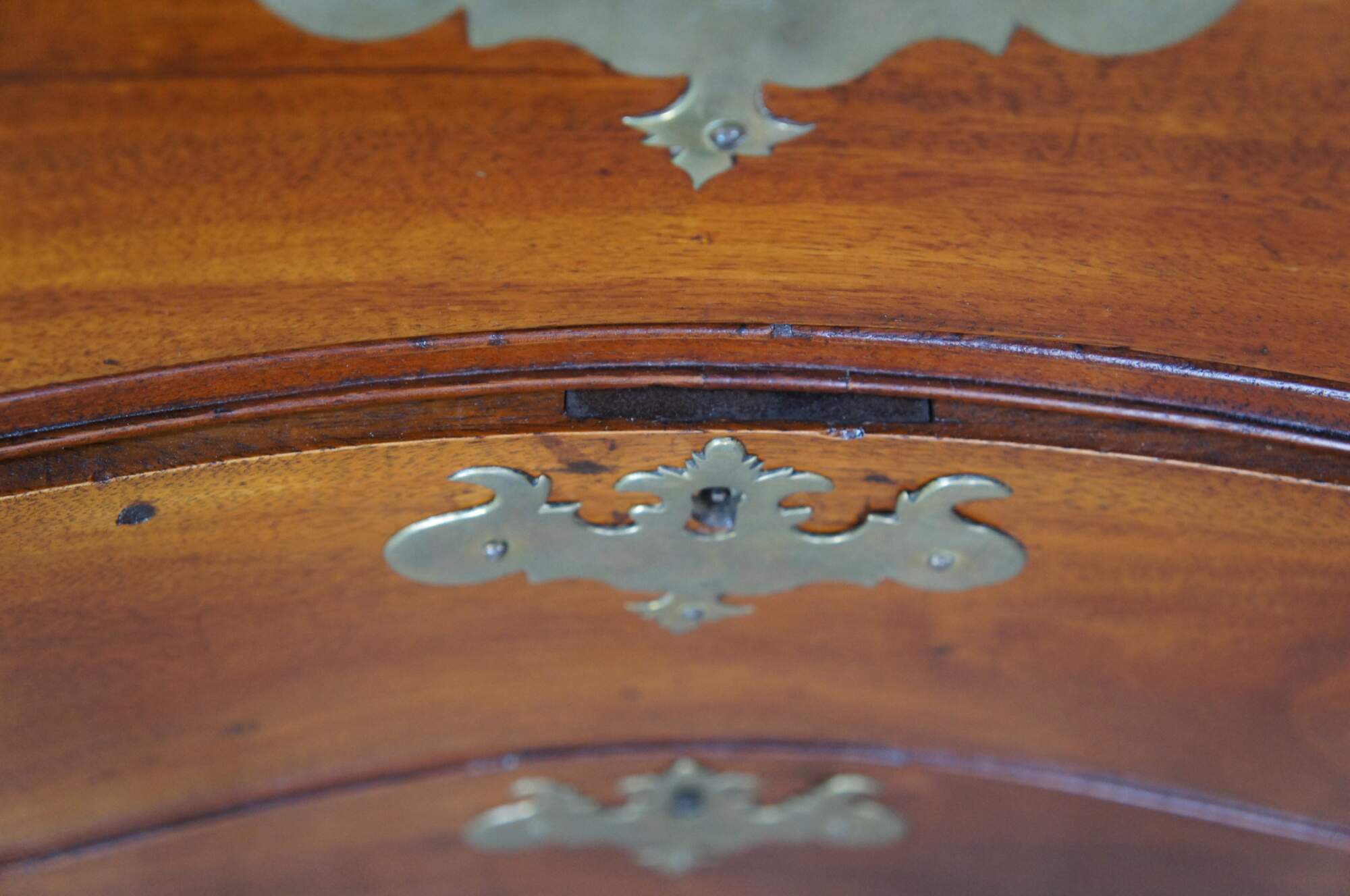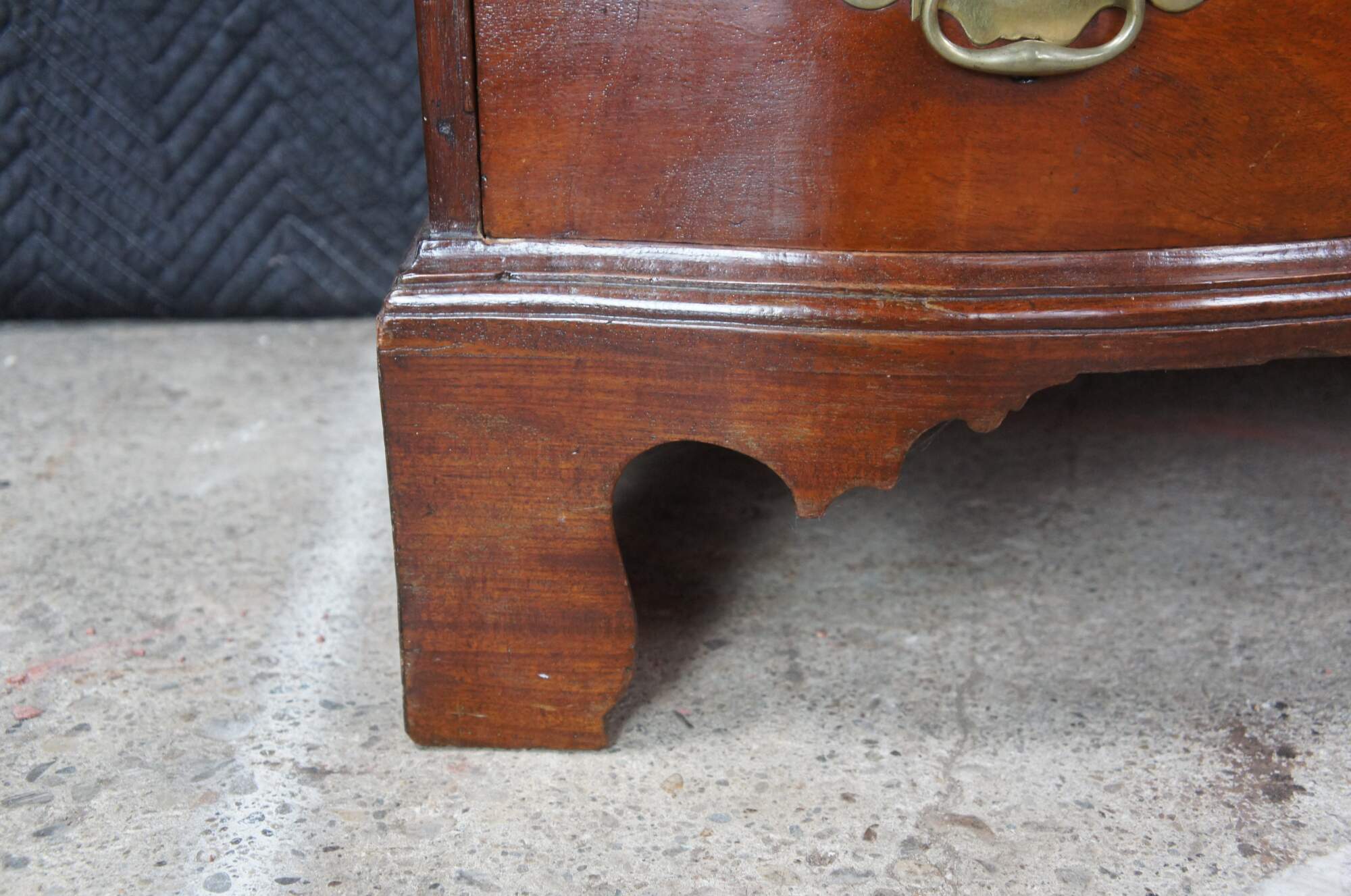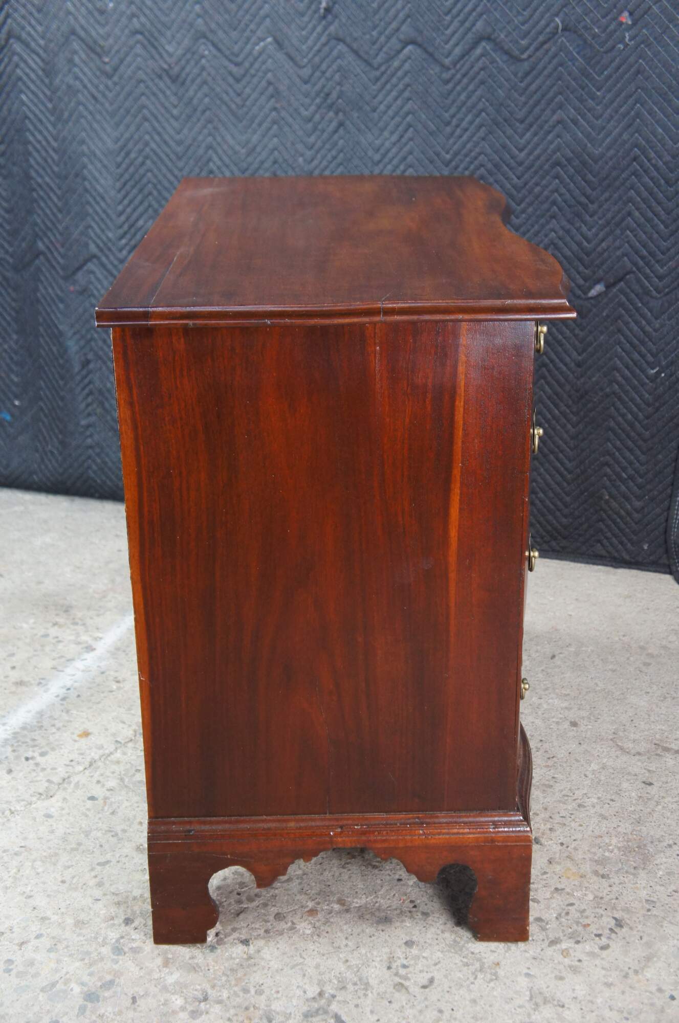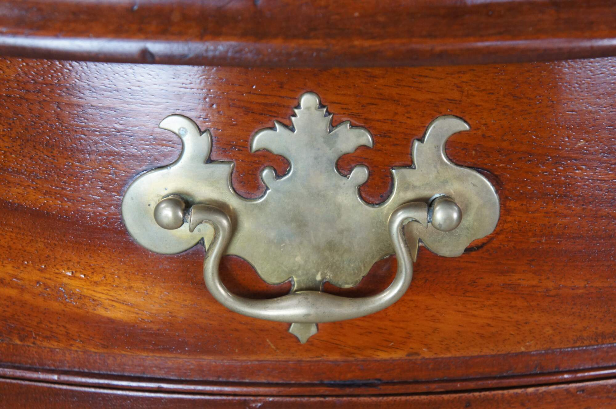 An American Chippendale Beachelor's Chest or Dresser. Made from mahogany with a rectangular serpentine fronted case with four hand dovetailed drawers and solid brass batwing hardware. The case is supported by ogee bracket feet.