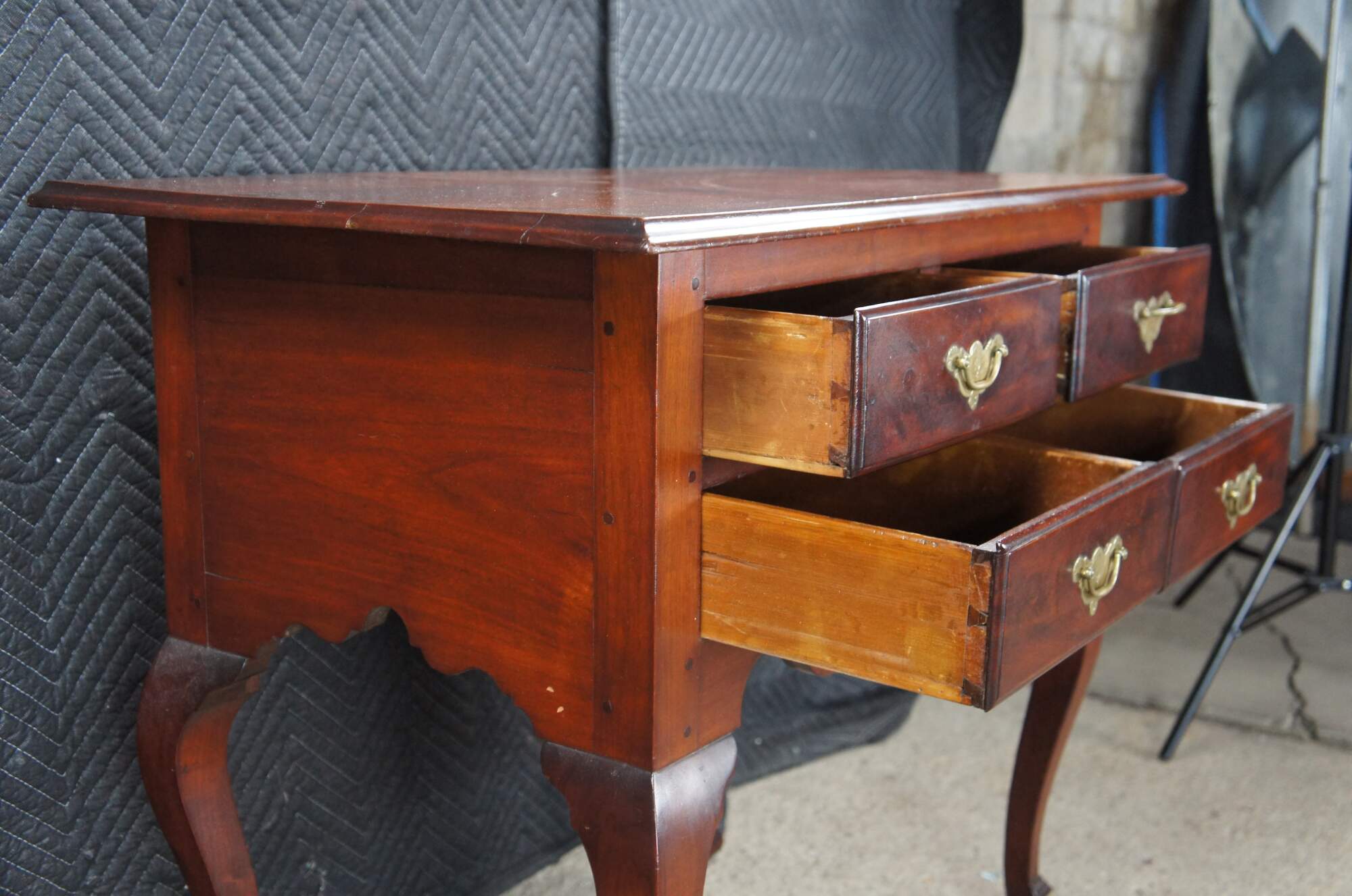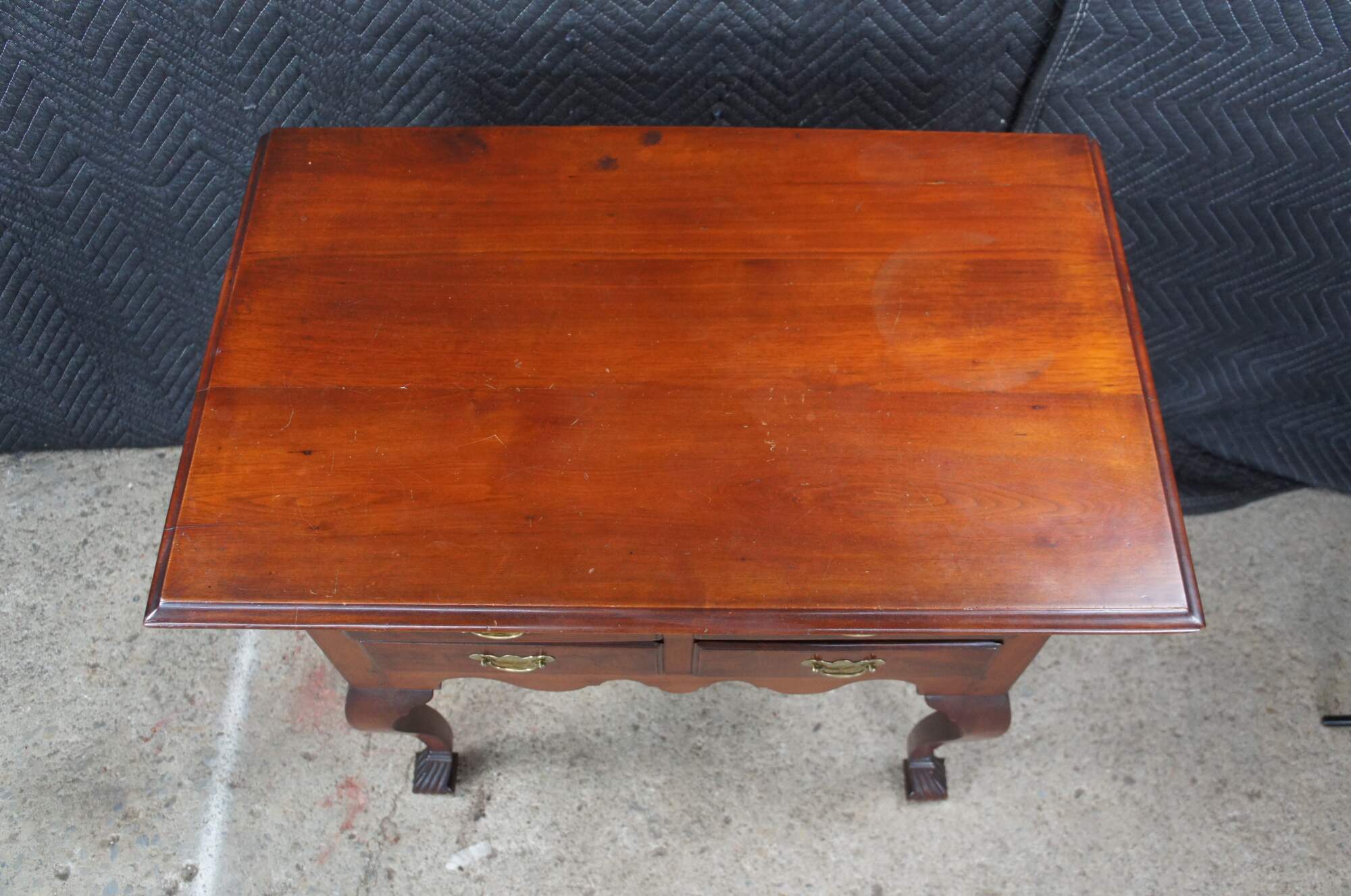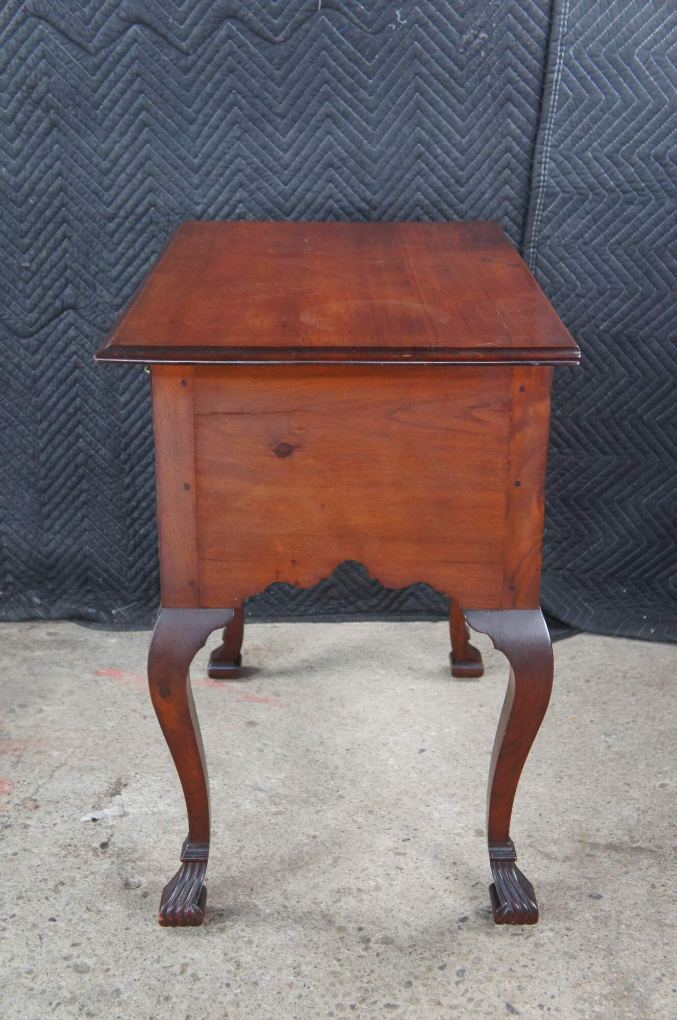 Late 18th to Early 19th Century American Queen Anne Lowboy. A compact case with generous proportions accented by an overhanging top with molded edge. The case is fitted with four quaint hand dovetailed drawers with brass bale hardware. Cabriole legs are flanked by a serpentine apron and fitted with beautiful Spanish feet. The case is constructed via mortise and tenon joinery. A remarkable furnishing that has stood the test of time.