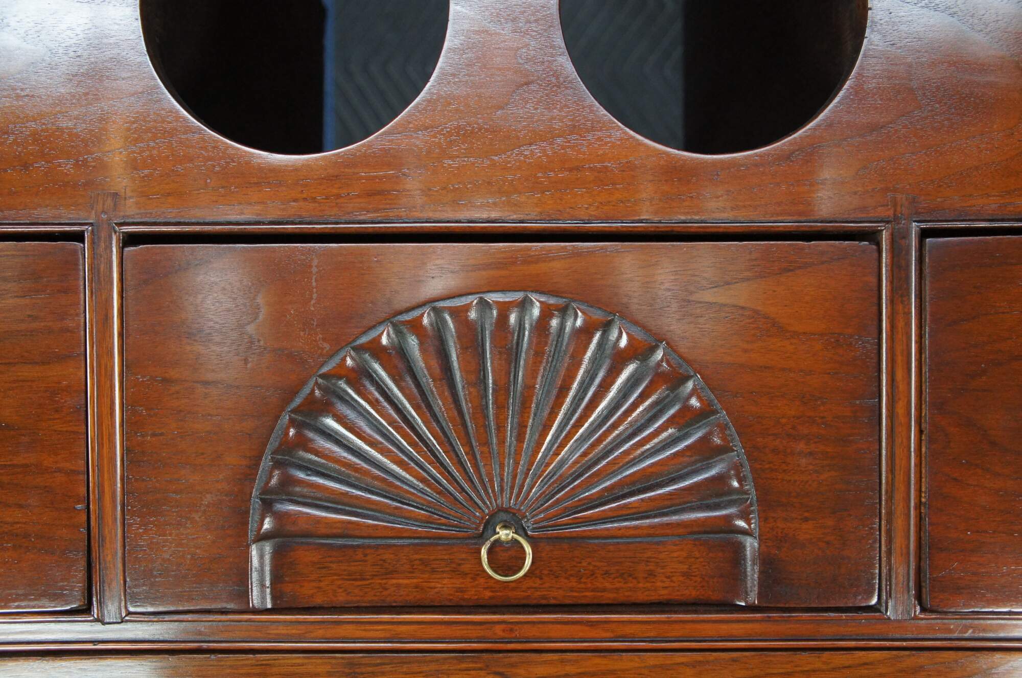 Mid 18th Century American Queen Anne Bonnet Top Boston Highboy. Features a cherry case with molded swans neck pediment centering flame finials above a case with three short drawers, the center showcasing fan carving over four graduated drawers. The lower part of the case has mid molding above a long slender drawer above three more short drawers with the centermost being fan carved. The lower apron is shaped with two down finials set between long slender cabriole legs with pad feet. The case and drawers are constructed via mortise and tenon and dovetailed joinery. Drawers have solid brass batwing drawer plates with bale hardware and matching escutcheon plates.