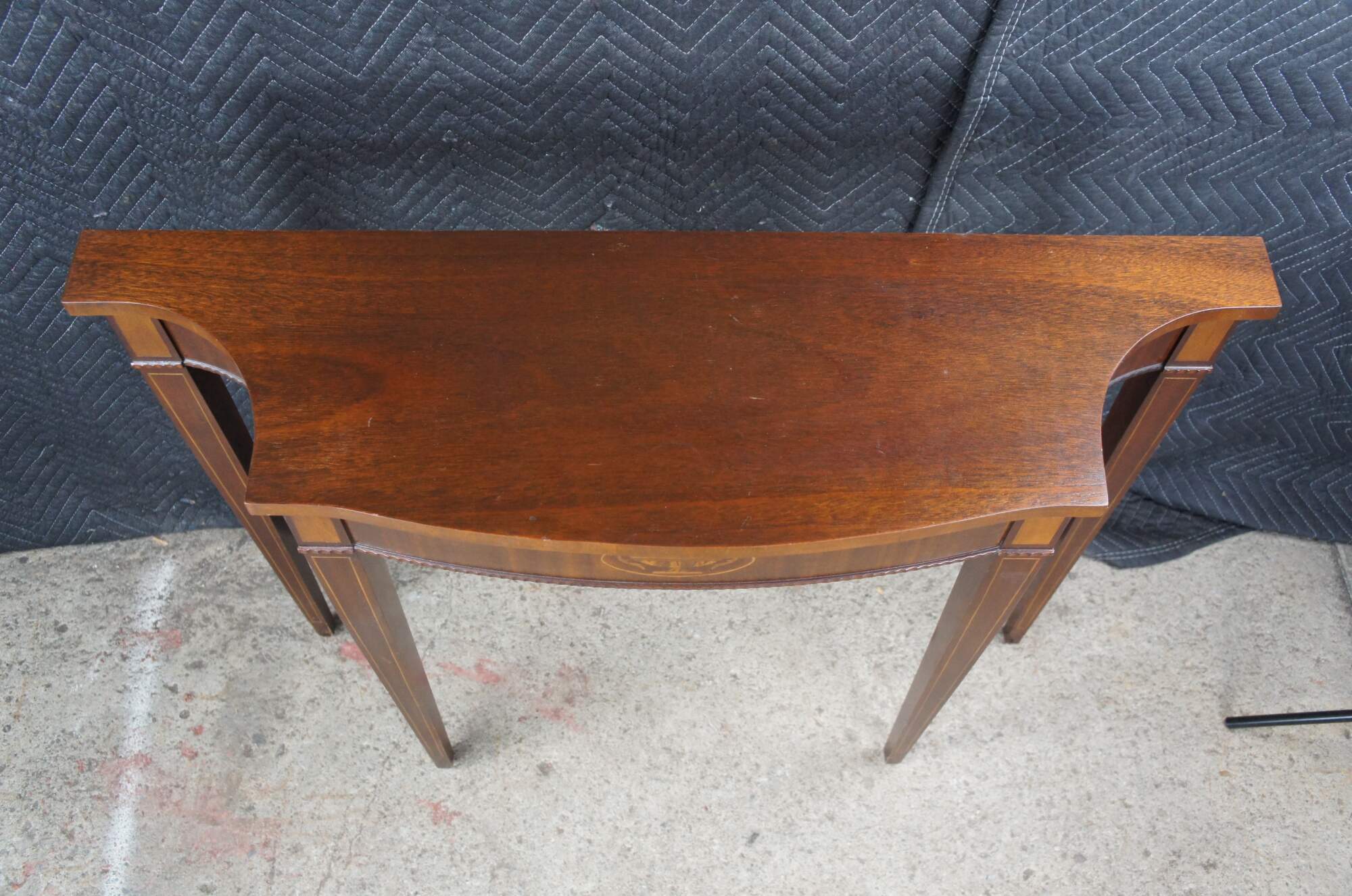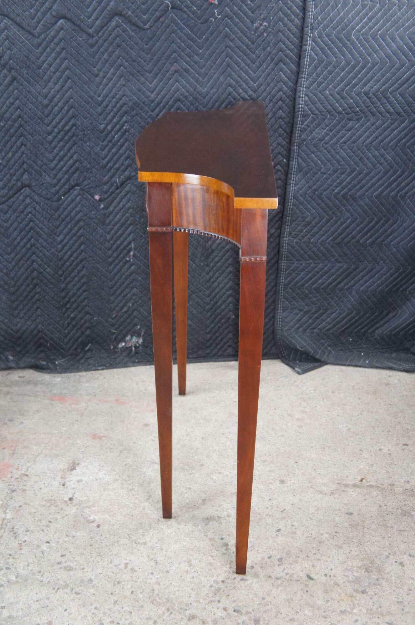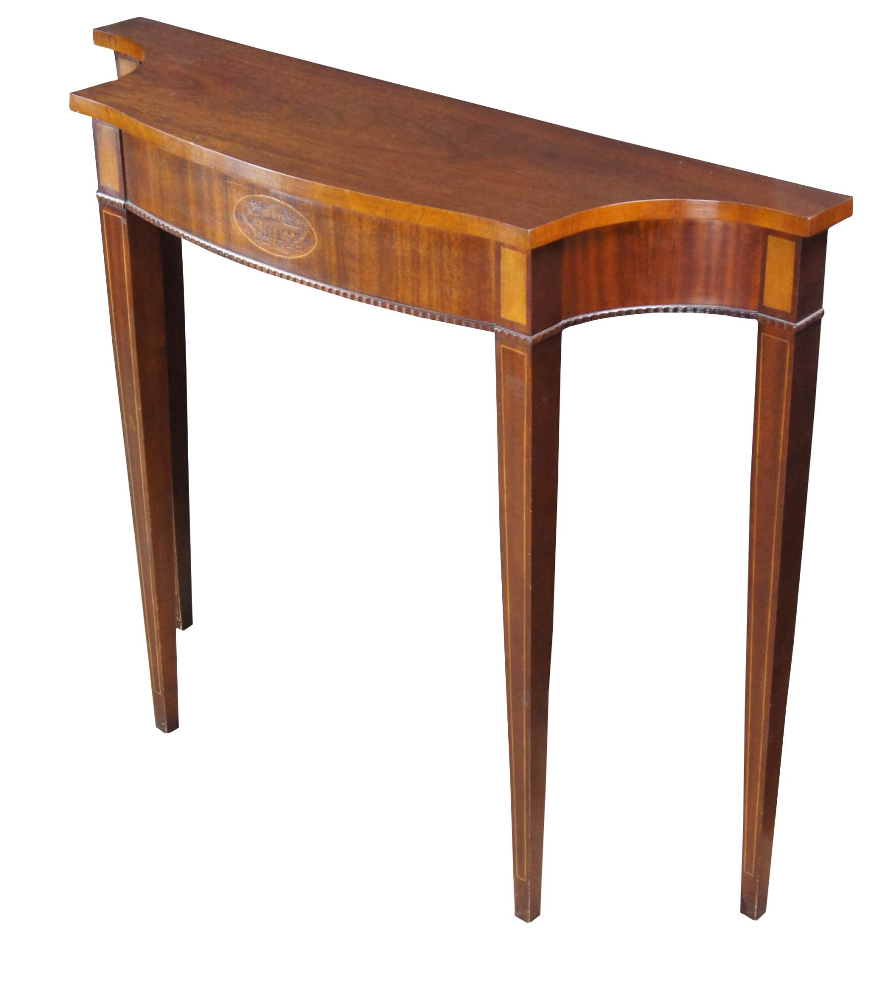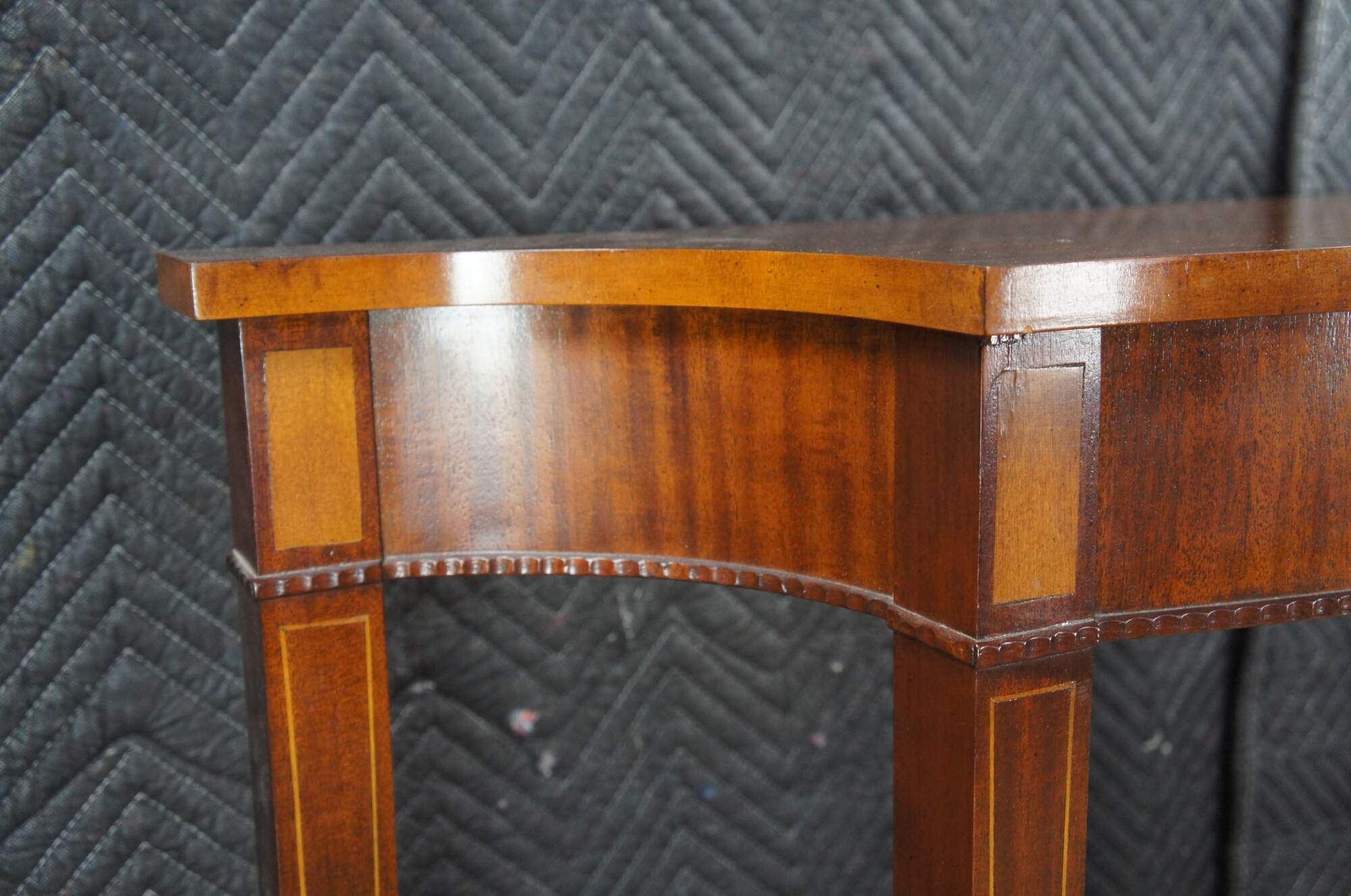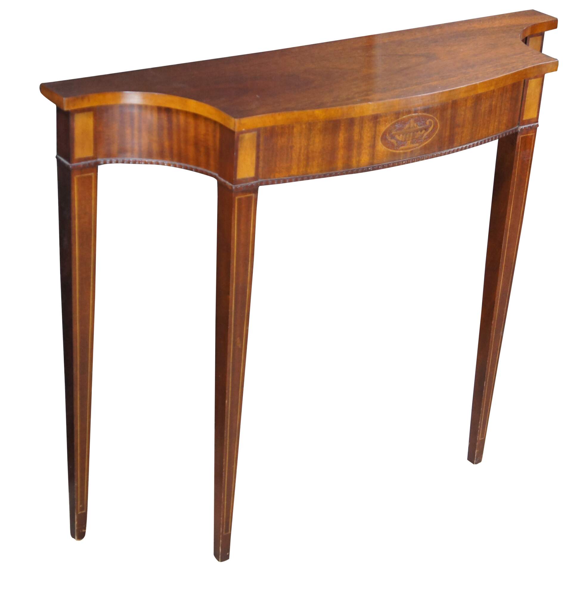 1970s American Federal Style Demilune Console Table, attributed to Councill Furniture. Features a shapely mahogany frame with concave corners centered by a marquetry inlaid urn, sawtooth beaded edge and square tapered inlaid legs.