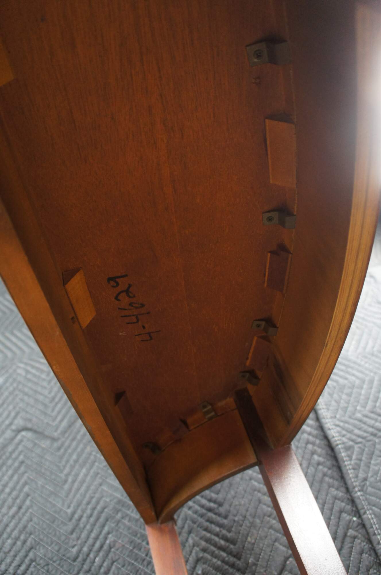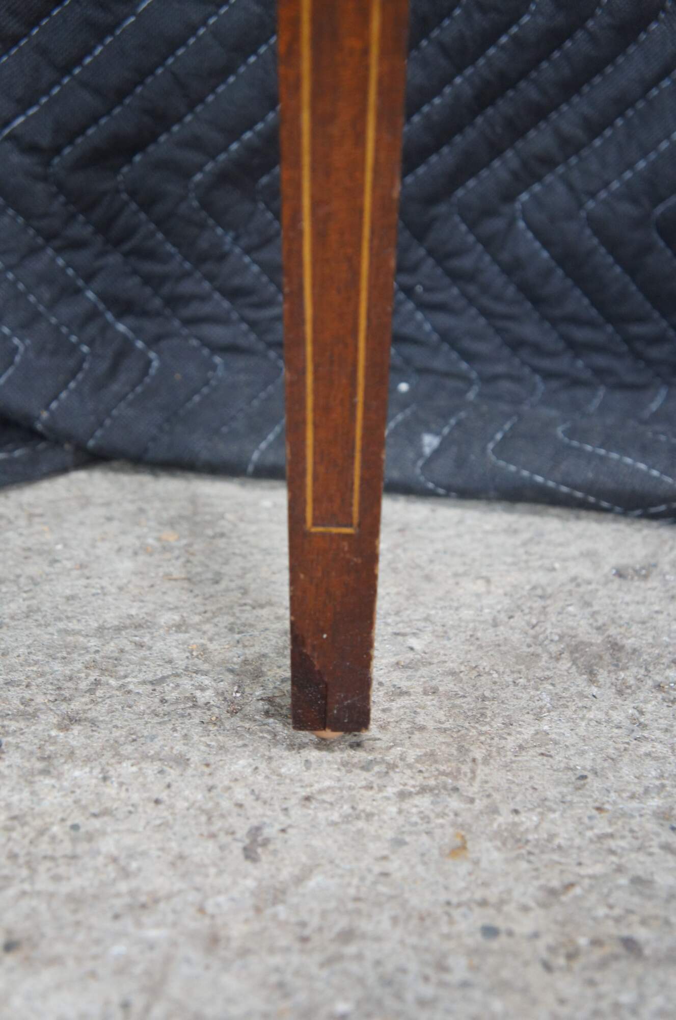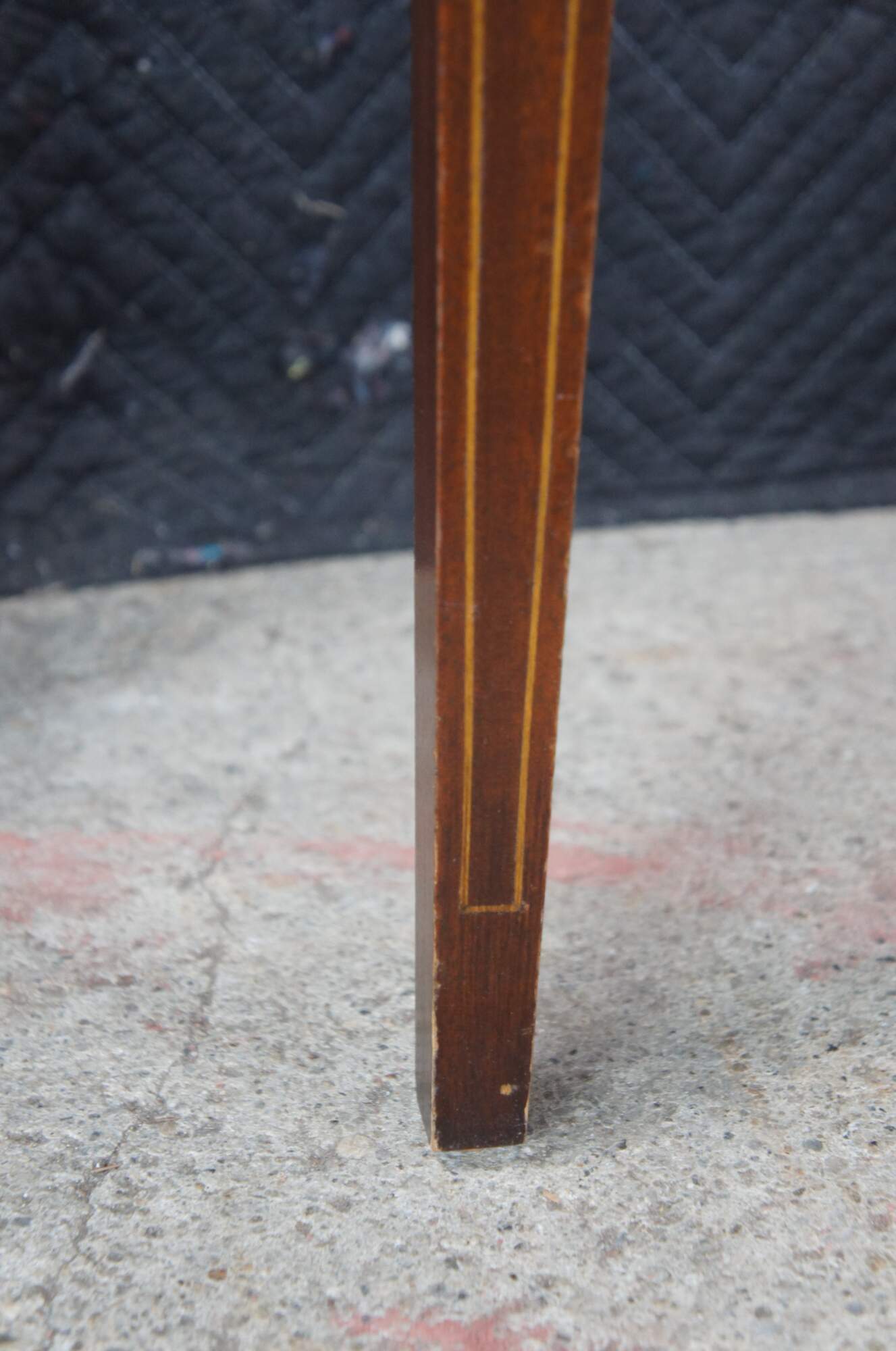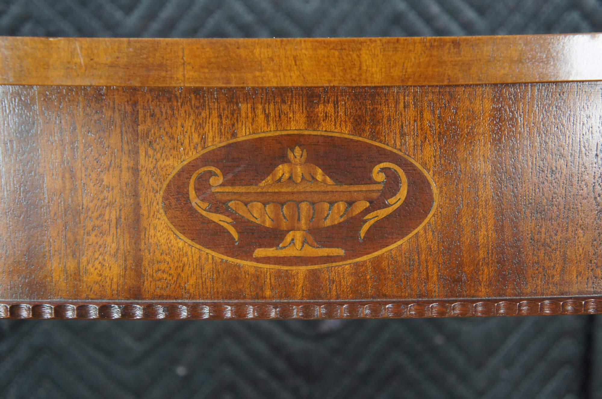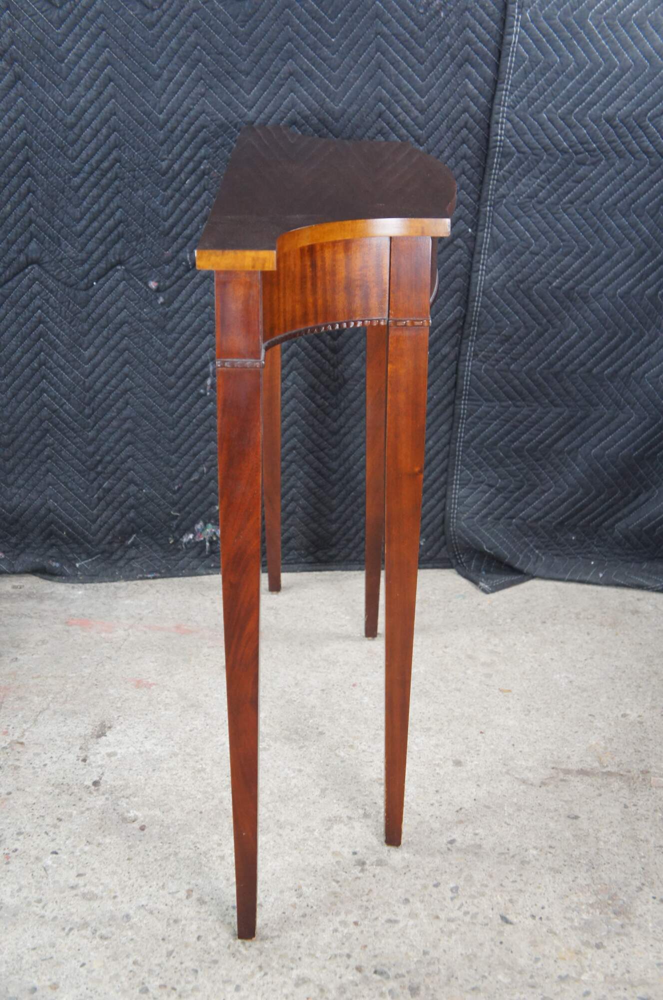 1970s American Federal Style Demilune Console Table, attributed to Councill Furniture. Features a shapely mahogany frame with concave corners centered by a marquetry inlaid urn, sawtooth beaded edge and square tapered inlaid legs.