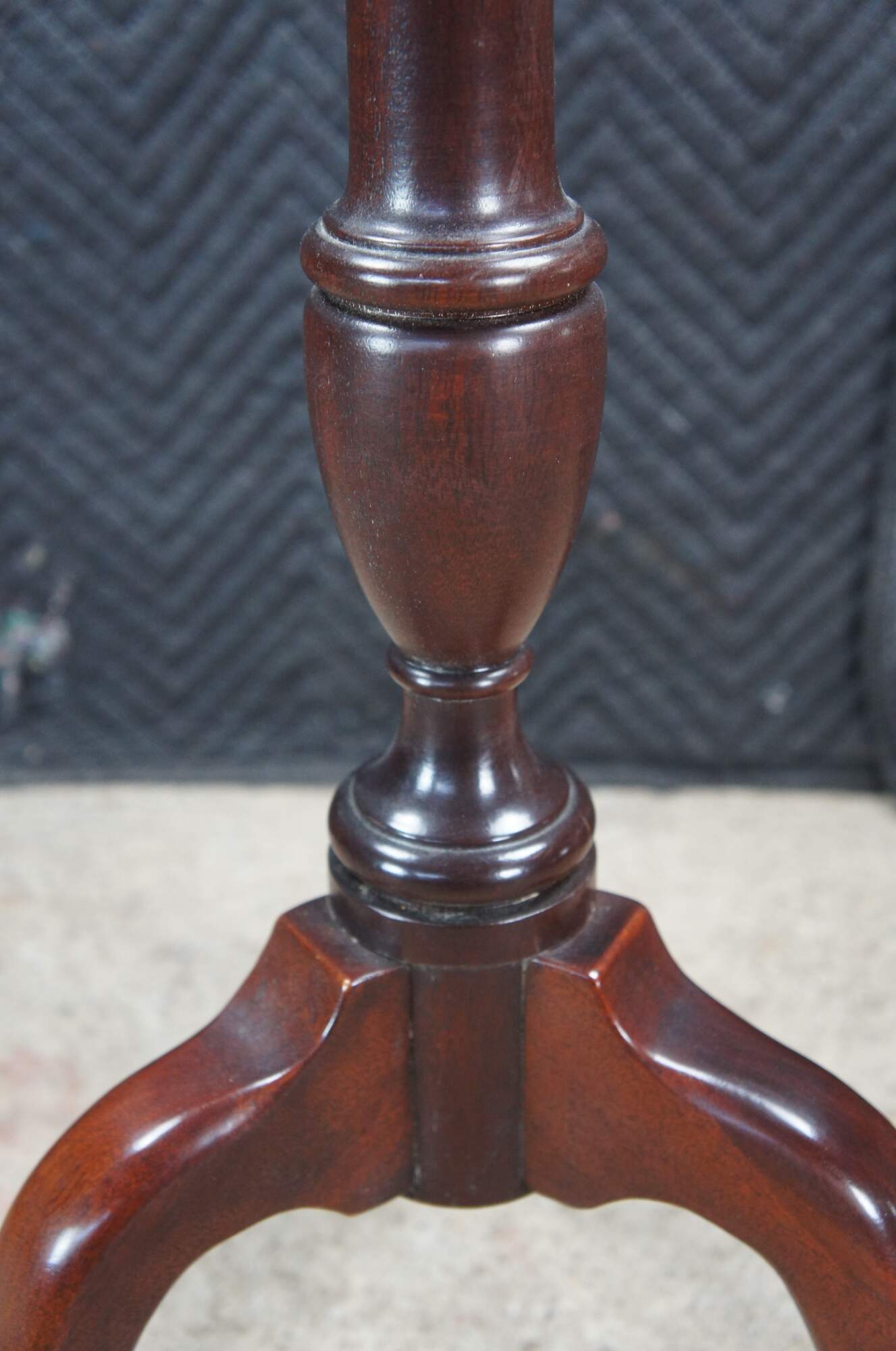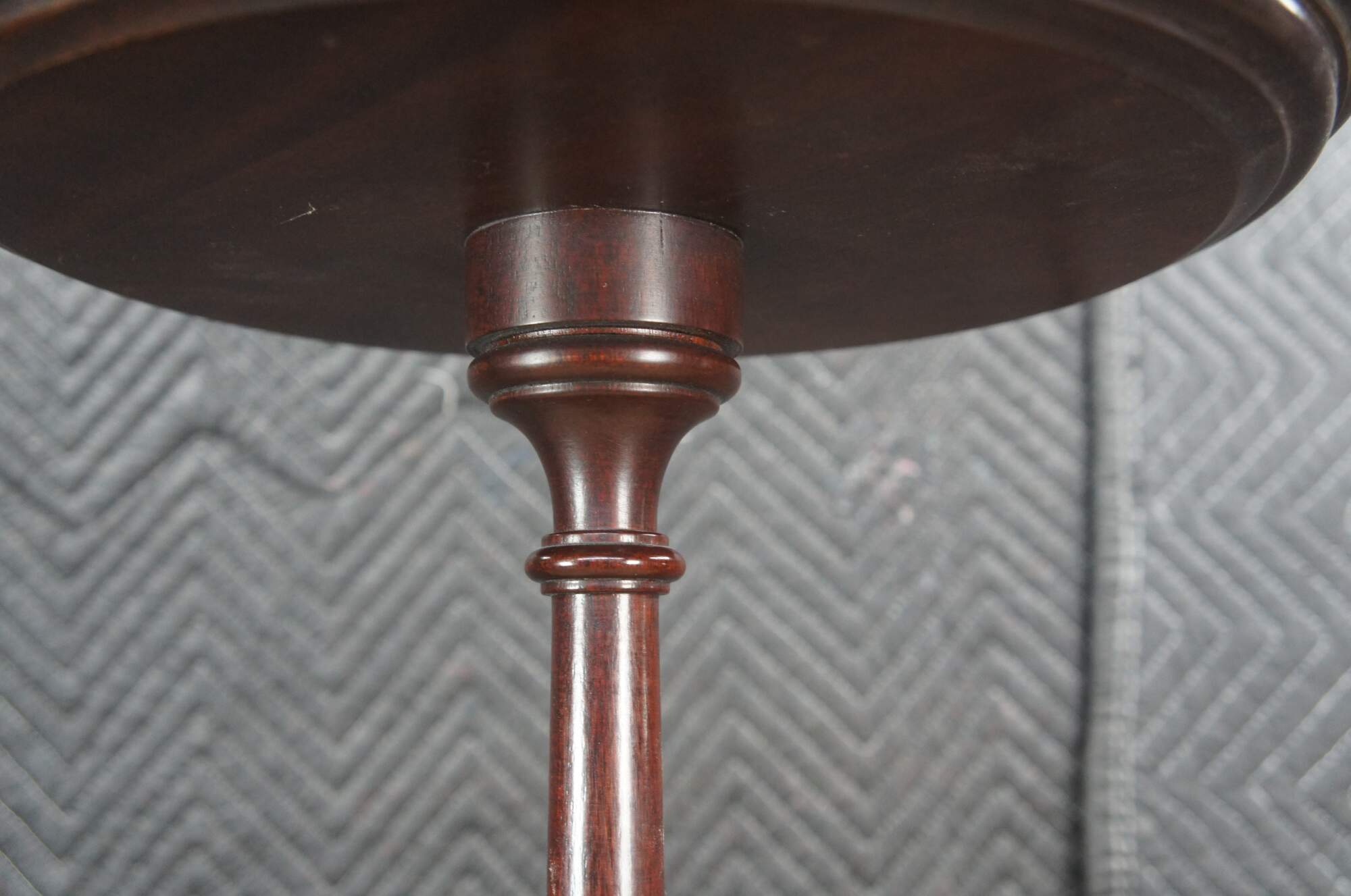 1980s Queen Anne style mahogany candlestand. Features a circular top with pierced brass gallery over a slender turned support terminating into a tripod base with cabriole legs and pad feet.