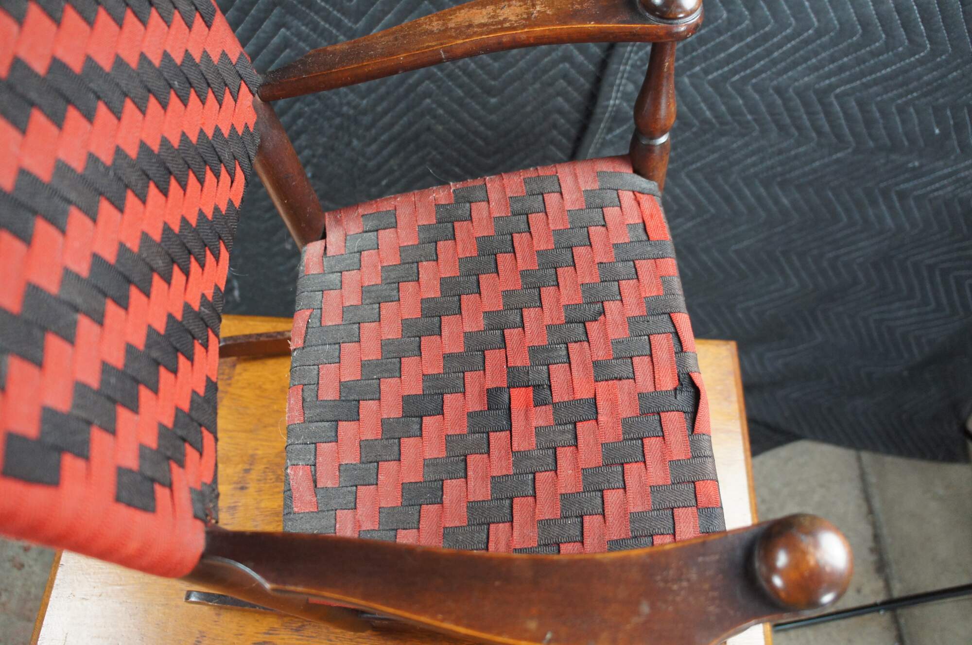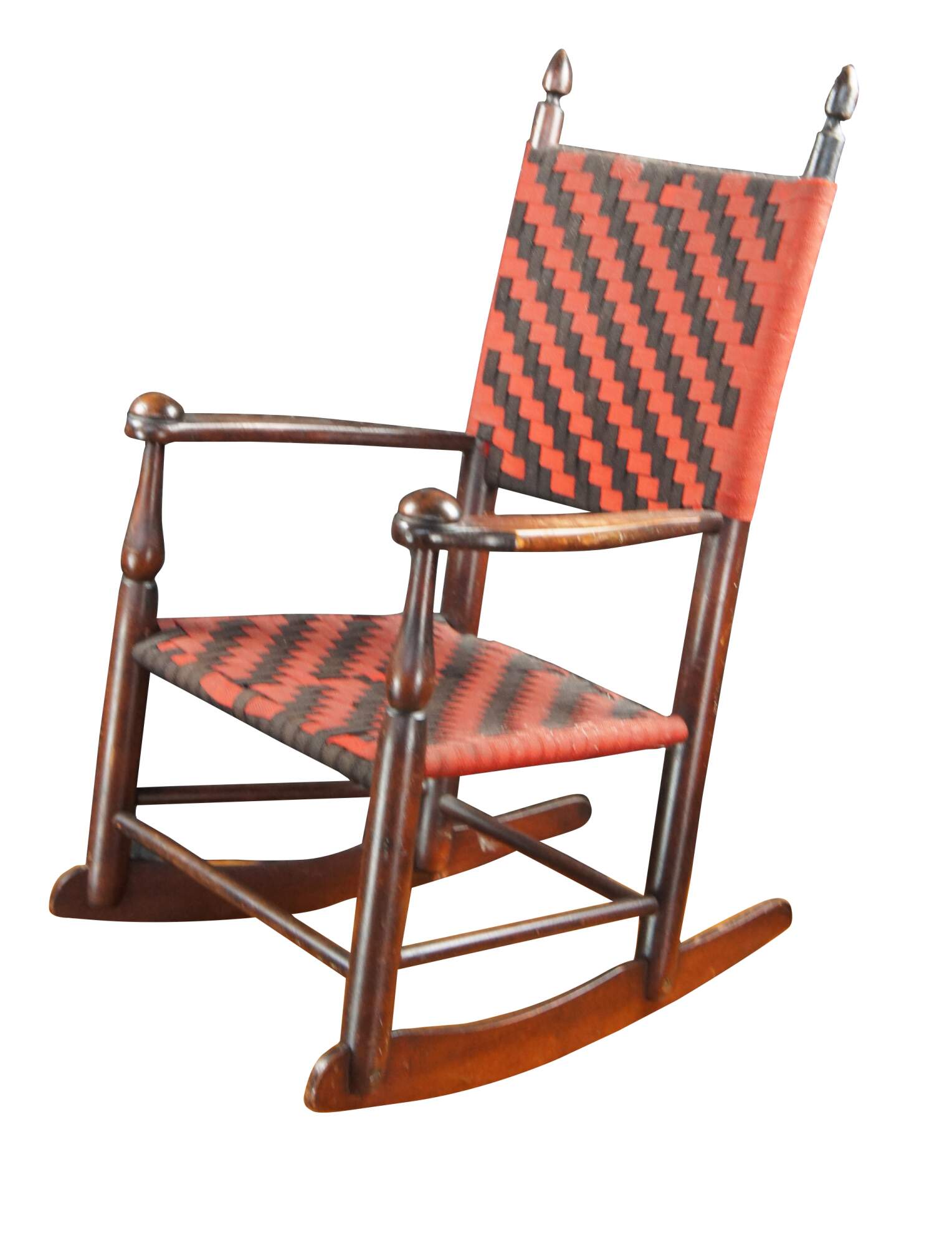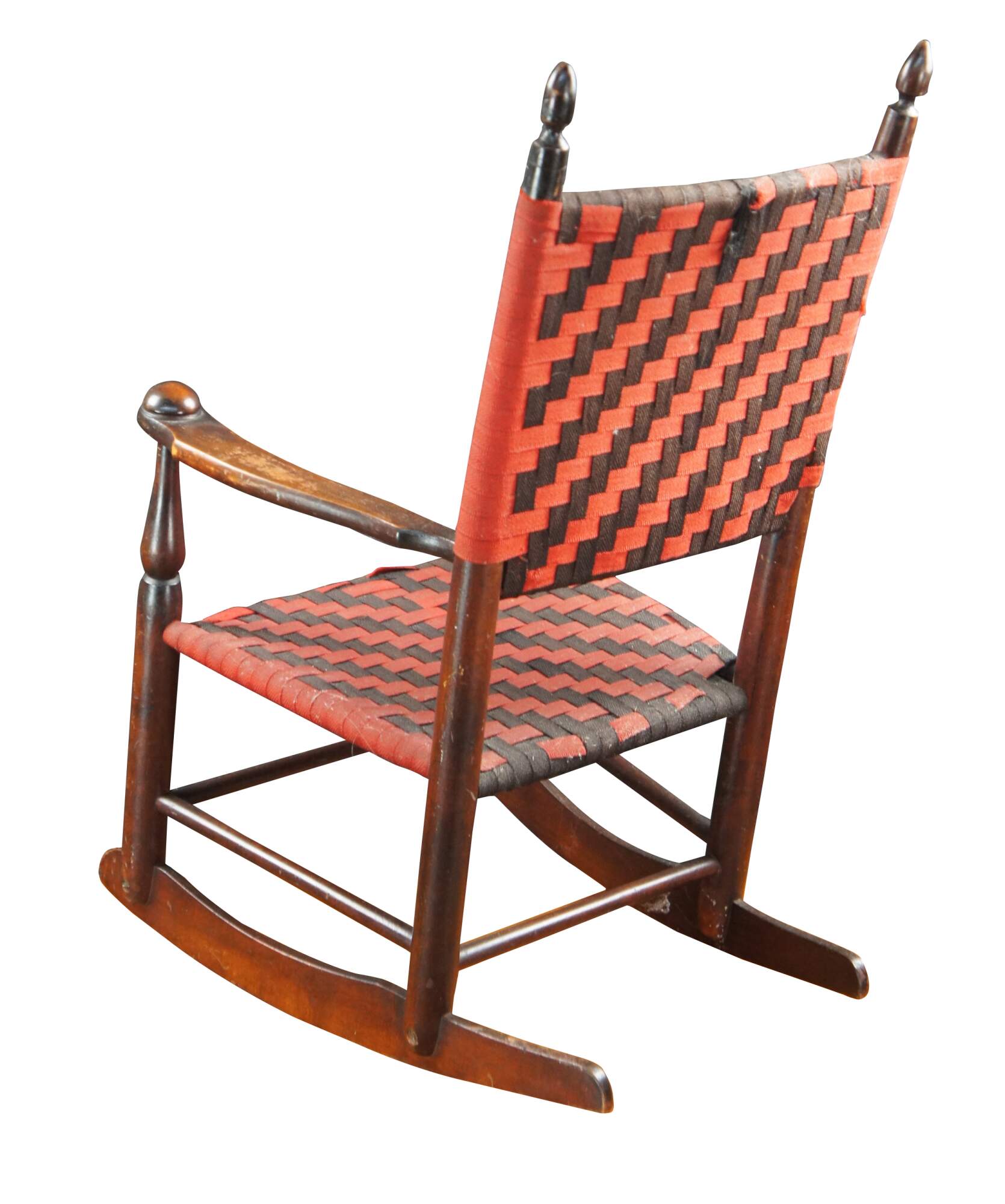This beautiful example is made from maple with acorn shaped finials over a woven back and seat. The arms are mushroom capped over a vase shaped turning leading to lower spindled stretchers and rockers. Original makers mark along the back inner support of the chair.