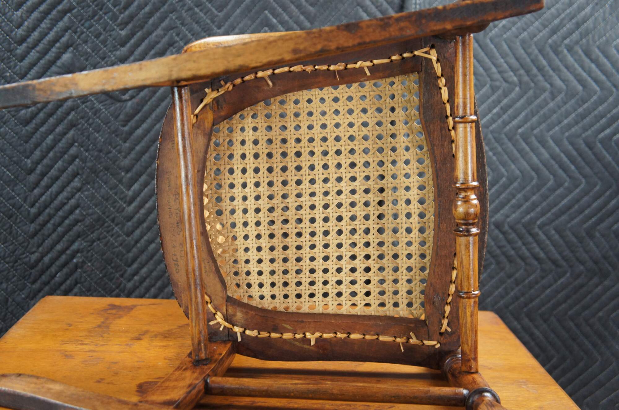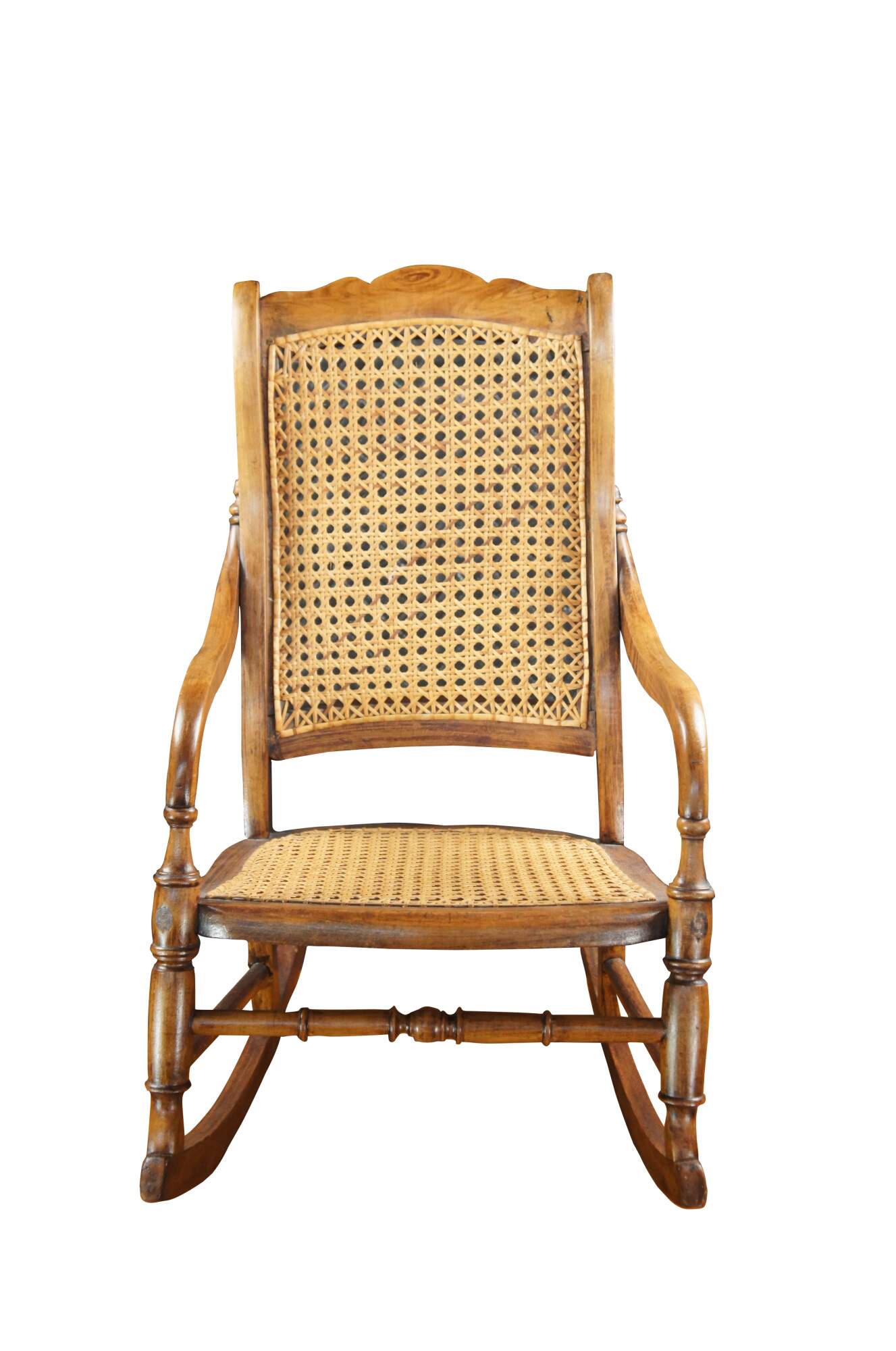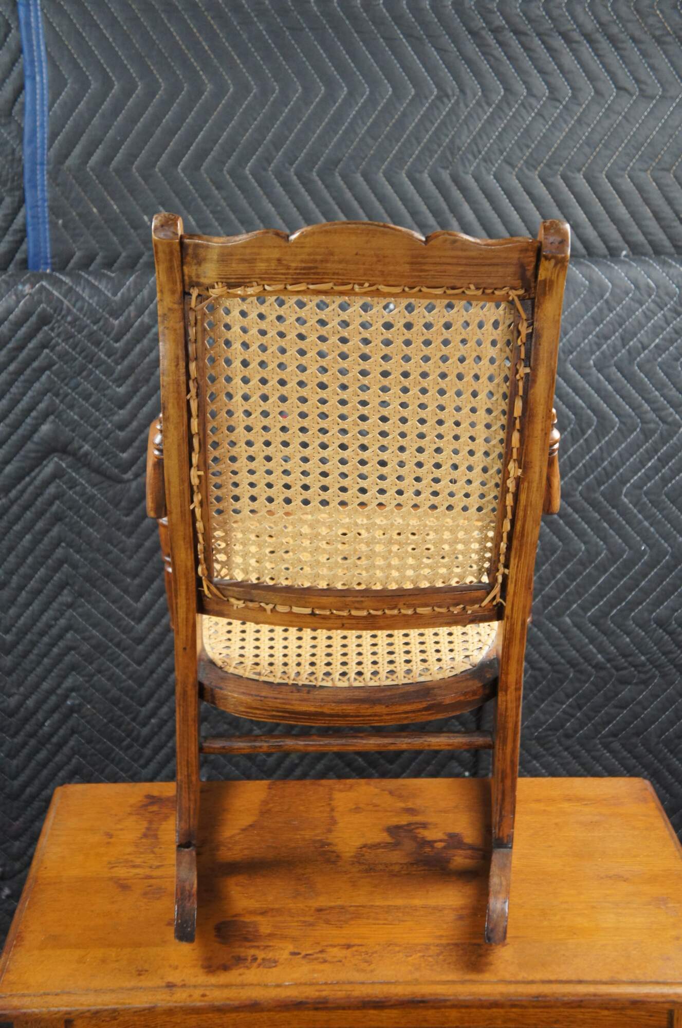 Victorian Childs Rocking Chair, circa 1890s. Features a serpentine crest rail over contoured caned back with downswept arms leading to a caned seat and ring turned front supports connected by spindles over the rocker rails. Arms feature a fun quarter cut spindled accent where they meet the chair back. The underside of the seat is labeled From Anna 46 Years Old Thanksgiving Nov. 1920.