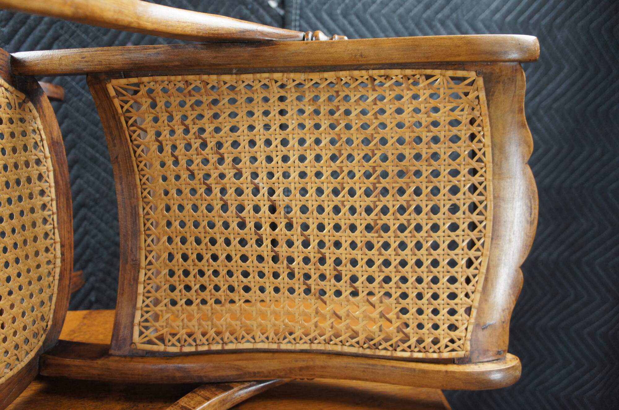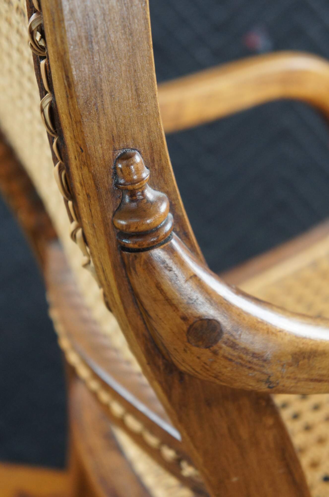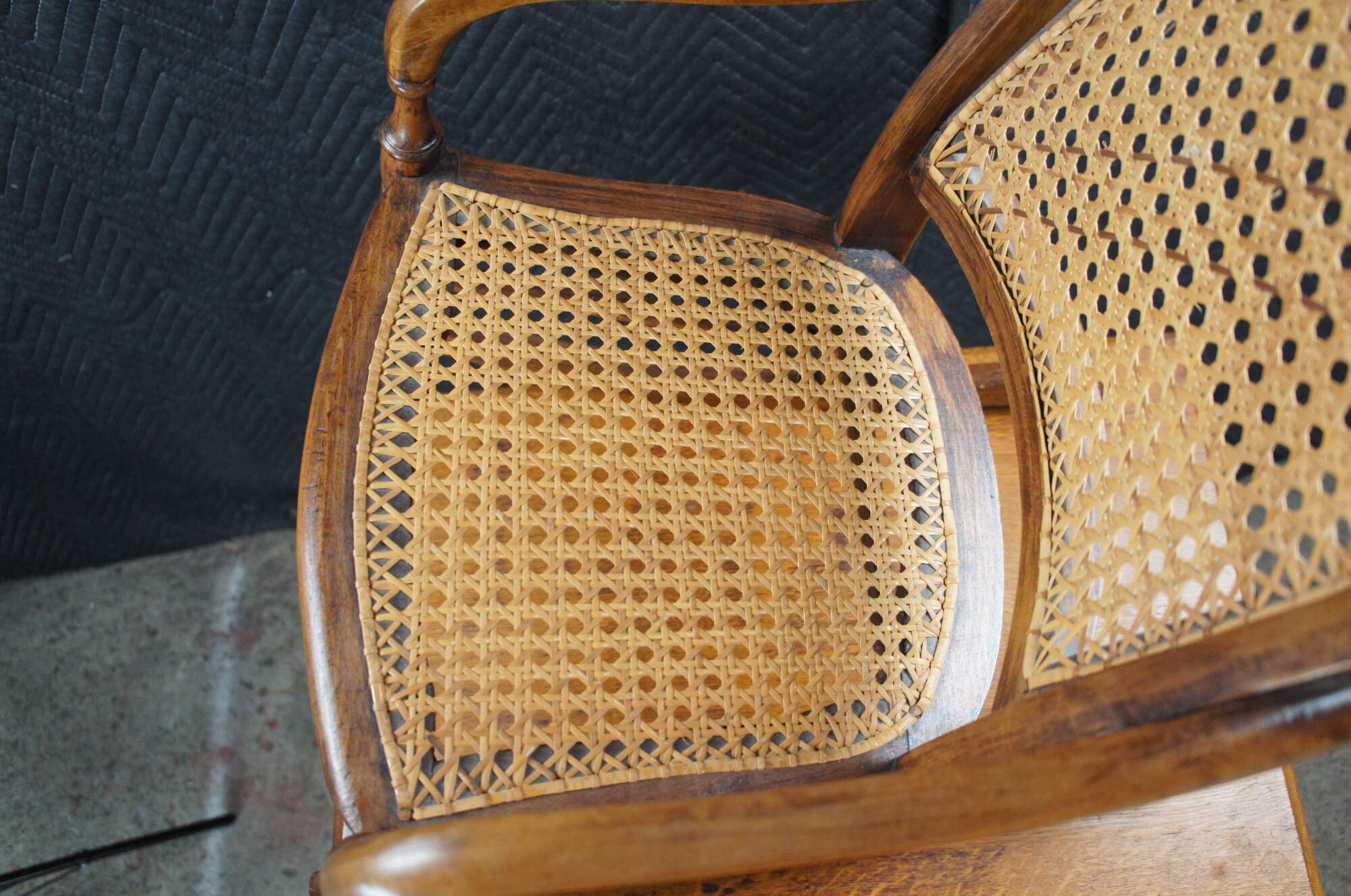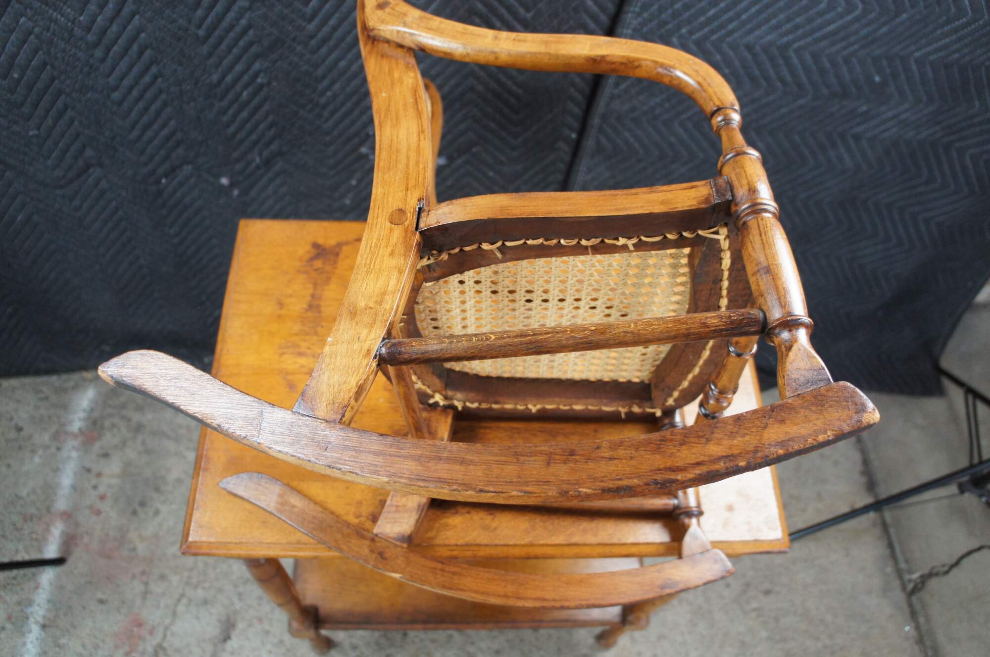 Victorian Childs Rocking Chair, circa 1890s. Features a serpentine crest rail over contoured caned back with downswept arms leading to a caned seat and ring turned front supports connected by spindles over the rocker rails. Arms feature a fun quarter cut spindled accent where they meet the chair back. The underside of the seat is labeled From Anna 46 Years Old Thanksgiving Nov. 1920.