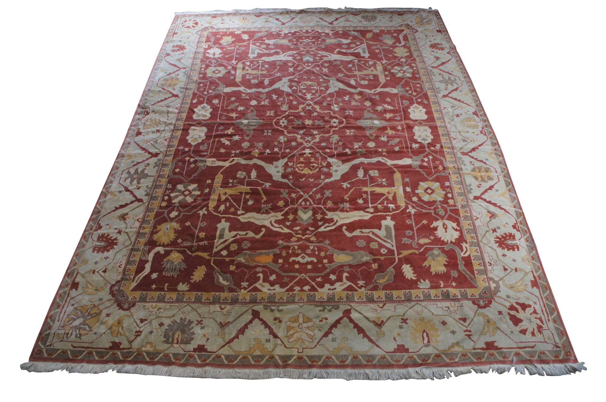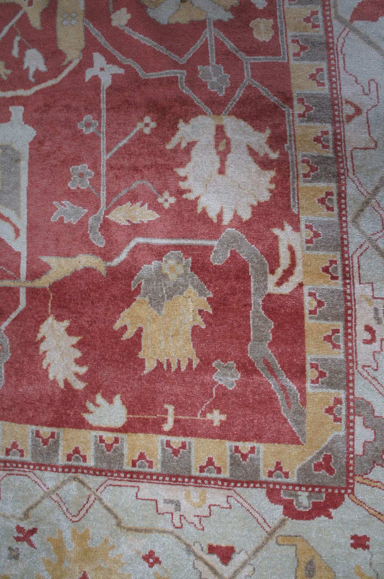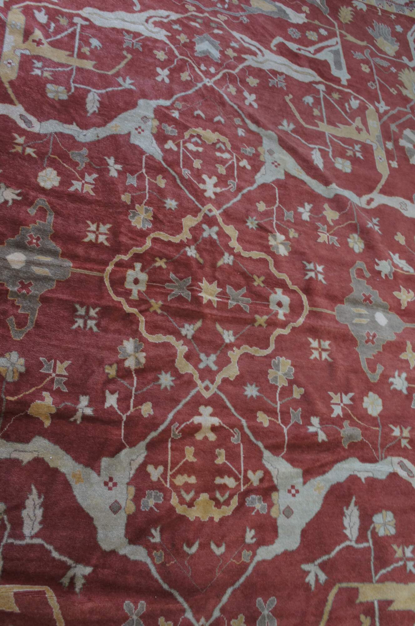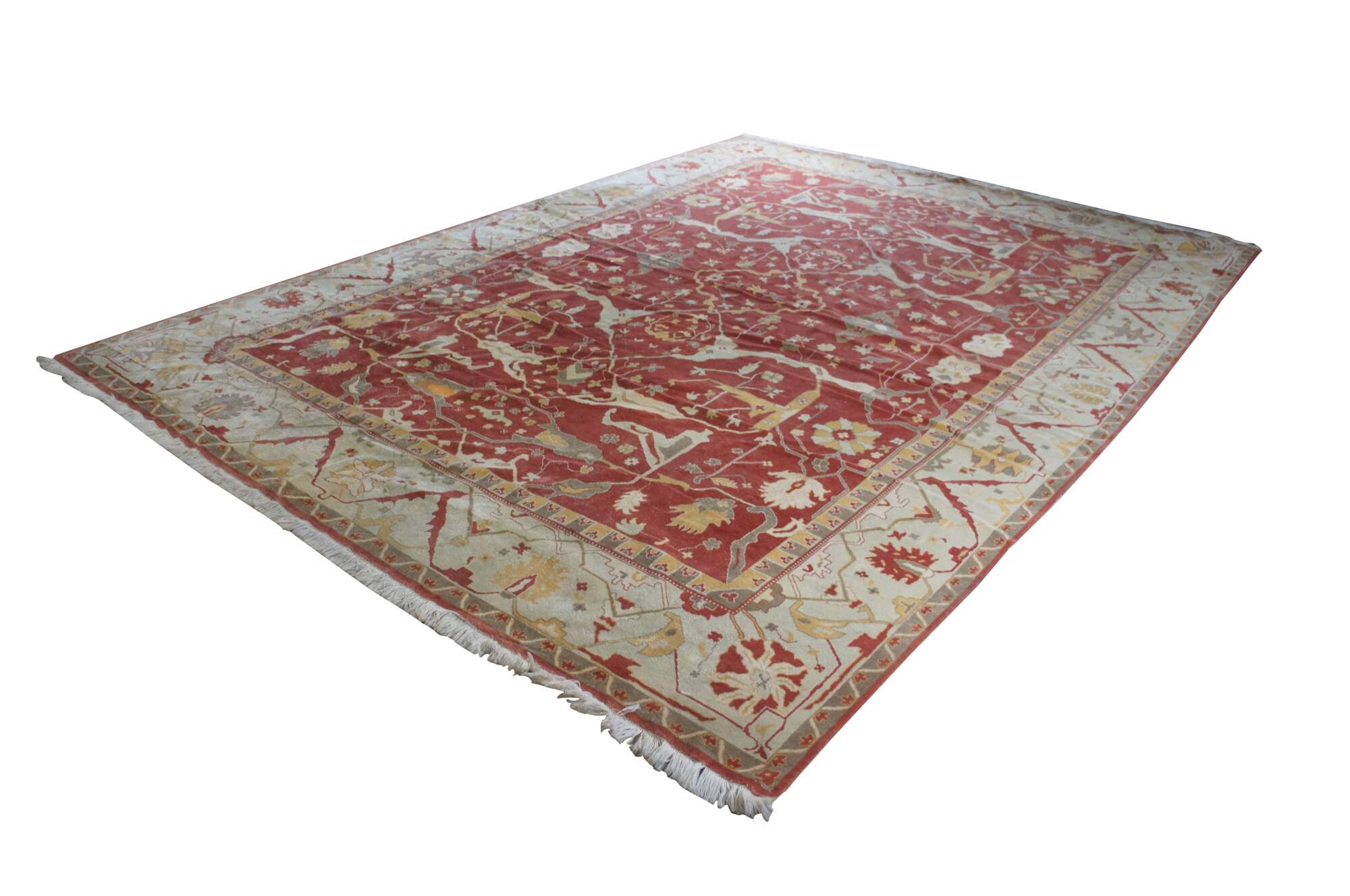 A massive late 20th century Turkish Oushak area rug. Handmade from 100% wool with beige and red pile and geometric pattern.