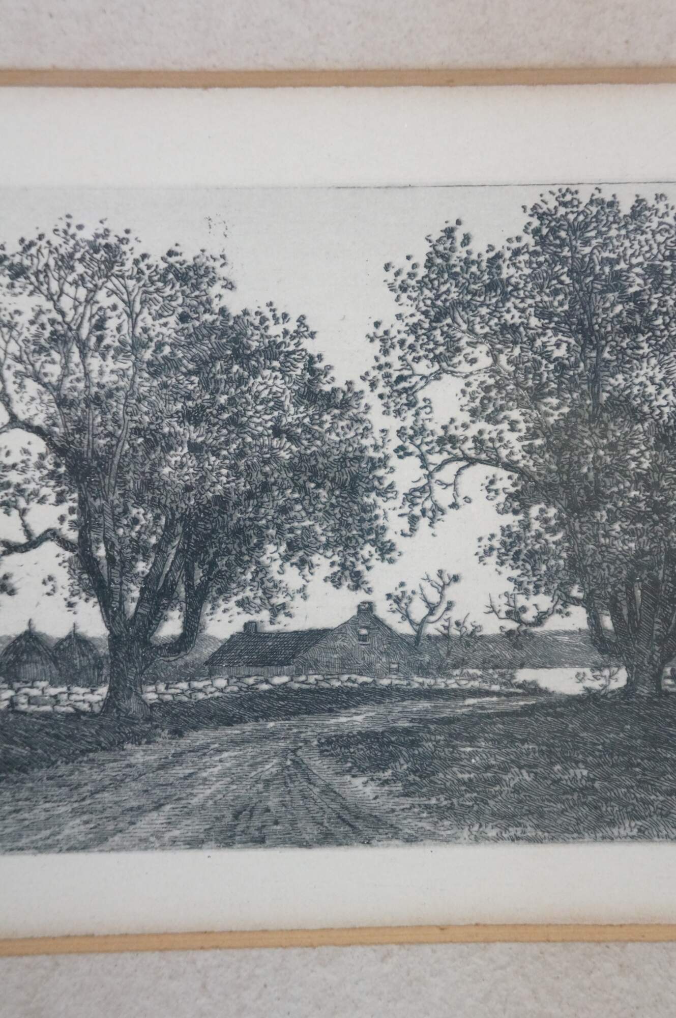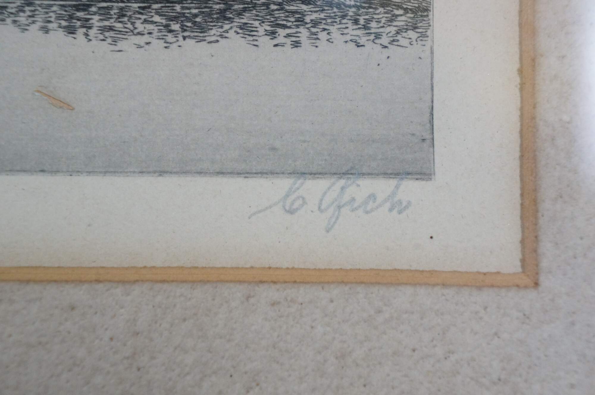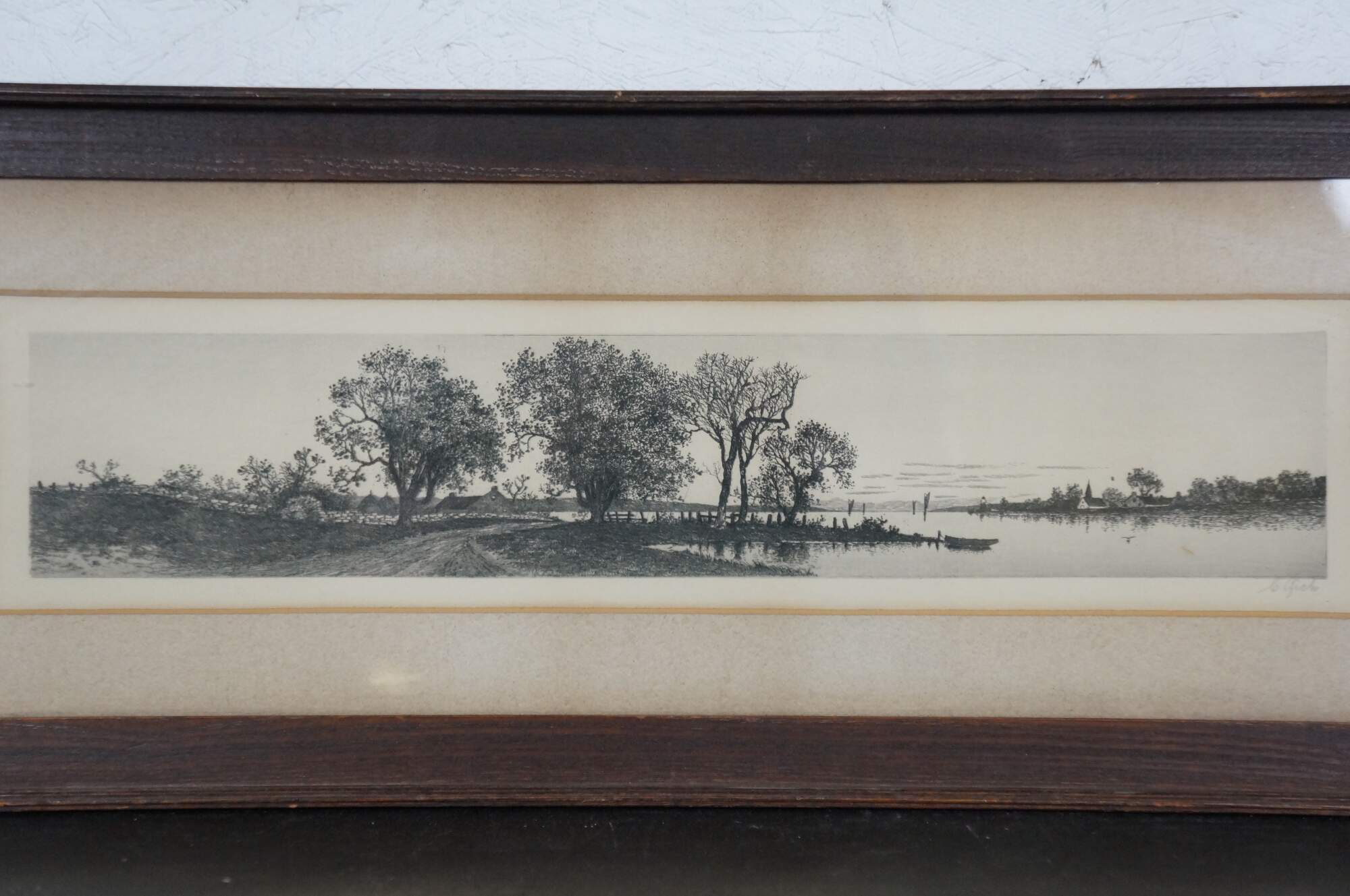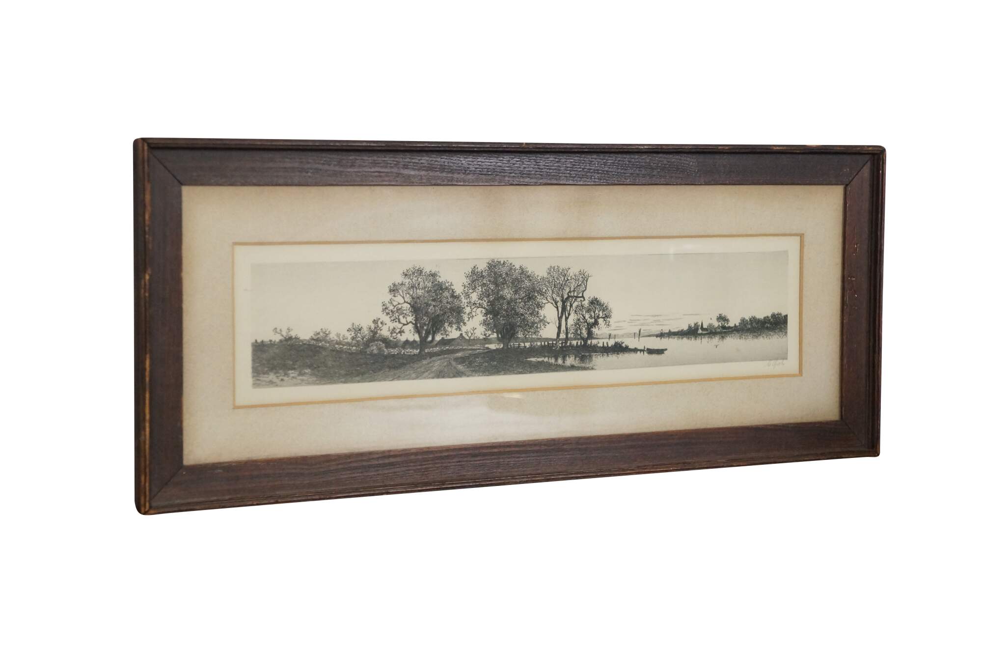 Late 19th century black and white etching. Panoramic landscape / riverscape with lighthouse, village and boats. Pencil signed "C. Rich", lower right. Beveled wood frame; white mat.