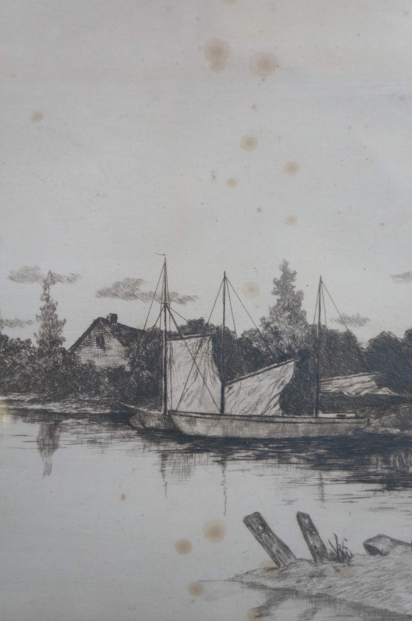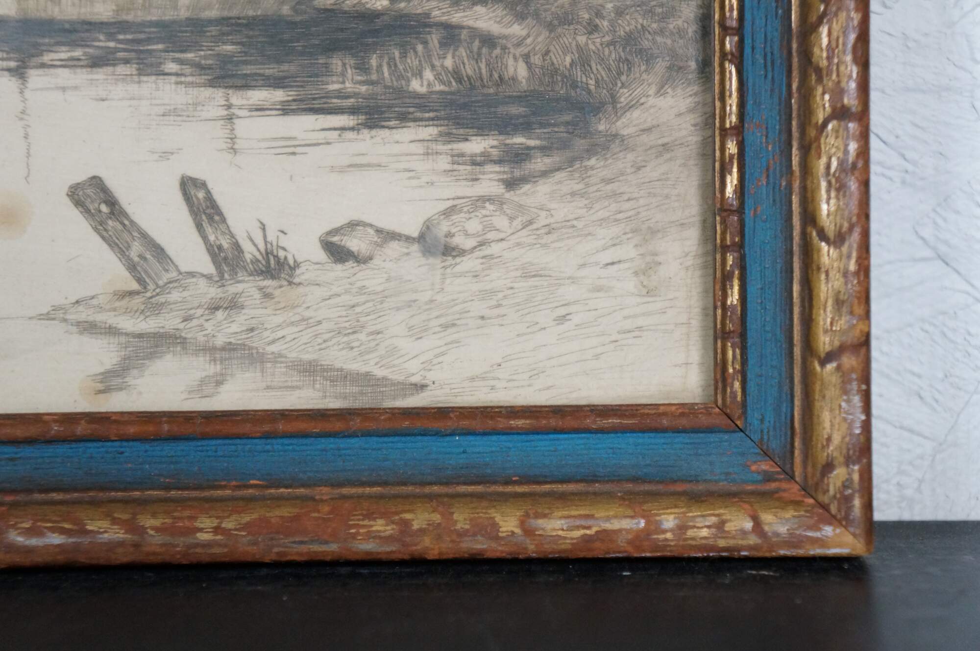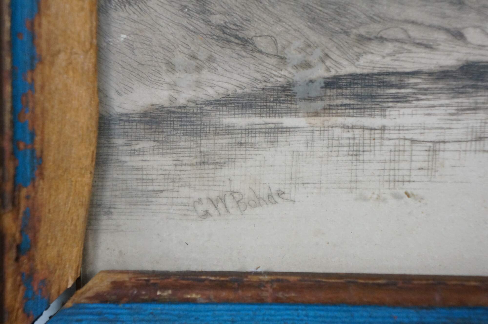 Late 19th century black and white etching by George William Bohde (American, 1870-1939). Country riverscape with docked boats. Signed in plate. Carved giltwood frame with blue painted bevel; no mat.