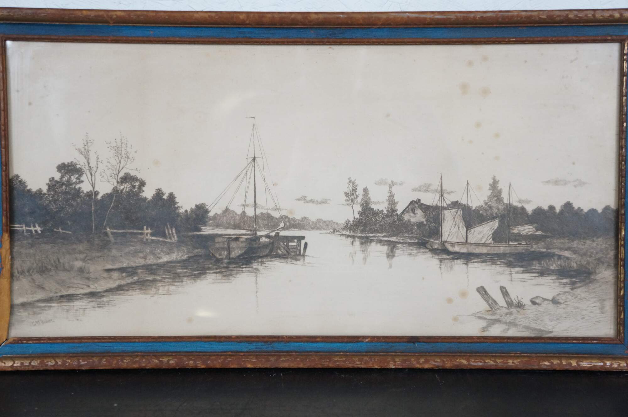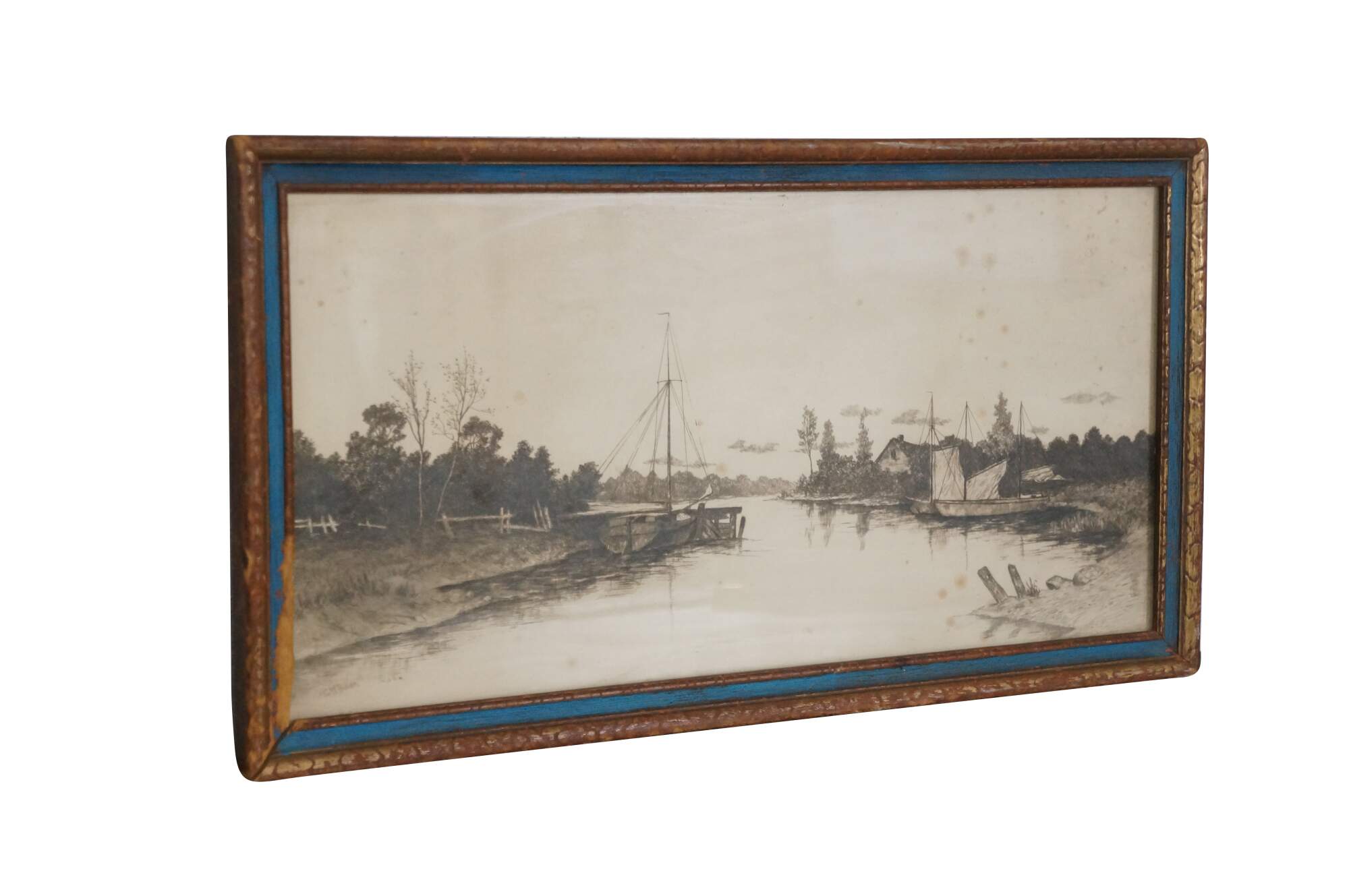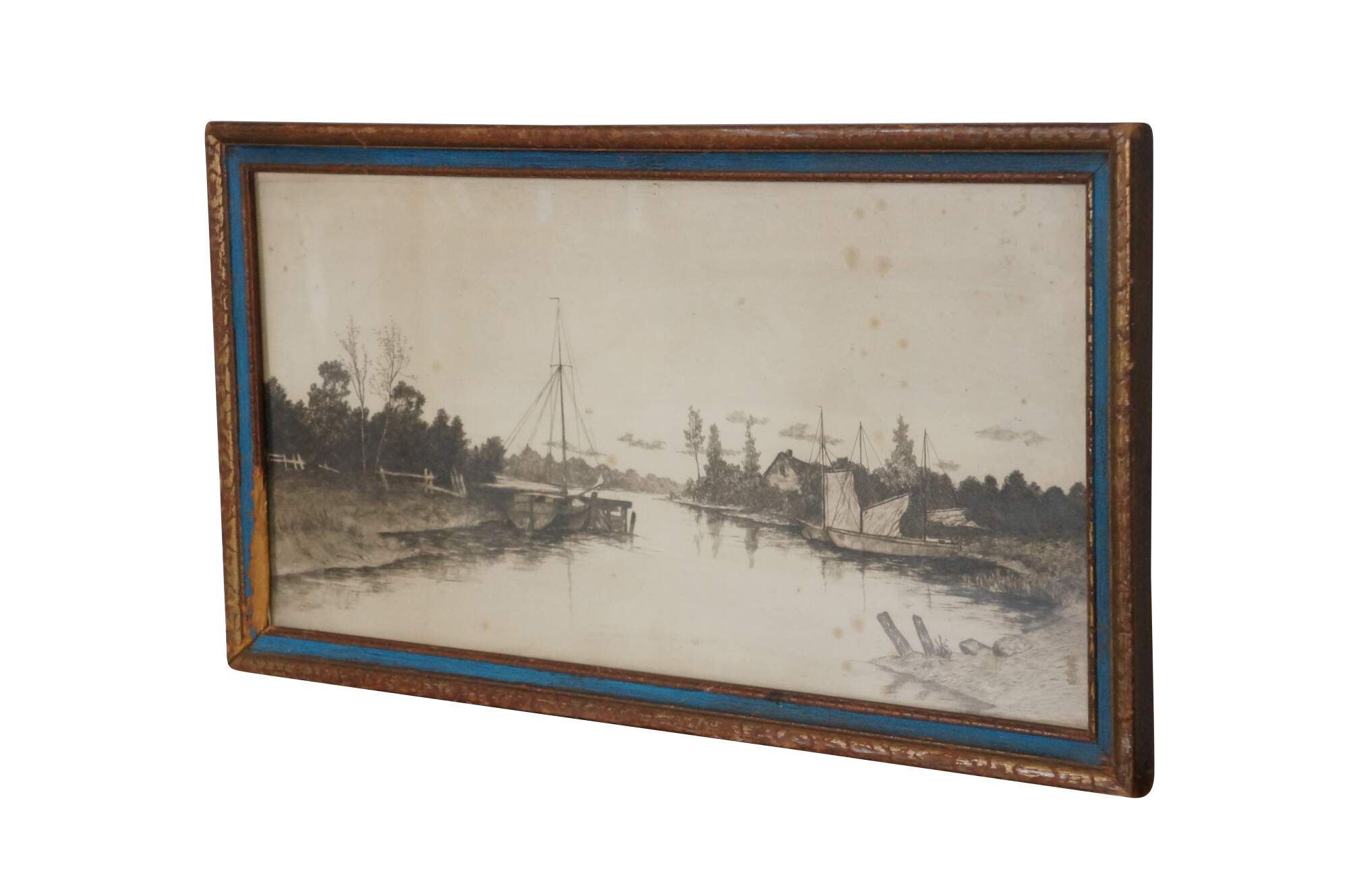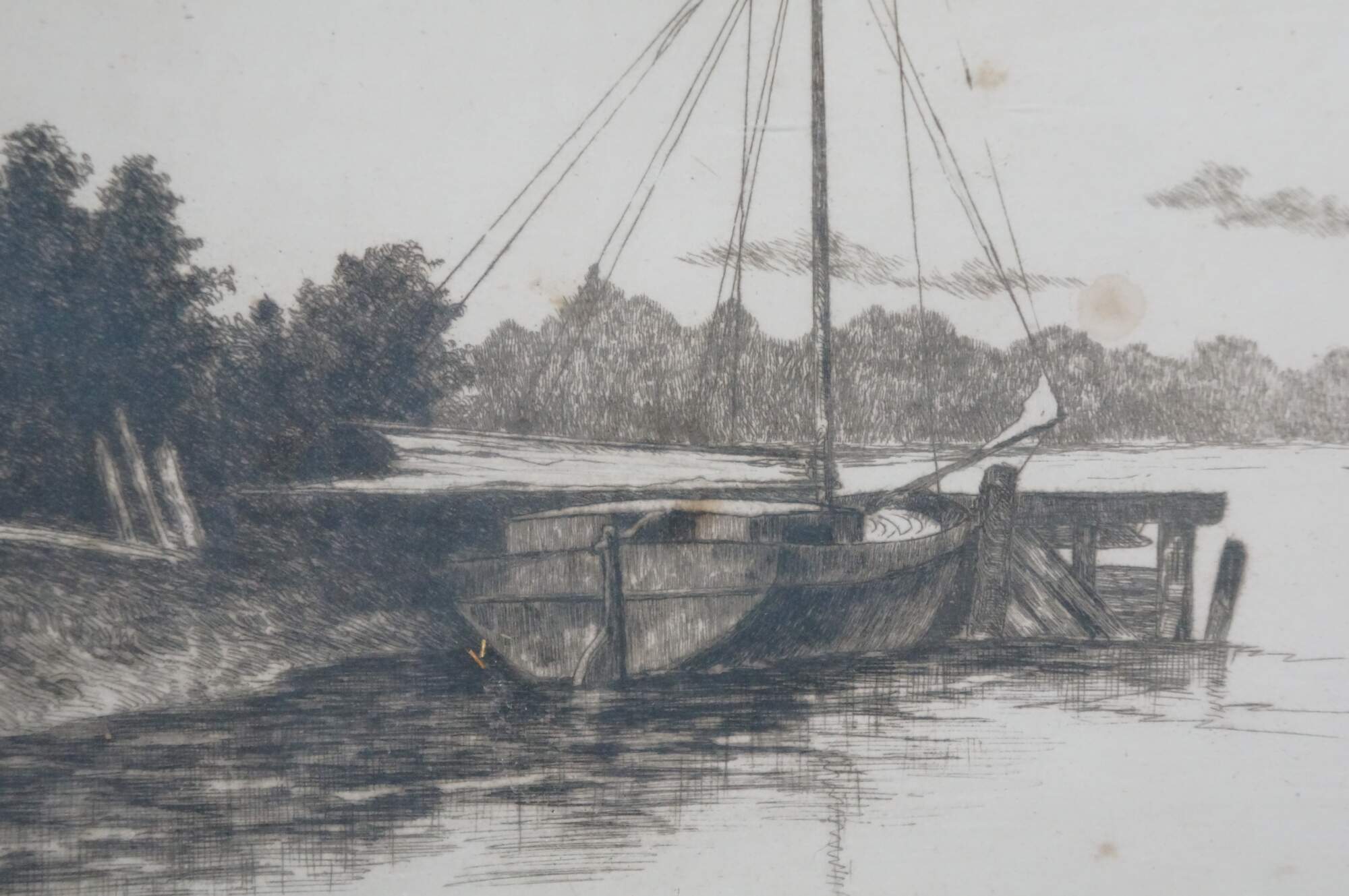Late 19th century black and white etching by George William Bohde (American, 1870-1939). Country riverscape with docked boats. Signed in plate. Carved giltwood frame with blue painted bevel; no mat.