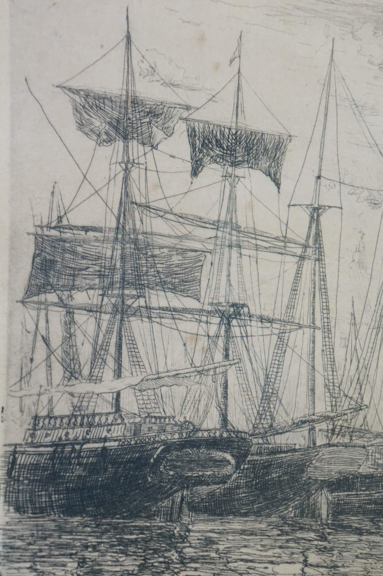 Late 19th century black and white etching titled "The Old East India Wharf, NY, 1879" by Frederick Leo Hunter. Dockside cityscape showing figures seated by boats in harbor. Signed and titled in plate. Pencil signed, lower right. Black beveled wood frame; white mat.