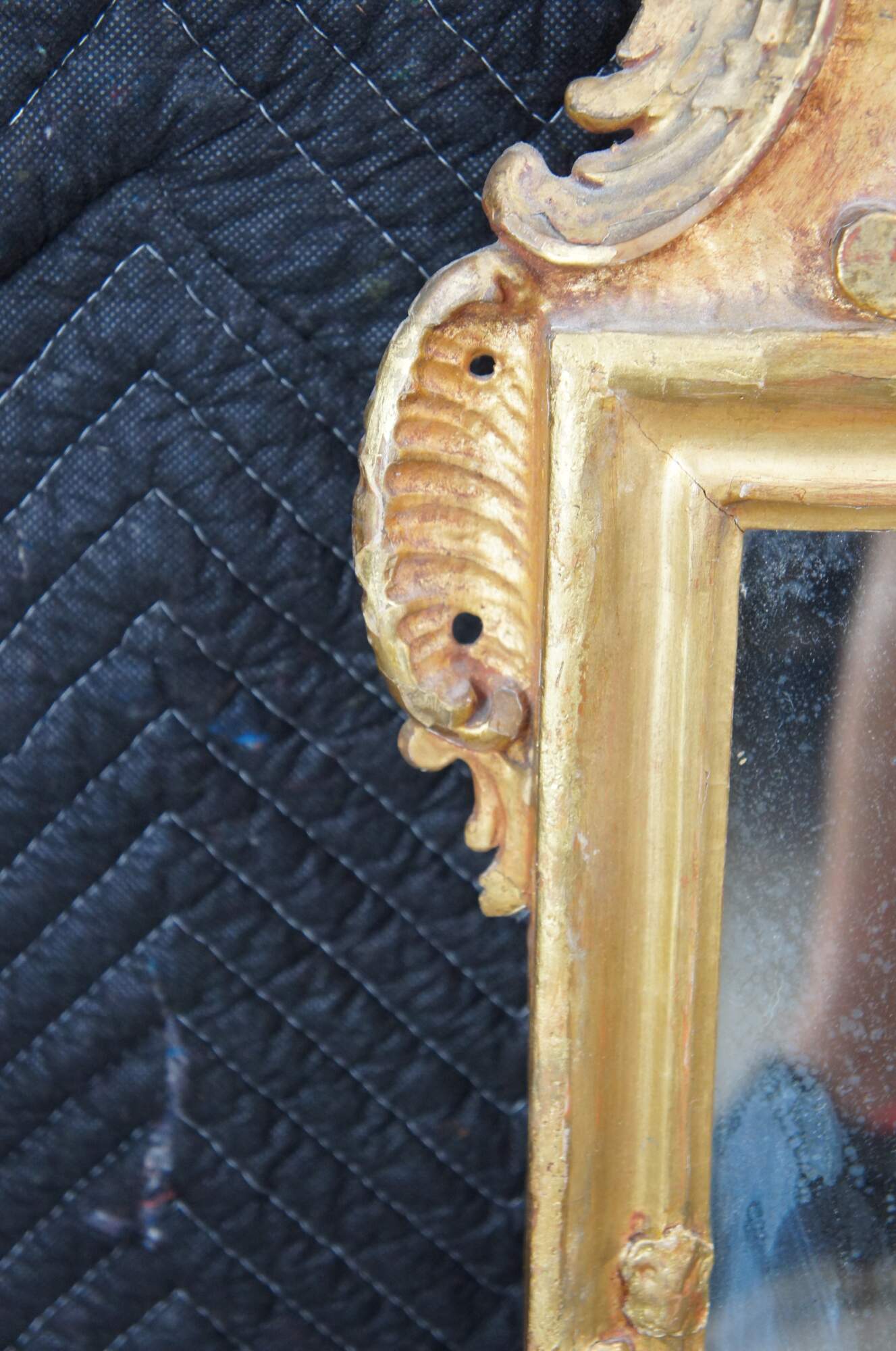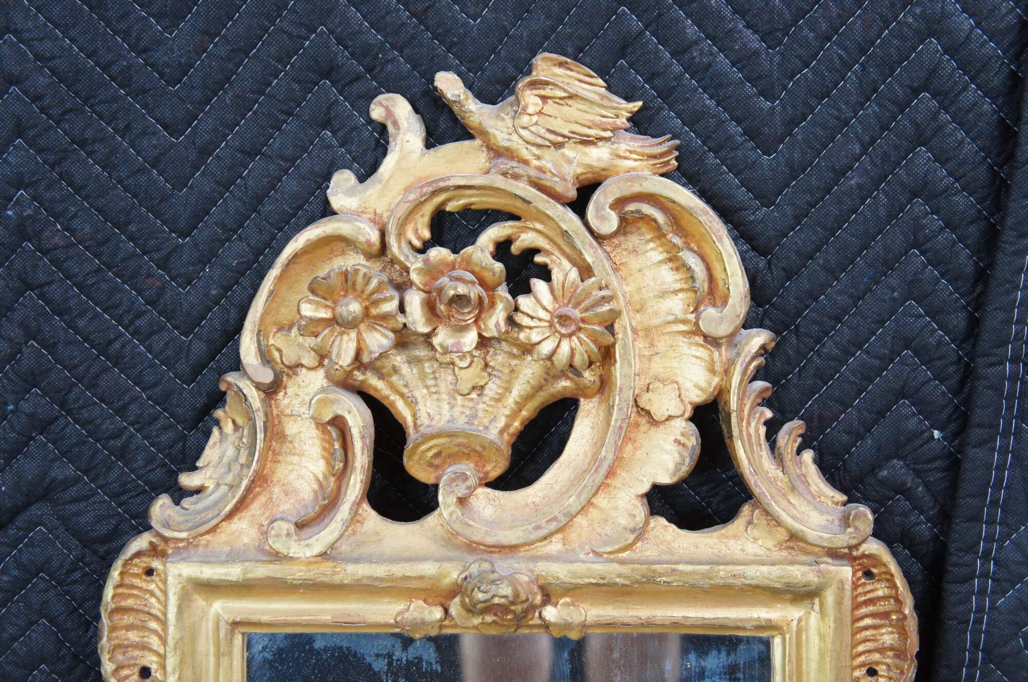 18th Century Baroque Carved Mirror. Features a scalloped oak frame with an intricate 'c' scrolling crown centered by basket with a daisy, hibiscus and rose. The frame is topped by a central facing dove. Mirror is single glass plate.