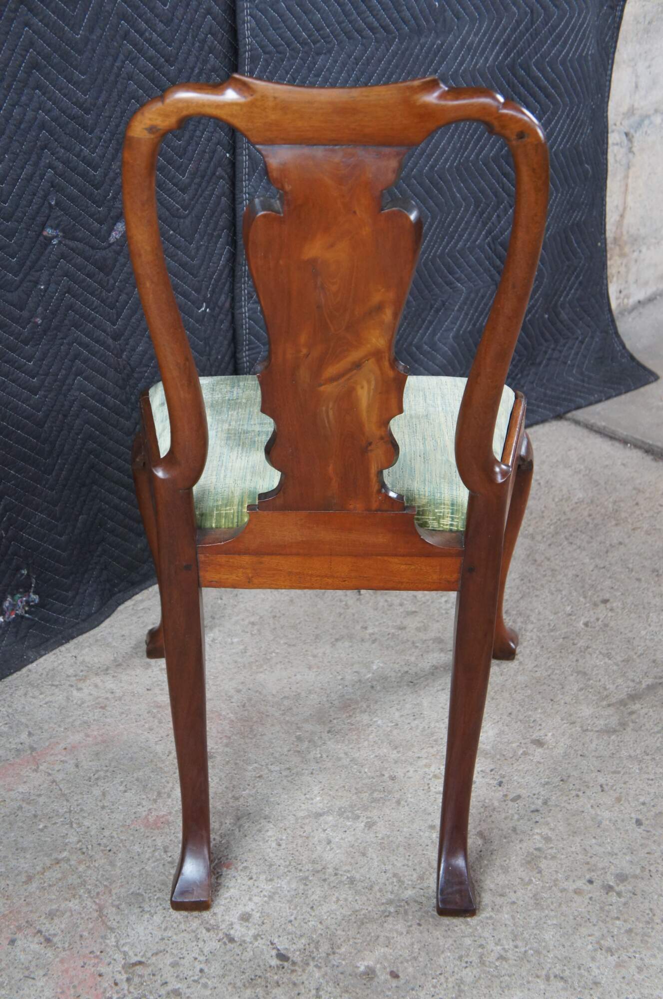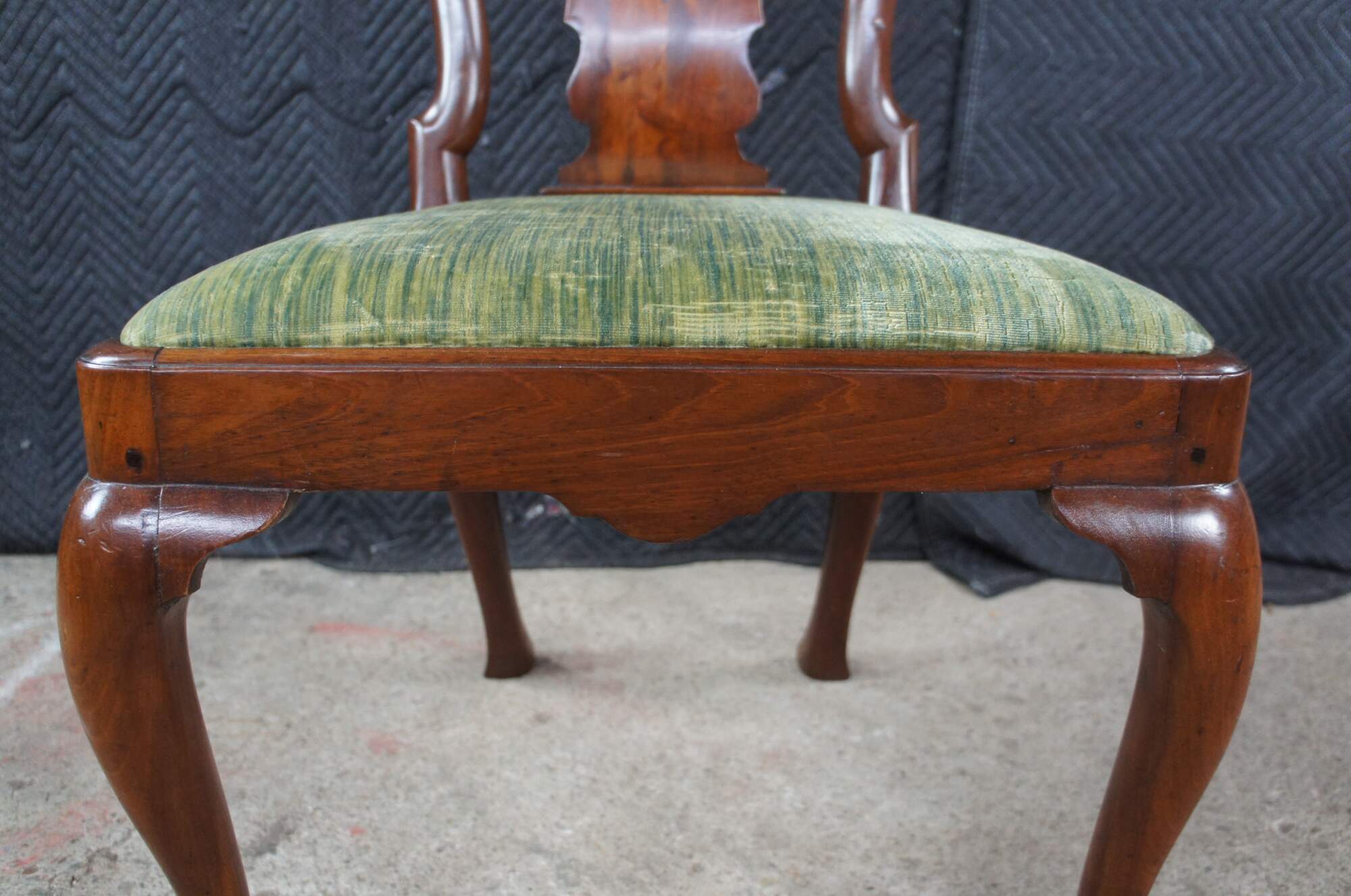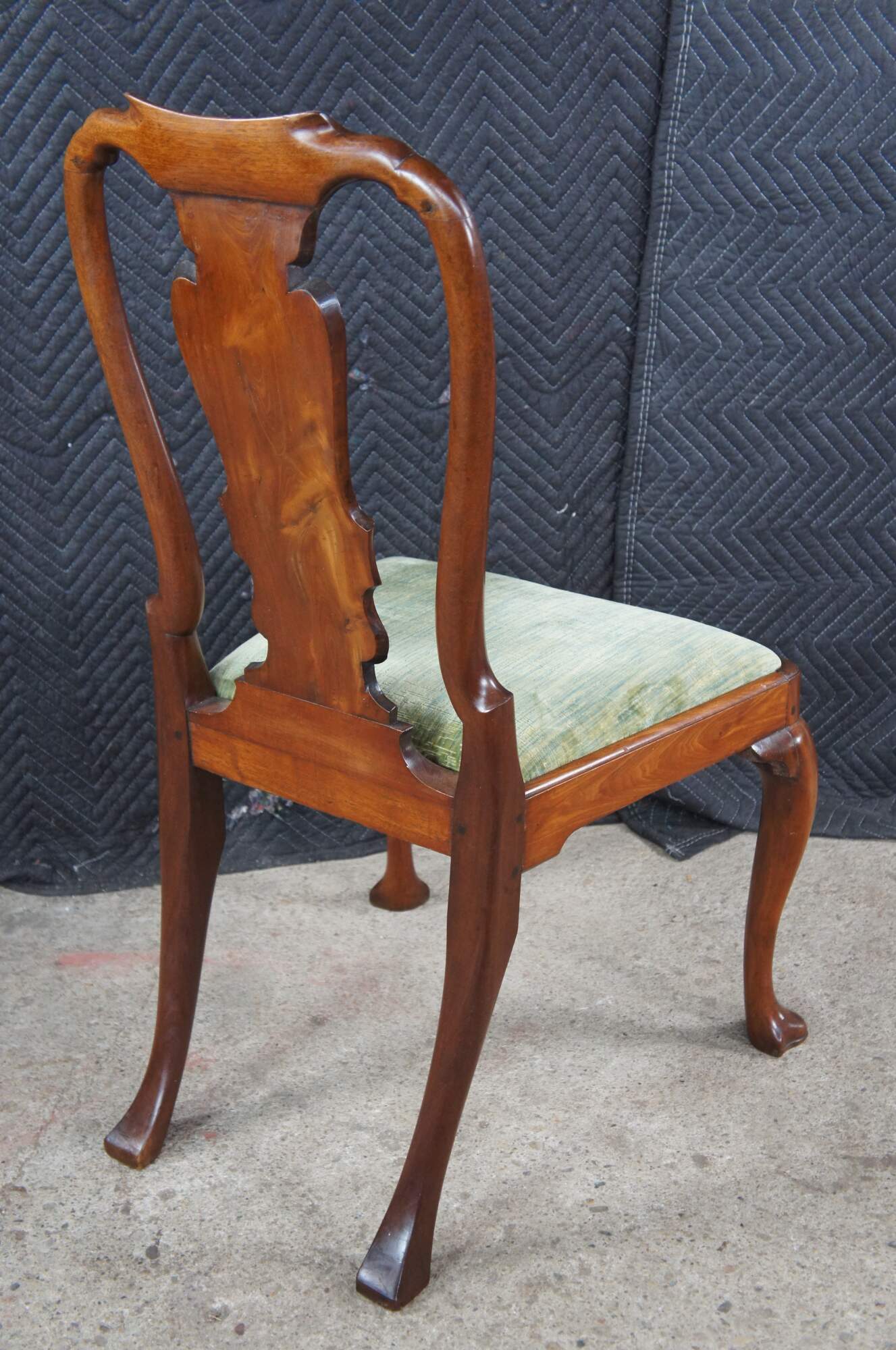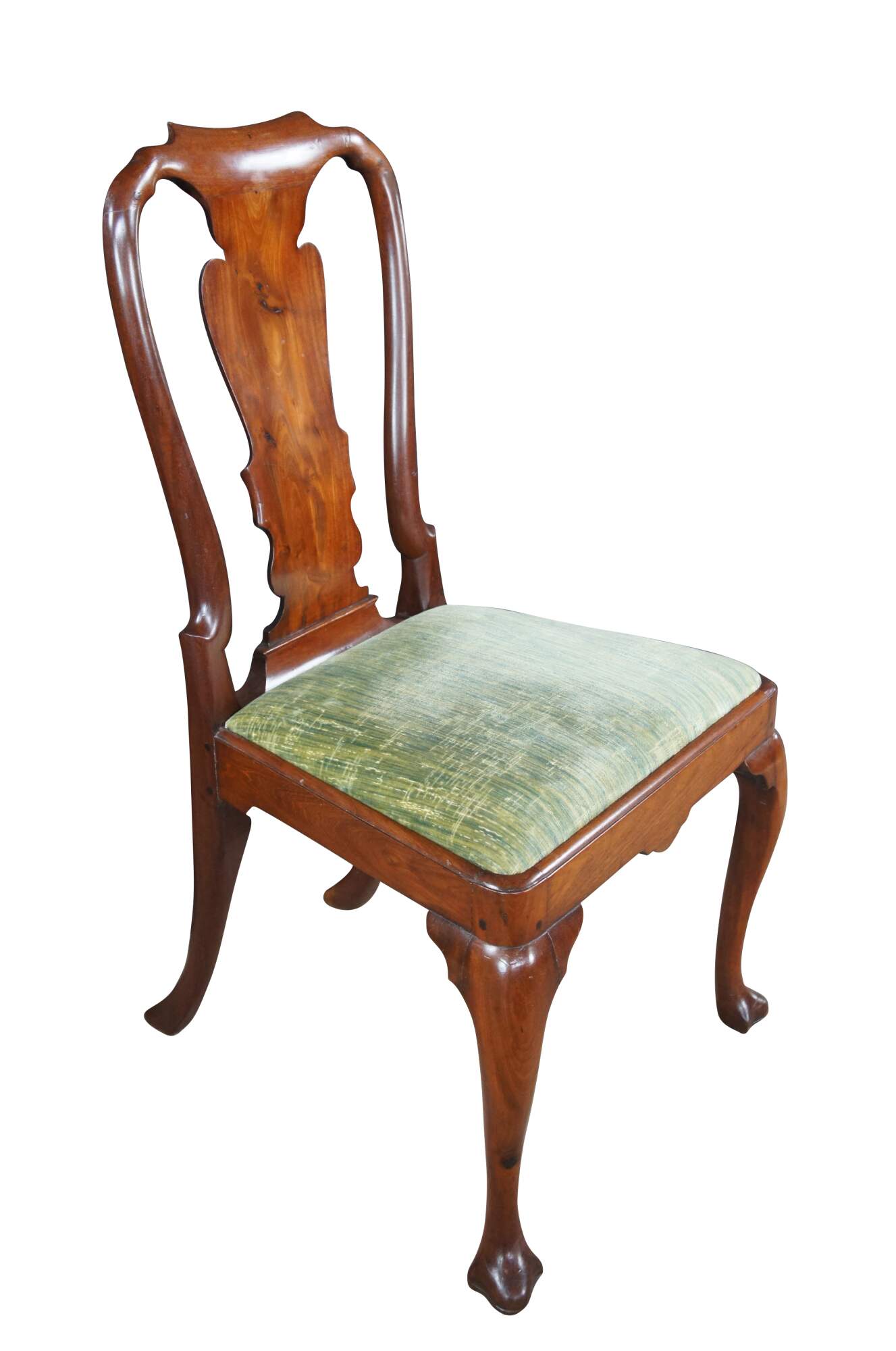 A rare set of 6 mid 18th century American Queen Anne dining chairs. Made from solid mahogany with a curved crest rail over traditional Queen Anne backsplat, flanked by curvaceous stiles leading to green felt lined seats. The chairs are supported by cabriole legs with trifid feet along the front and stump legs at the rear. Constructed via mortise and Tenon joinery. The chair seats are easily removed for re-upholstery. A remarkable set with a warm and rich wood tone and beautiful wood grain. The perfect addition to any space.