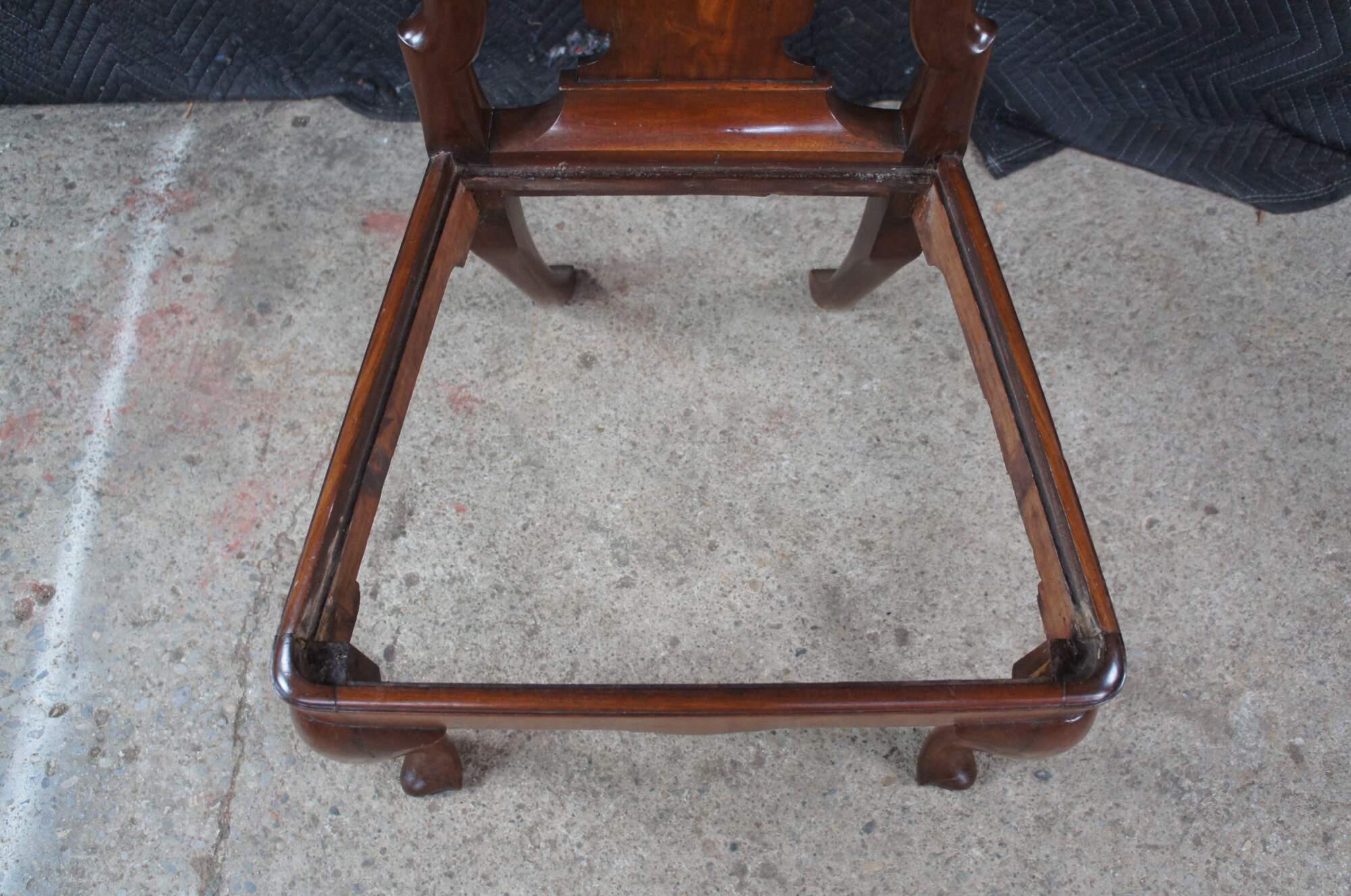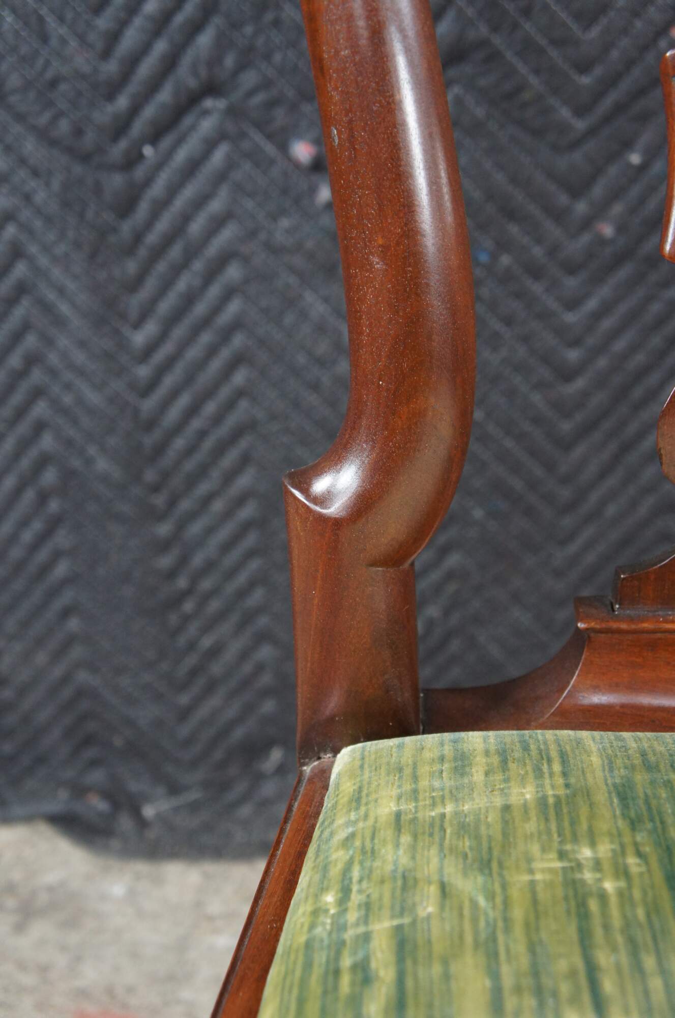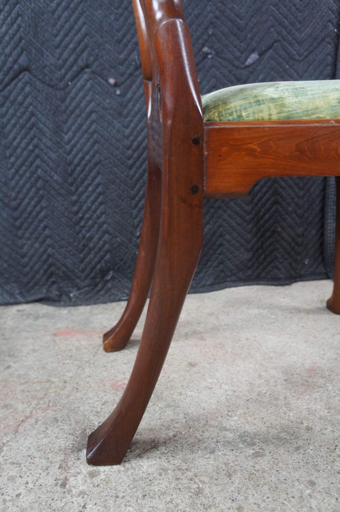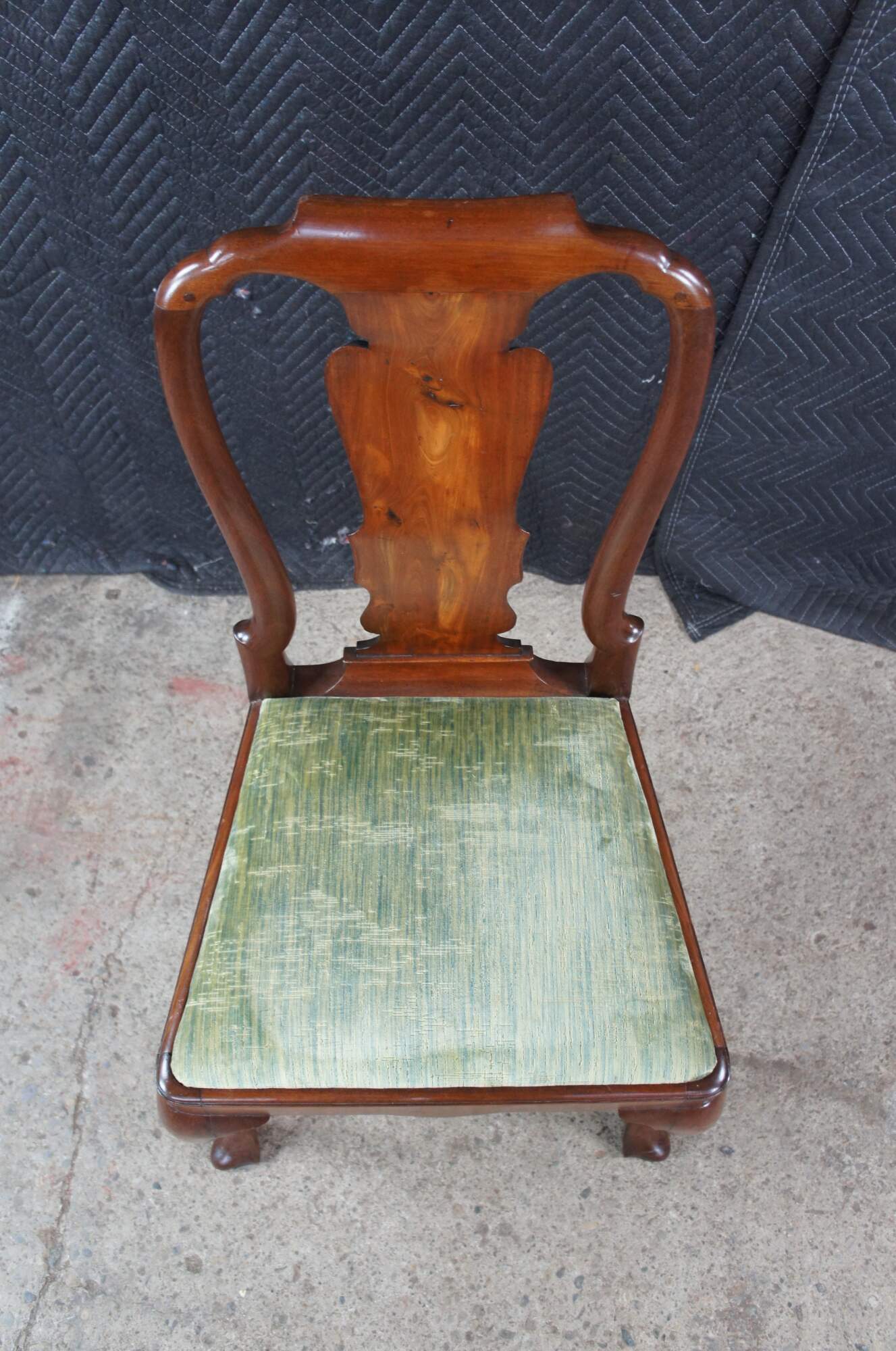 A rare set of 6 mid 18th century American Queen Anne dining chairs. Made from solid mahogany with a curved crest rail over traditional Queen Anne backsplat, flanked by curvaceous stiles leading to green felt lined seats. The chairs are supported by cabriole legs with trifid feet along the front and stump legs at the rear. Constructed via mortise and Tenon joinery. The chair seats are easily removed for re-upholstery. A remarkable set with a warm and rich wood tone and beautiful wood grain. The perfect addition to any space.