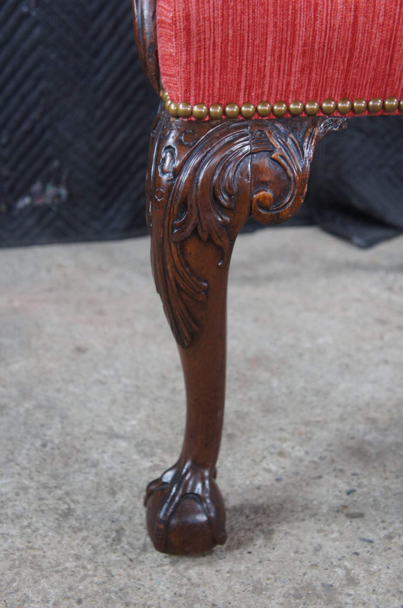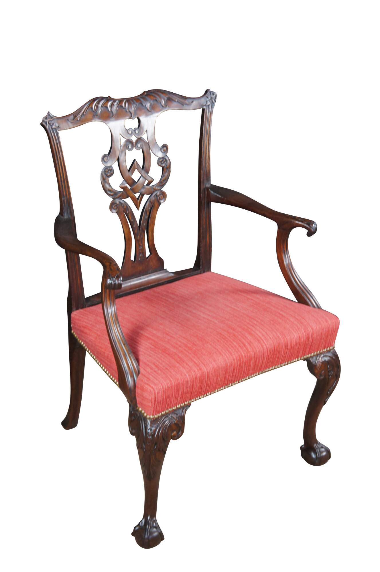 Antique 18th Century Irish Chippendale Arm Chair. Made from mahogany with a serpentine carved crest rail featuring fretwork carved ears over an interlaced pierced urn-shaped splat with scrolling acanthus carvings flanked by fluted stiles and shapely knuckle carved arms over a red upholstered seat with brass nailhead trim. The chair is supported by cabriole legs with acanthus carved knees and shapely ball and claw feet.