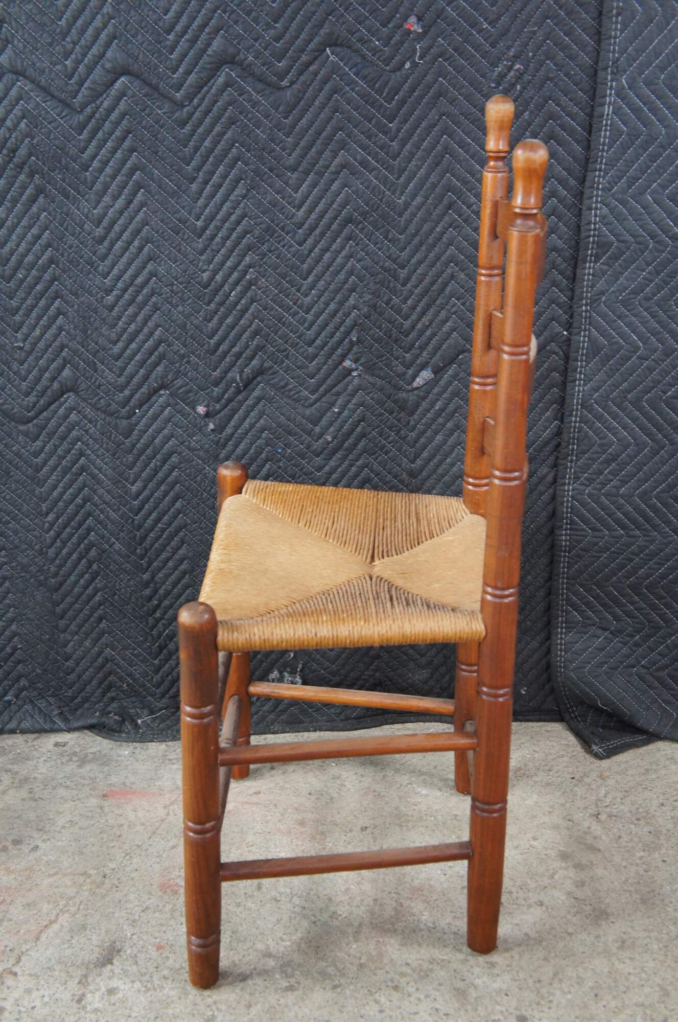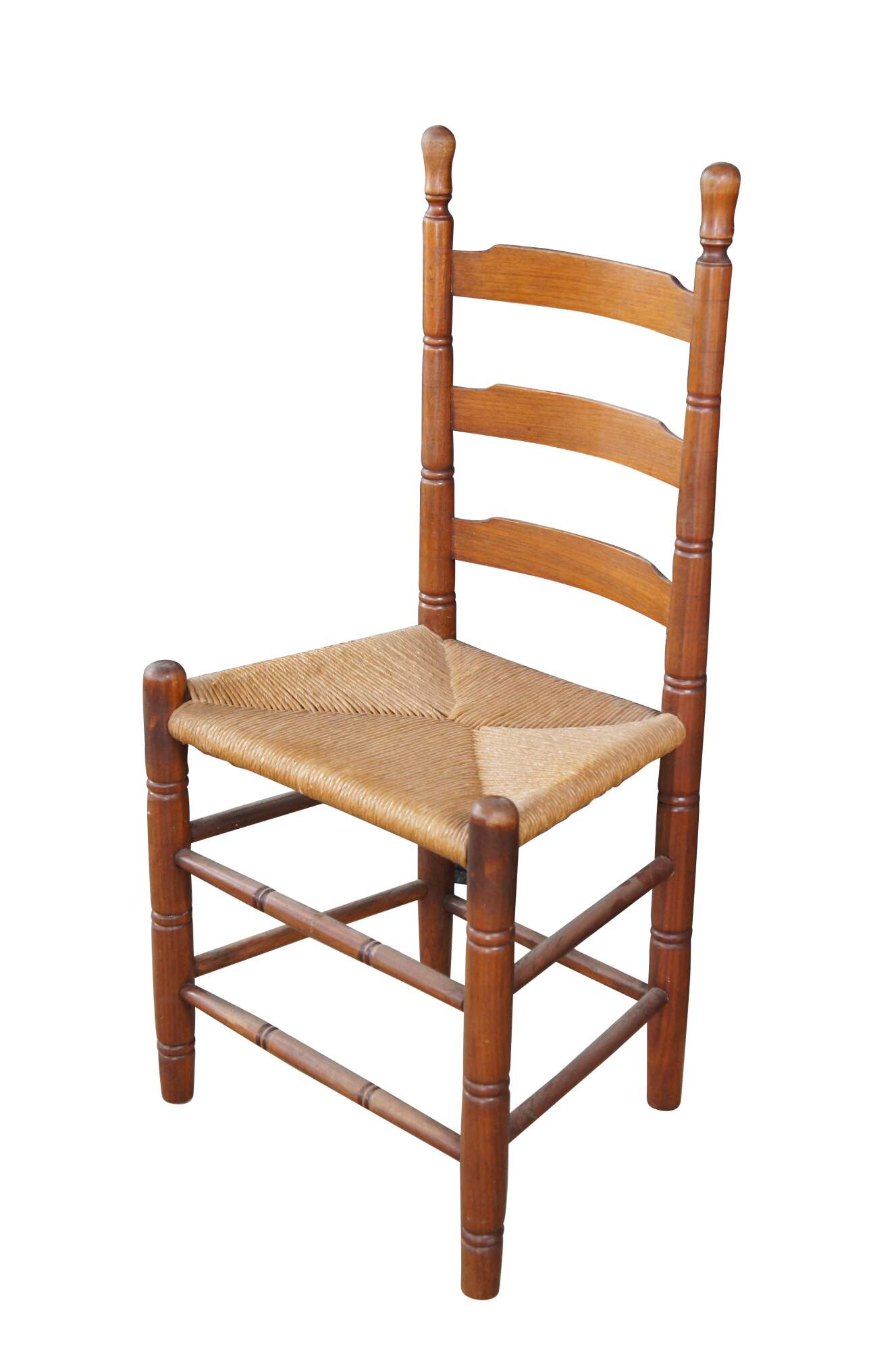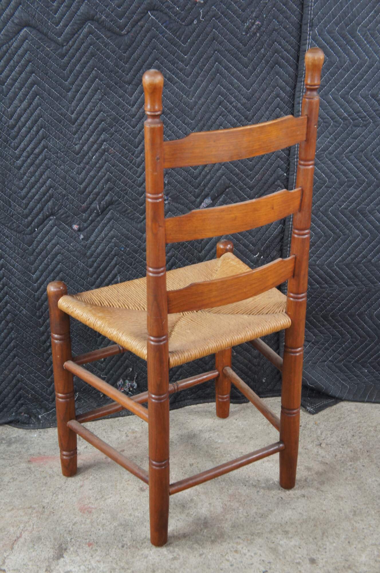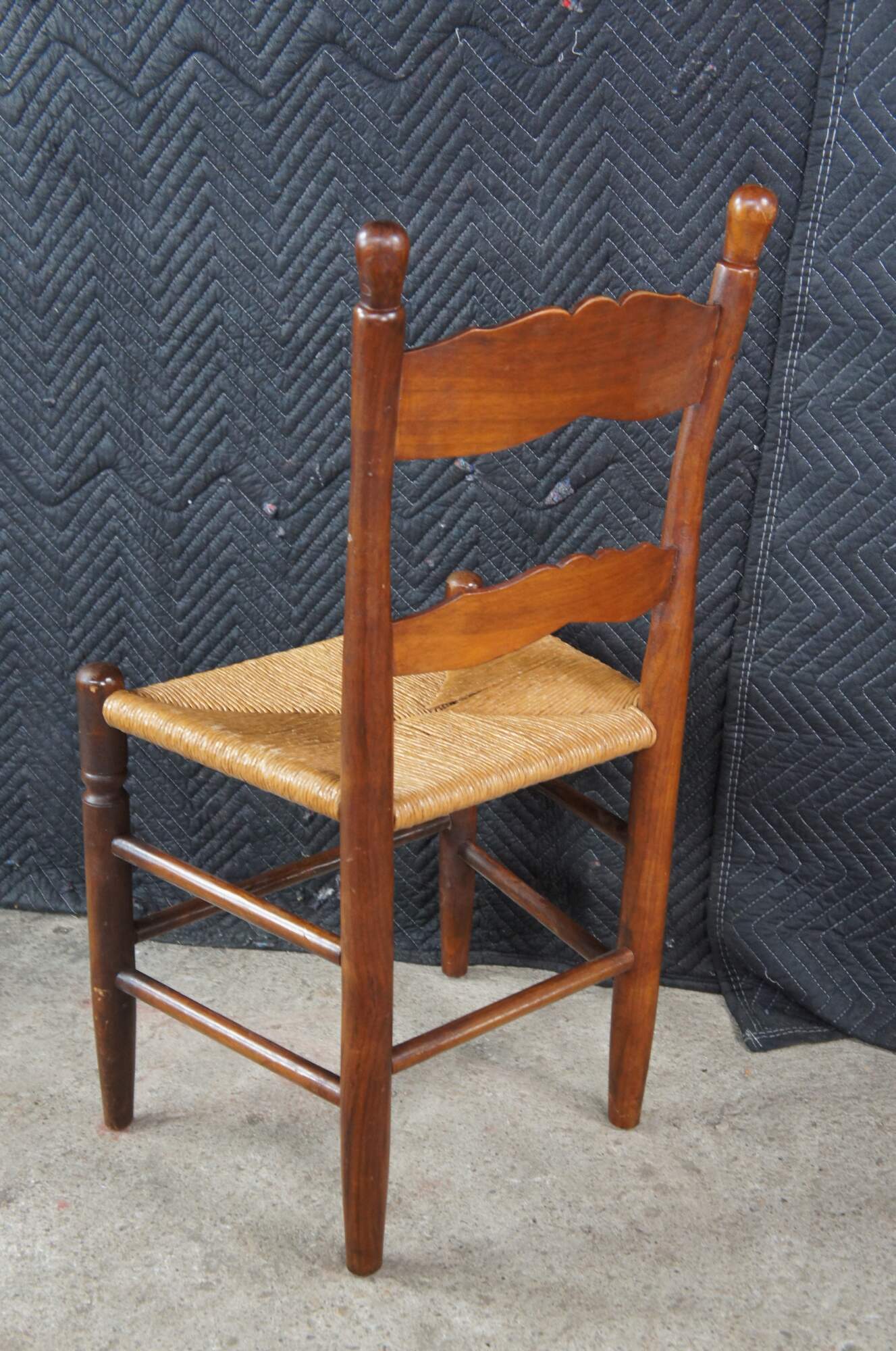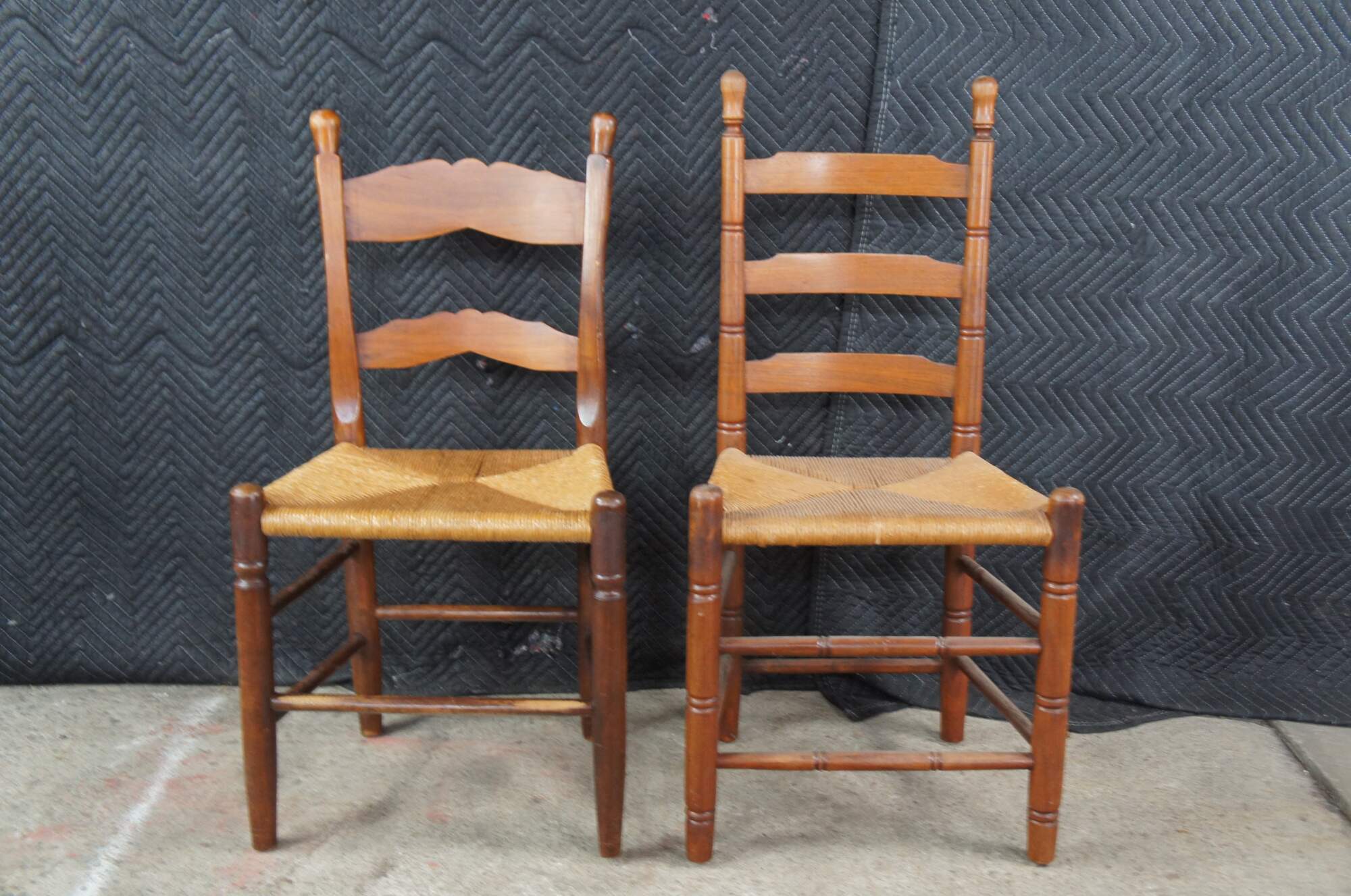 2 antique Shaker style side chairs. Mismatched set with different ladder back styles. Made from mahogany with rush seat over ring turned legs.