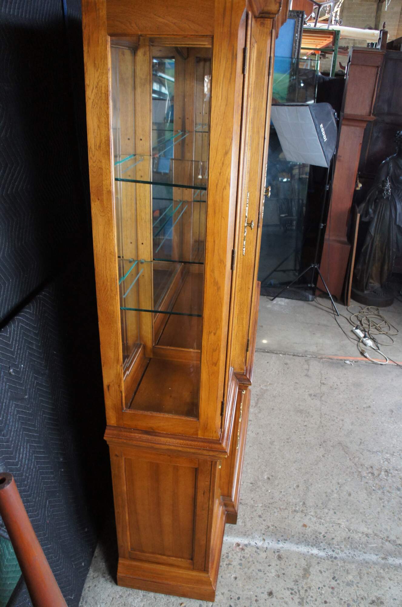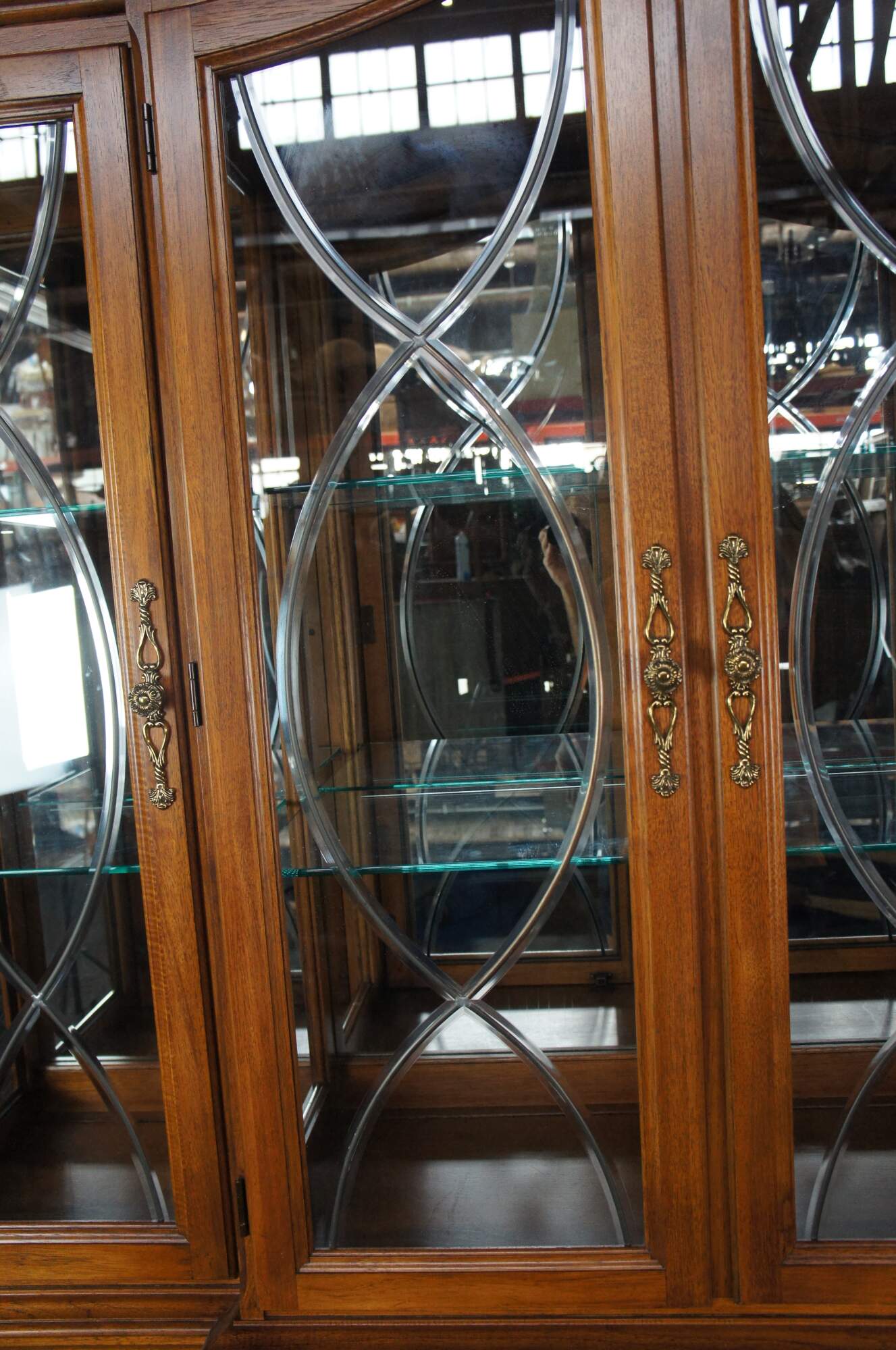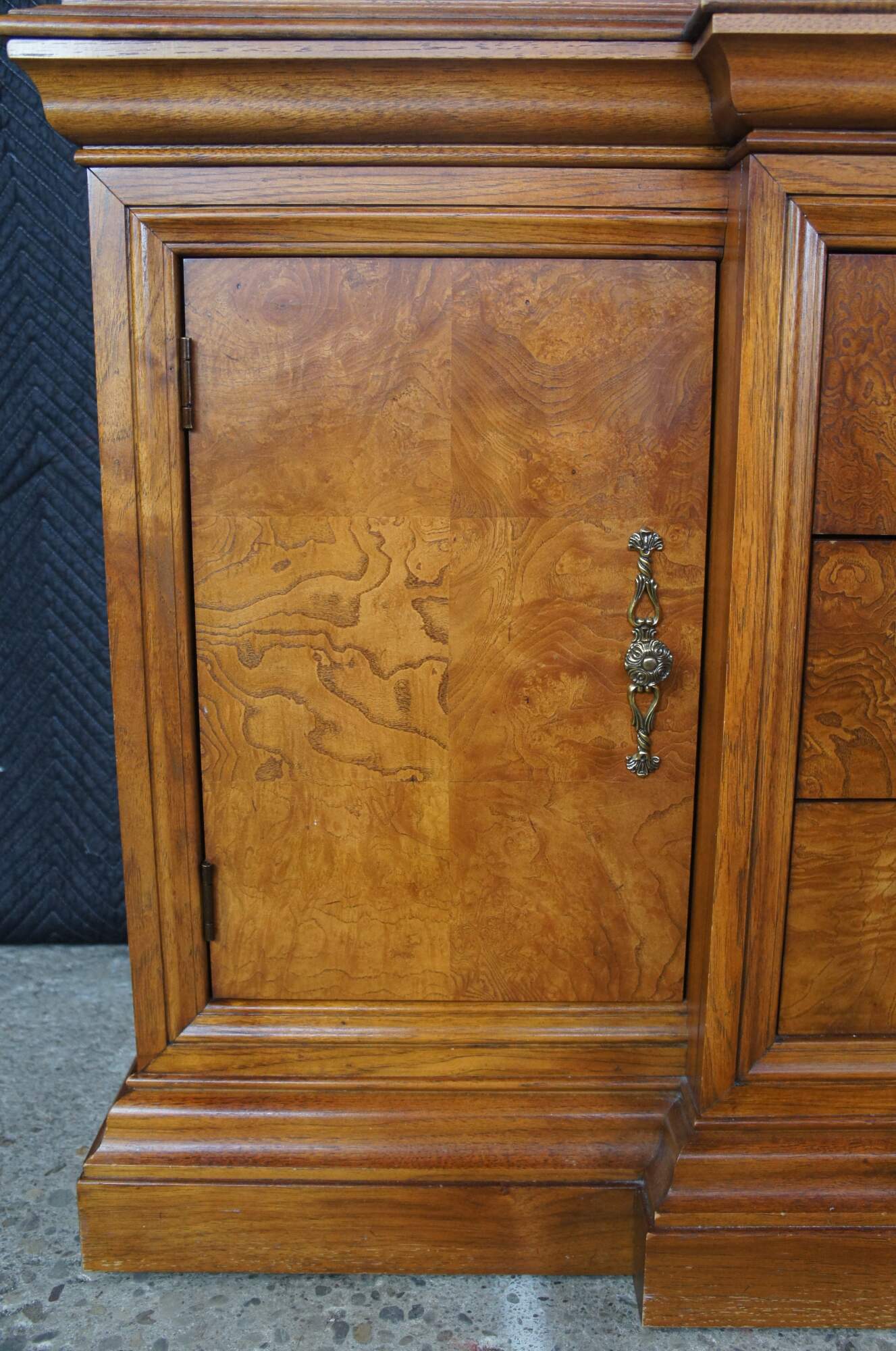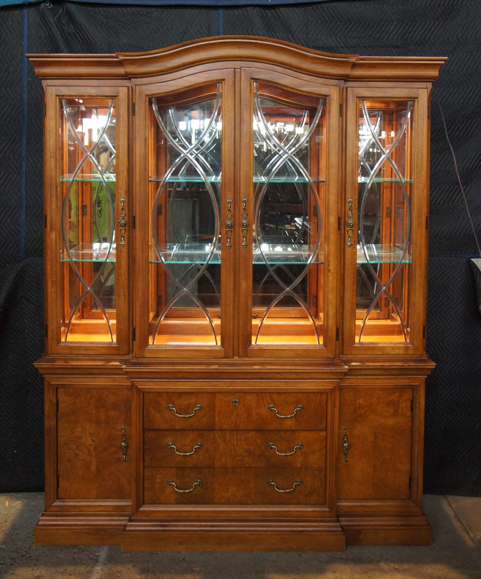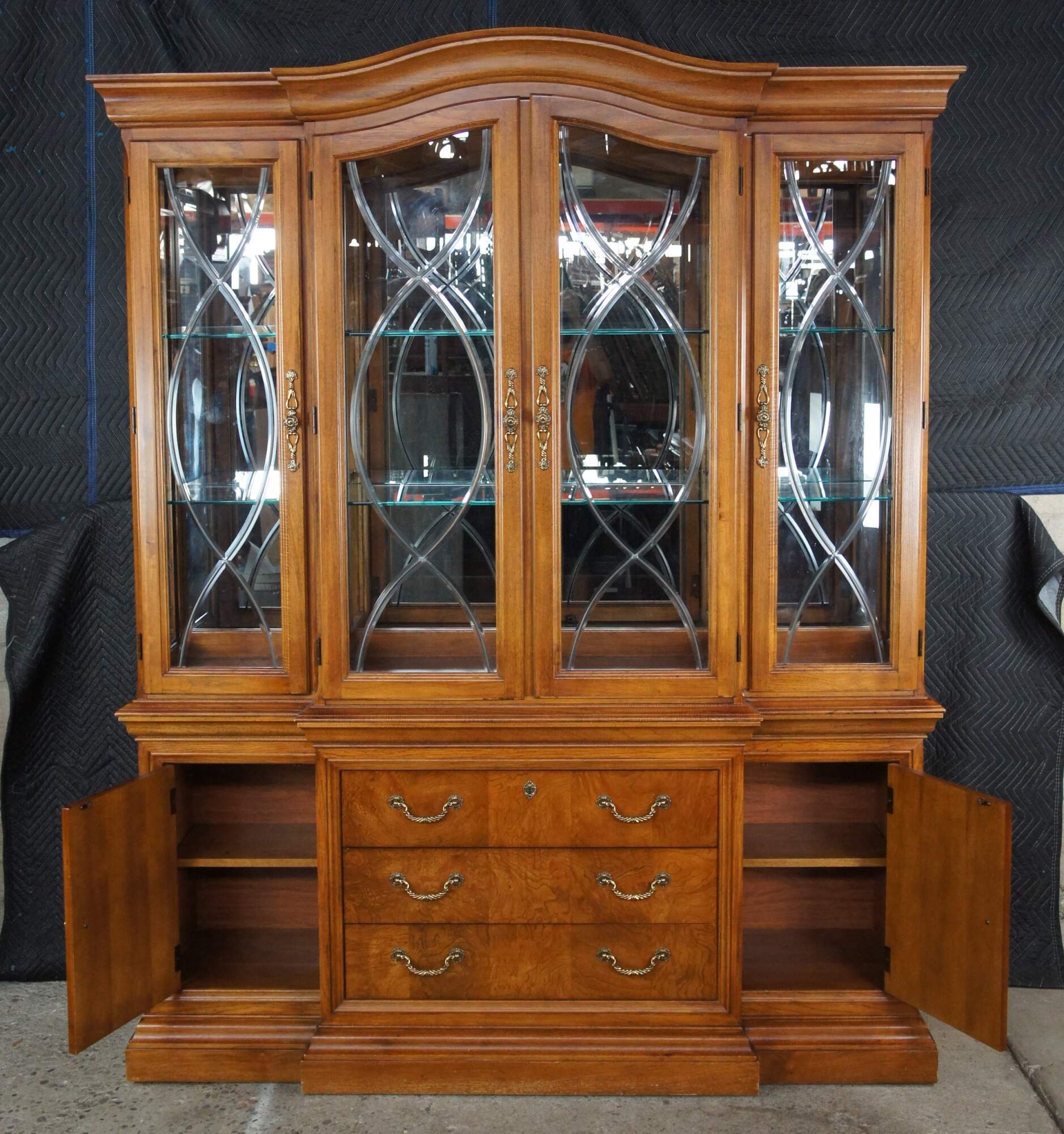 Early 2000s Thomasville Breakfront. Inspired by French Louis Philippe styling. Features an oak frame with beautiful leaded & beveled glass doors over an ash burled buffet portion. The display portion has an arched and beveled top that opens to two pencil polished glass shelves and a mirrored backing. Interior illuminates by tapping one of the hinges. The base of the cabinet is centered by three dovetailed drawers with ornate brass bail pulls flanked by two outer cabinets with shelves. A stunning piece that will make a great addition to any space.