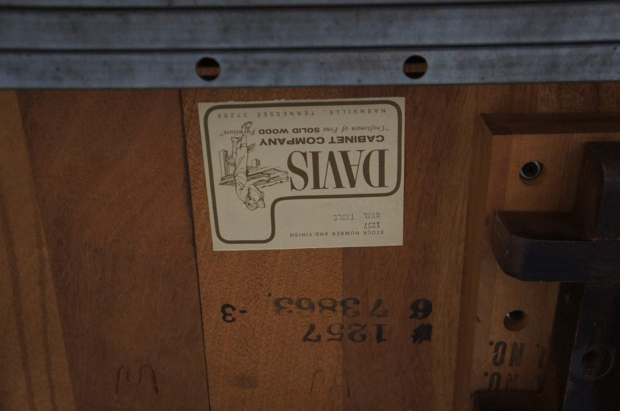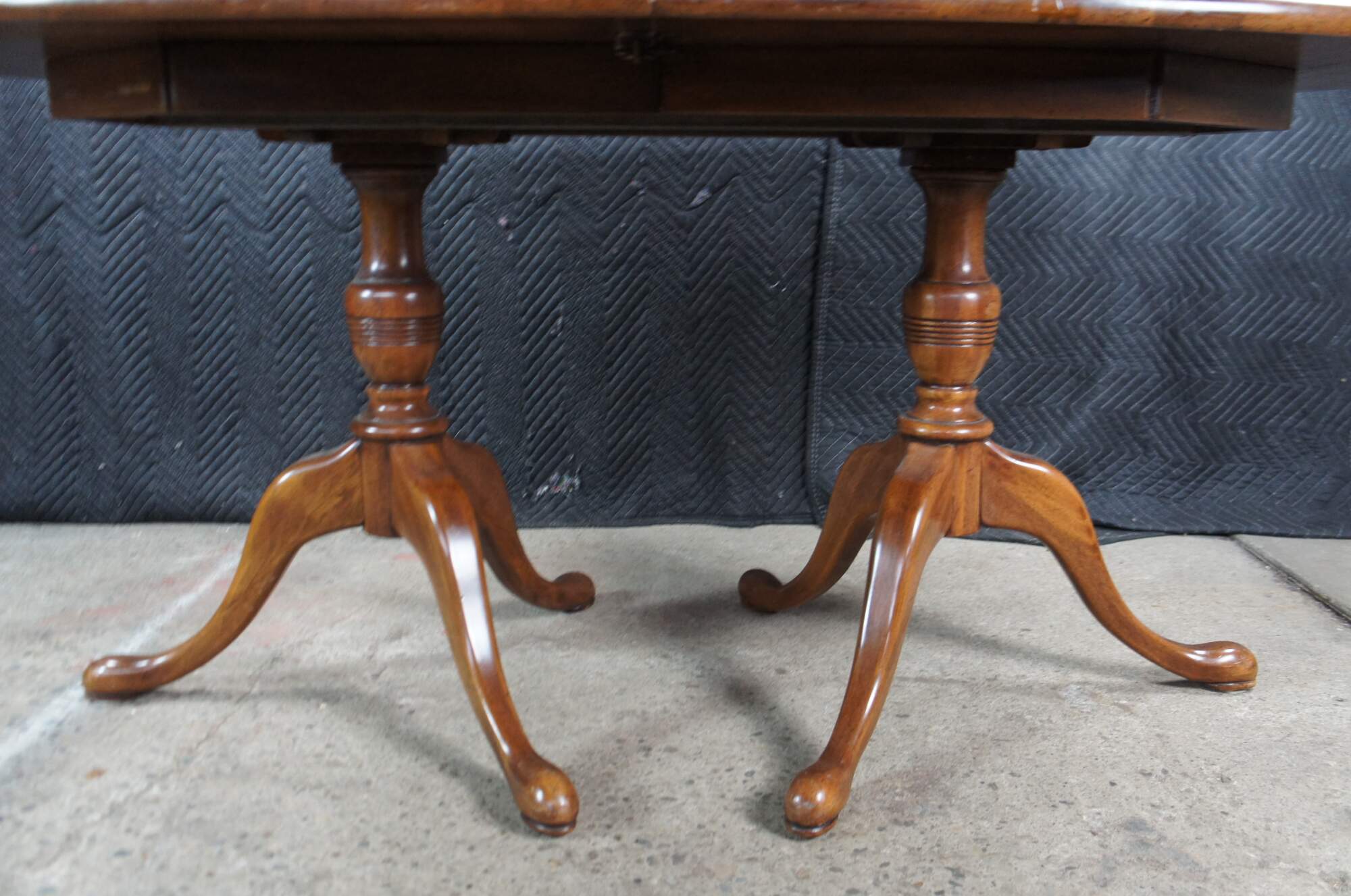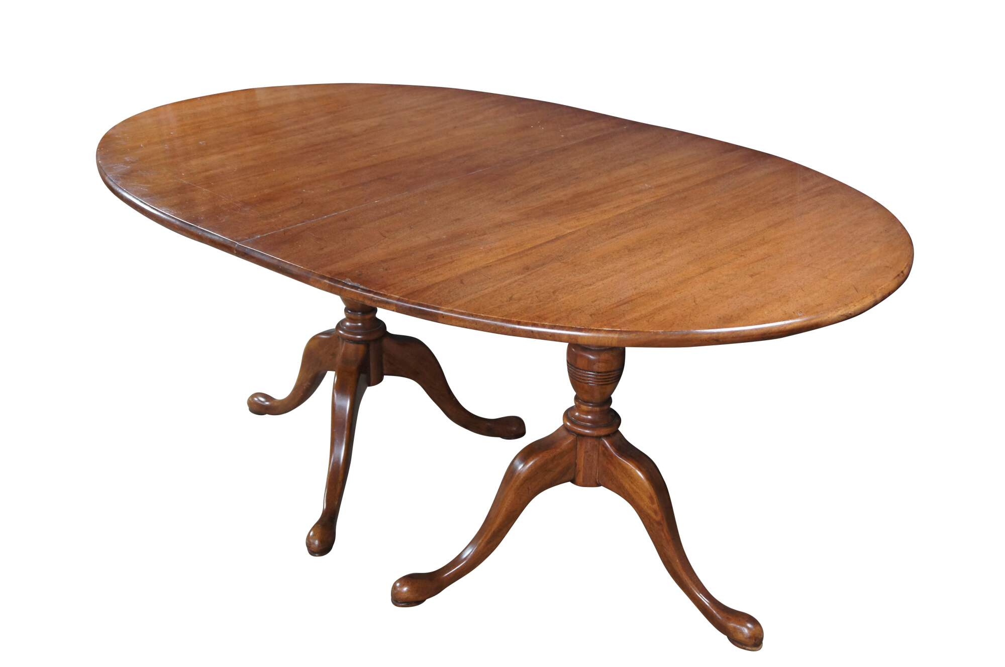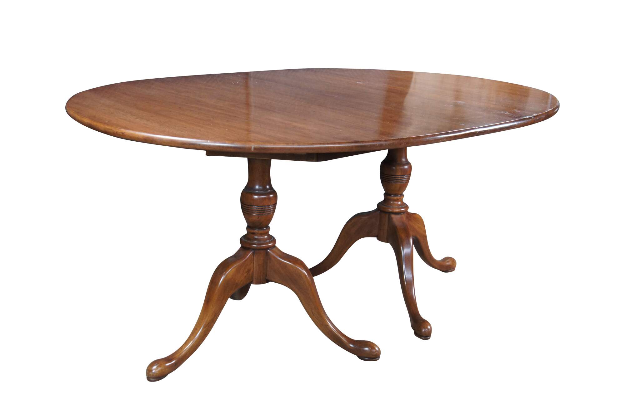 Vintage Davis Cabinet Company Cumberland Valley Oval Dining Table #1257, circa 1960s. Features a distressed walnut construction over a double pedestal base with ring turned baluster supports over downswept legs with pad feet.
