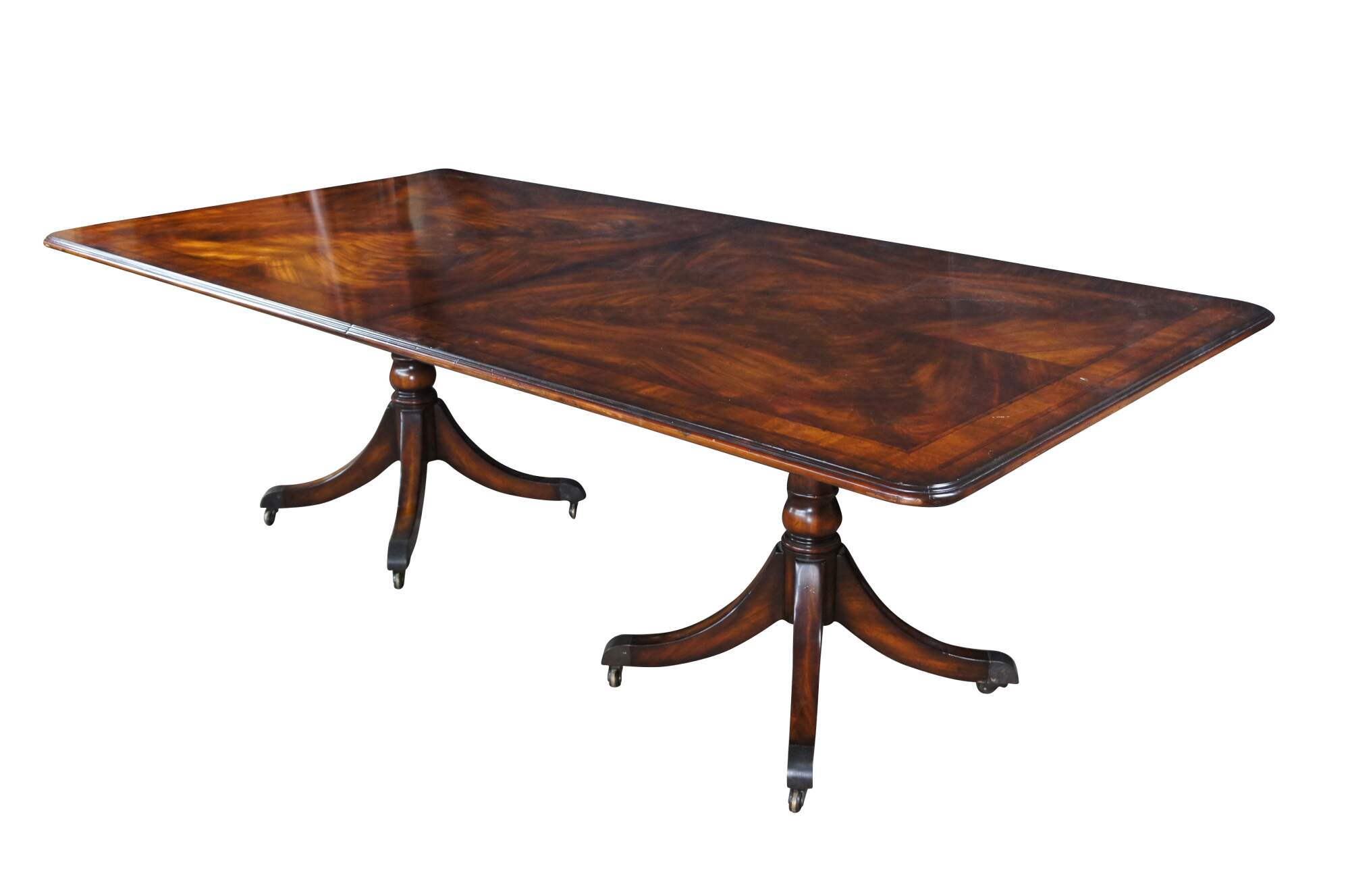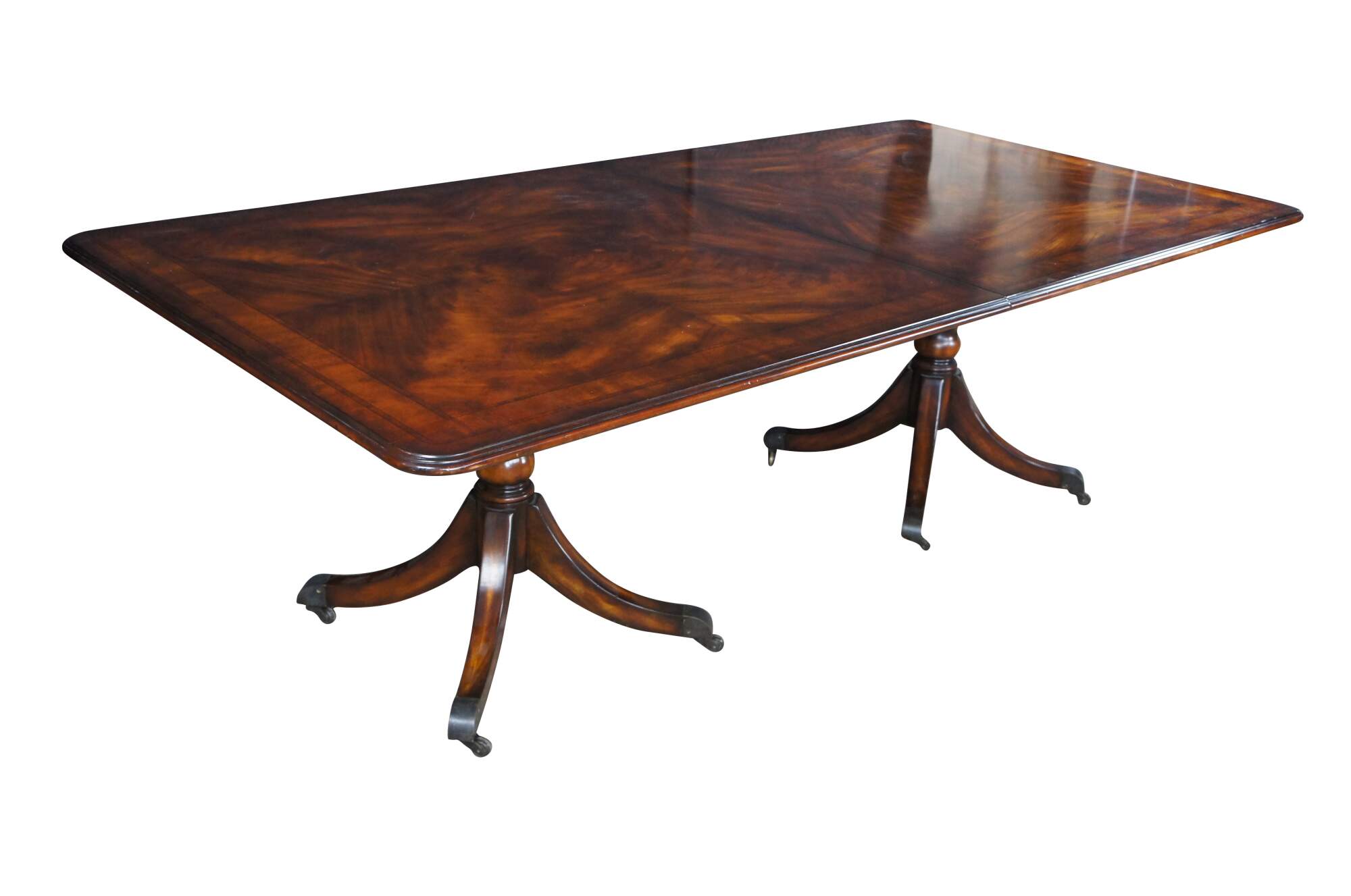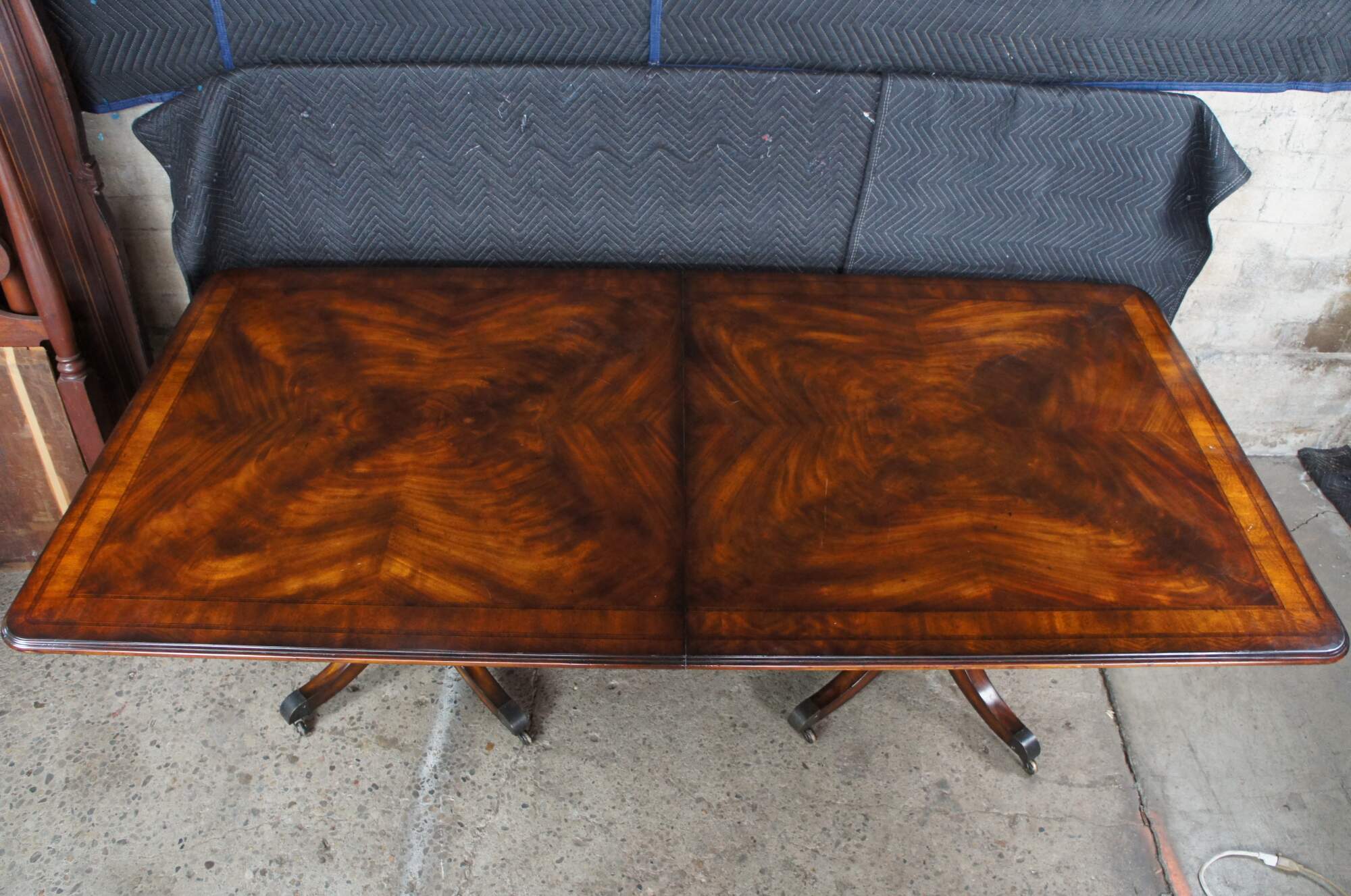 A beautiful Theodore Alexander English Regency style Dining Table, circa 2000s, Unmarked. Made from mahogany with a matchbook burled top with crossbanding and inlay over a double pedestal base. Pedestals are ring turned with downswept legs leading to brass capped feet with casters.