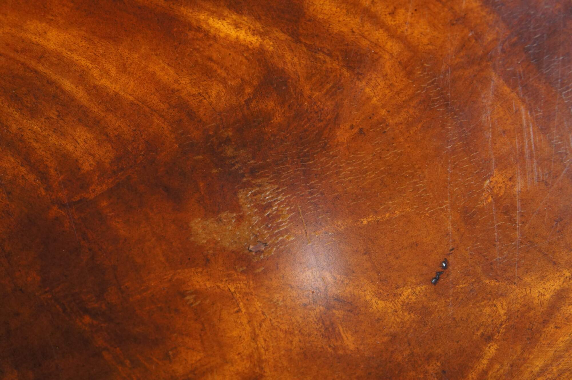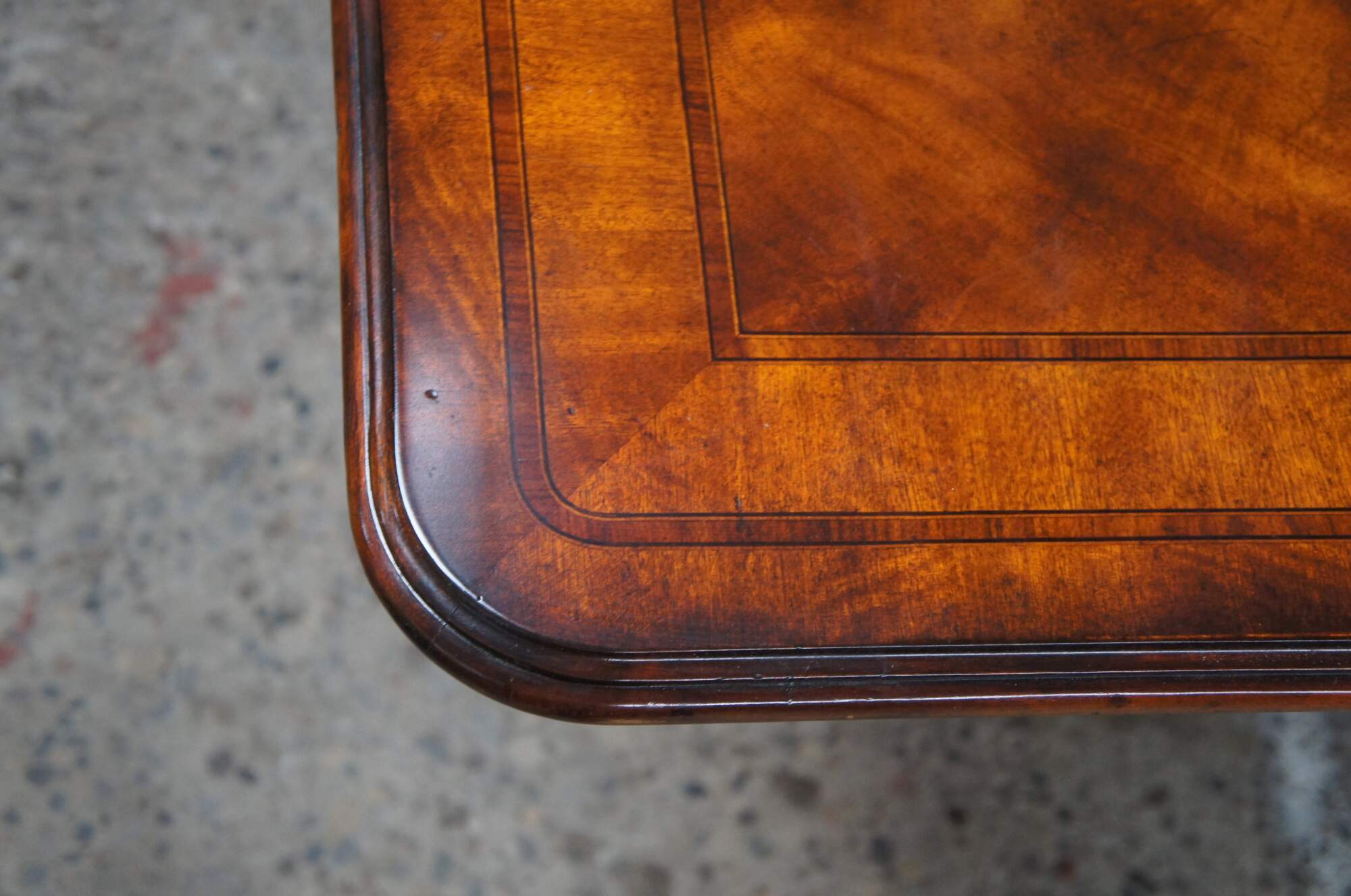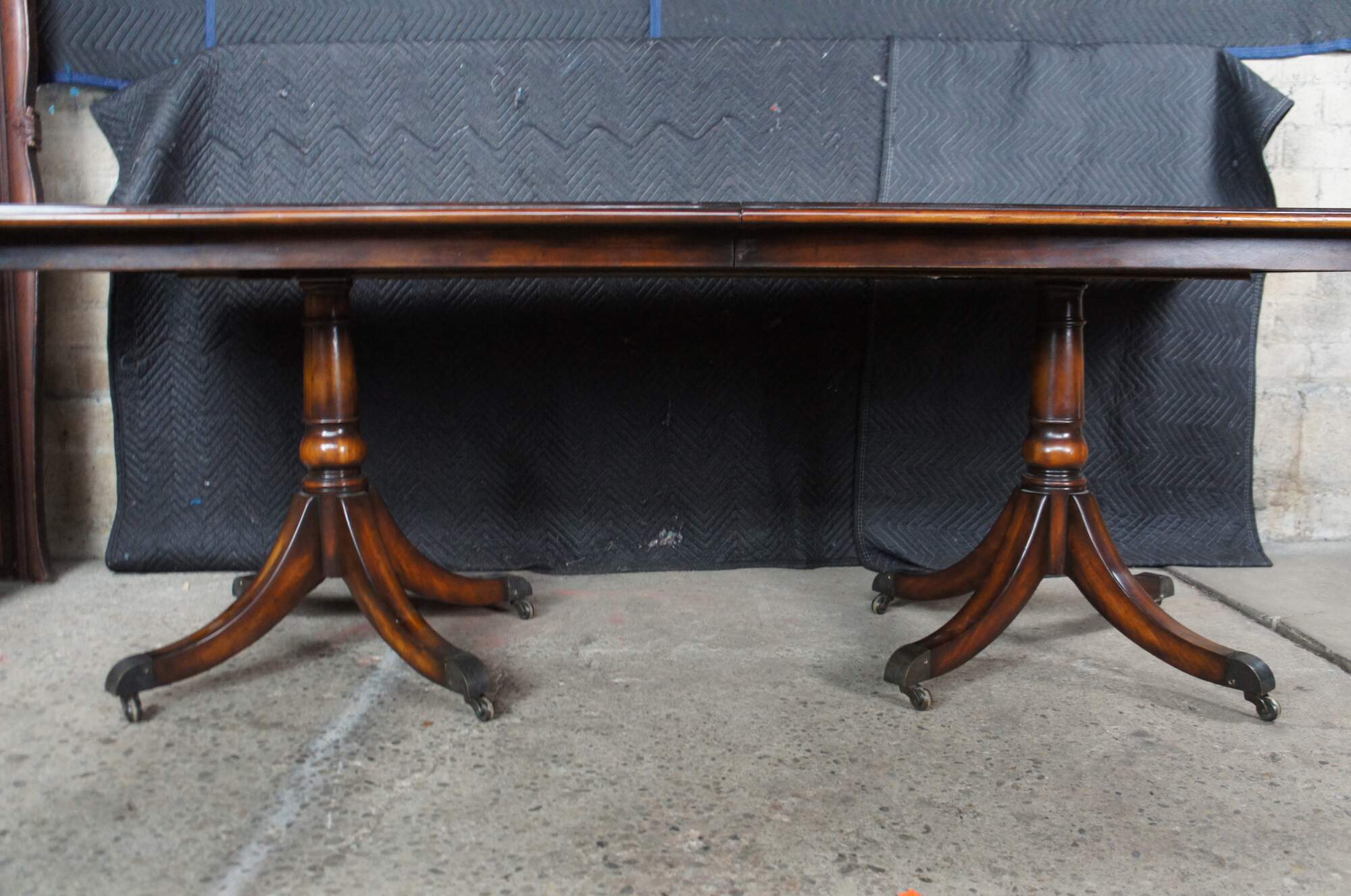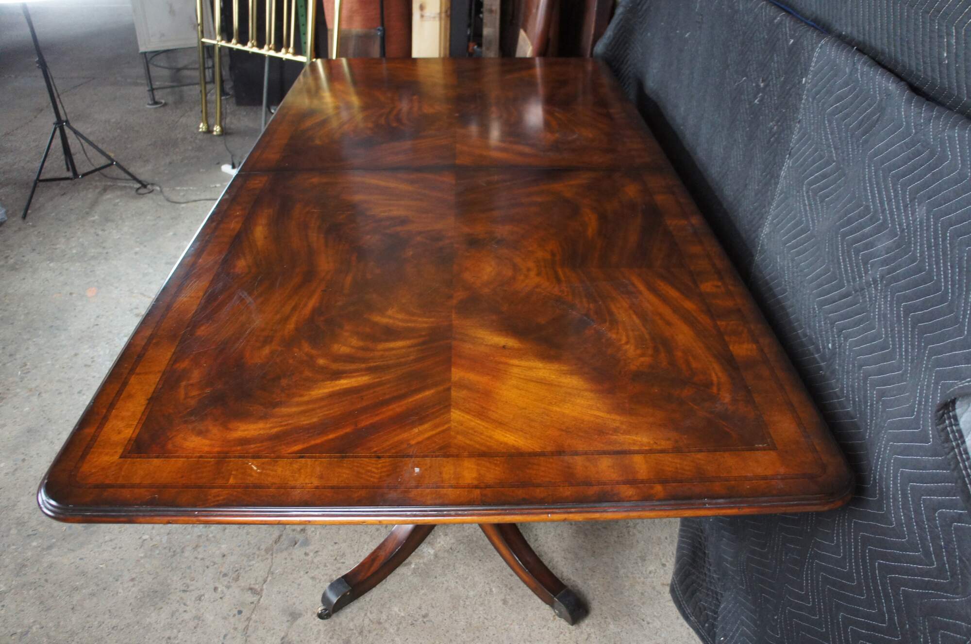 A beautiful Theodore Alexander English Regency style Dining Table, circa 2000s, Unmarked. Made from mahogany with a matchbook burled top with crossbanding and inlay over a double pedestal base. Pedestals are ring turned with downswept legs leading to brass capped feet with casters.