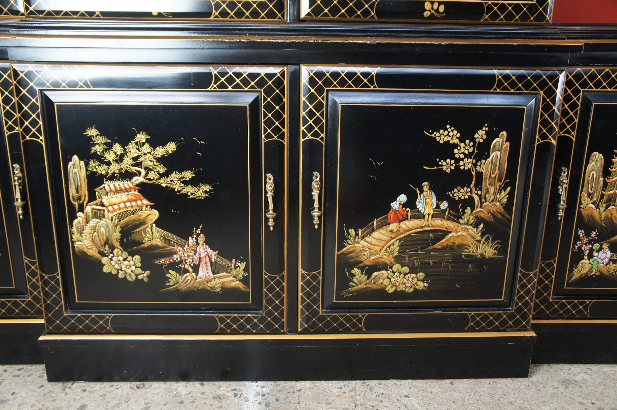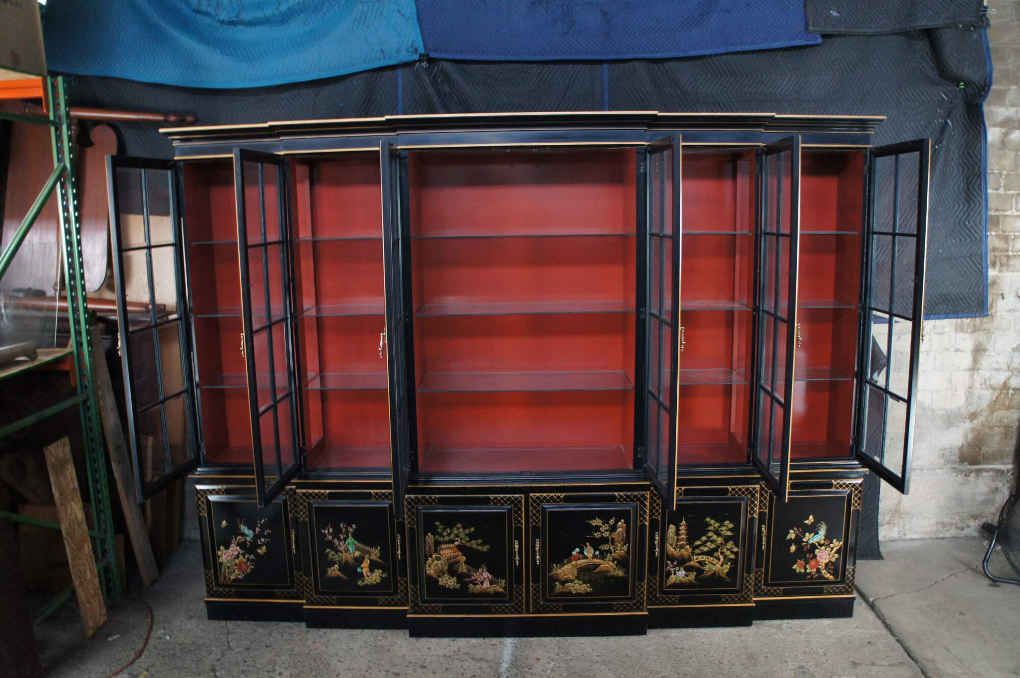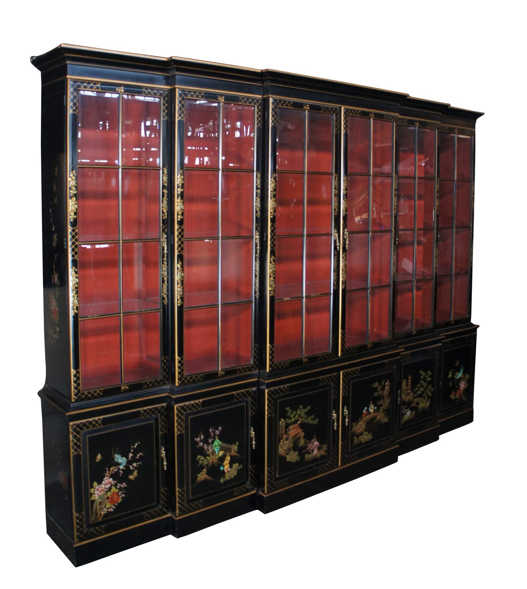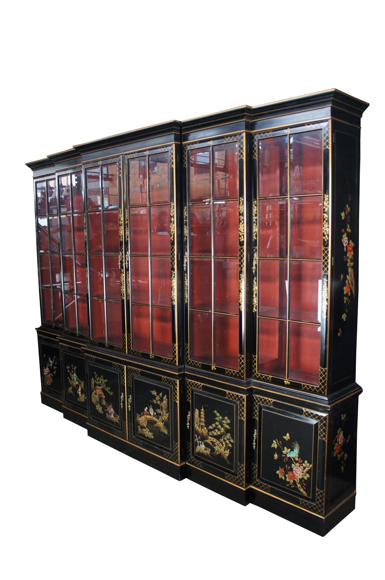 The Union National breakfront was rated as the finest breakfront in the world. In 1980, after flying in the magazines Lear jet to inspect the factory and the breakfront, the publisher of Leaders magazine rated it as the finest available anywhere in the world. If you've never heard of Leaders magazine, don't be surprised because if you aren't one of the worlds leaders, you can't even buy a copy. Built of solid maple and finished in hand rubbed black lacquer with 42 panes of hand beveled glass. The interior is painted in Chinese (Mandarin) red to contrast with the exterior and show off whatever is showcased within. The whole piece is hand striped in gold with snowflakes, fretwork and scrolls on each panel. To top it off Chinoiserie landscape designs were then hand painted on each door with birds, butterflys, flowers, figures / geishas and pagodas. Hand Signed along the lower right door by the artist P. Davis. Union National made fewer than 20 of these breakfronts per year while they were in business and even if 2 were ordered with the same description, each would be unique because the artwork was always original
