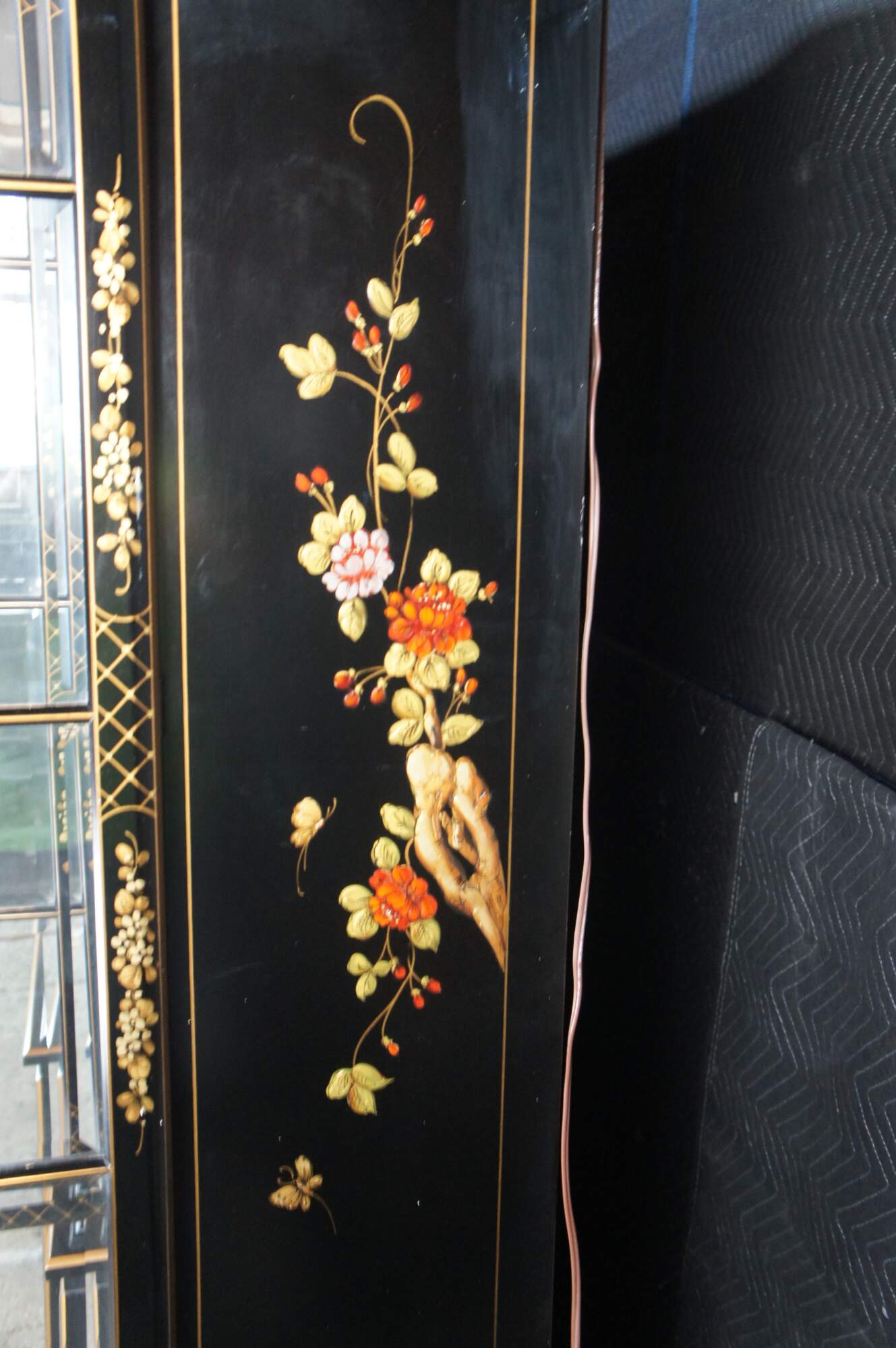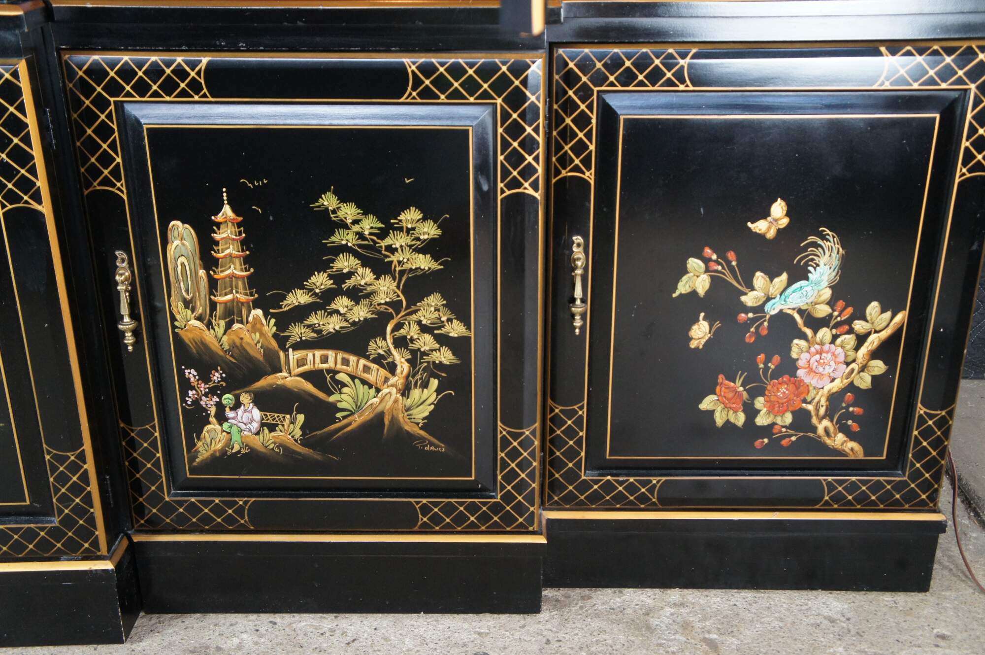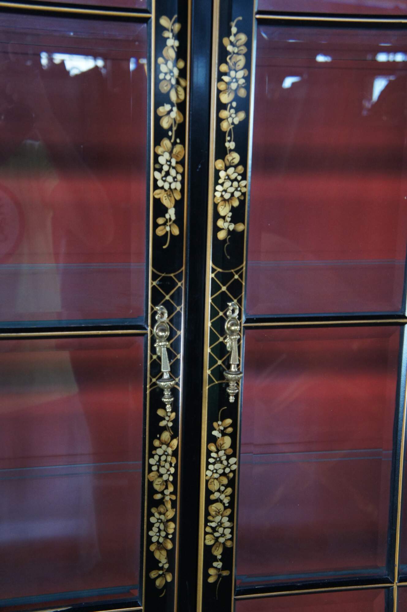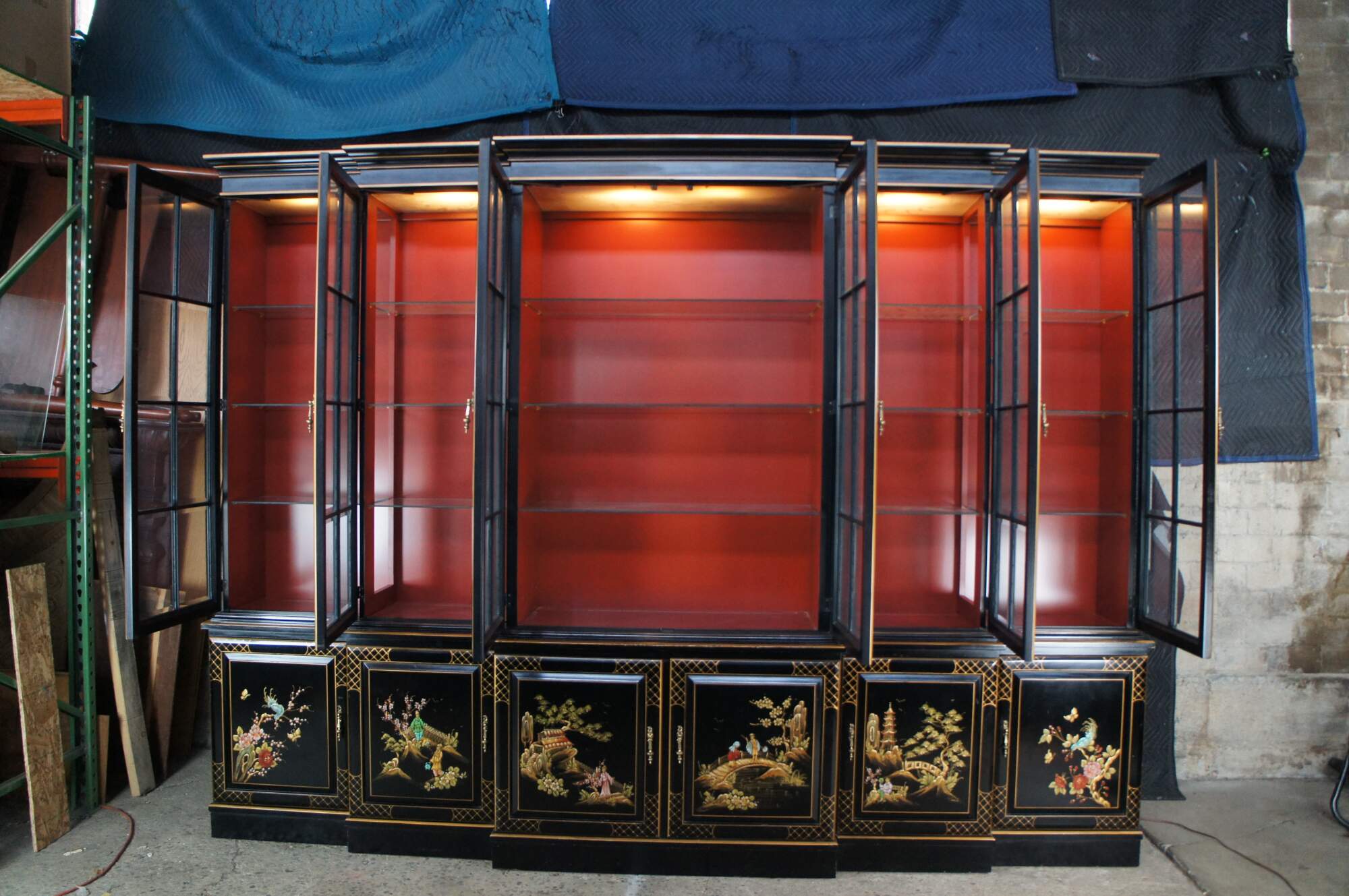 The Union National breakfront was rated as the finest breakfront in the world. In 1980, after flying in the magazines Lear jet to inspect the factory and the breakfront, the publisher of Leaders magazine rated it as the finest available anywhere in the world. If you've never heard of Leaders magazine, don't be surprised because if you aren't one of the worlds leaders, you can't even buy a copy. Built of solid maple and finished in hand rubbed black lacquer with 42 panes of hand beveled glass. The interior is painted in Chinese (Mandarin) red to contrast with the exterior and show off whatever is showcased within. The whole piece is hand striped in gold with snowflakes, fretwork and scrolls on each panel. To top it off Chinoiserie landscape designs were then hand painted on each door with birds, butterflys, flowers, figures / geishas and pagodas. Hand Signed along the lower right door by the artist P. Davis. Union National made fewer than 20 of these breakfronts per year while they were in business and even if 2 were ordered with the same description, each would be unique because the artwork was always original