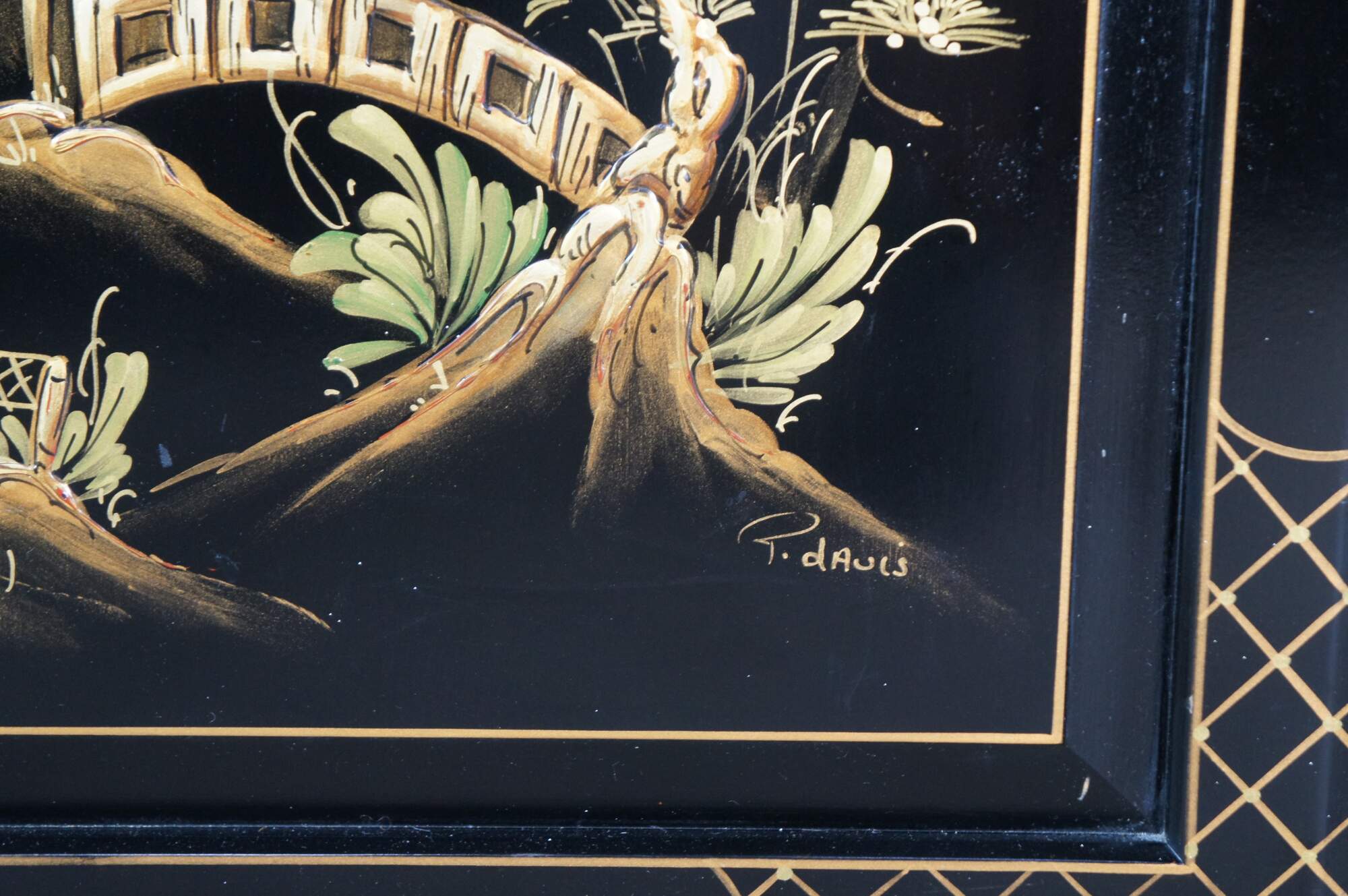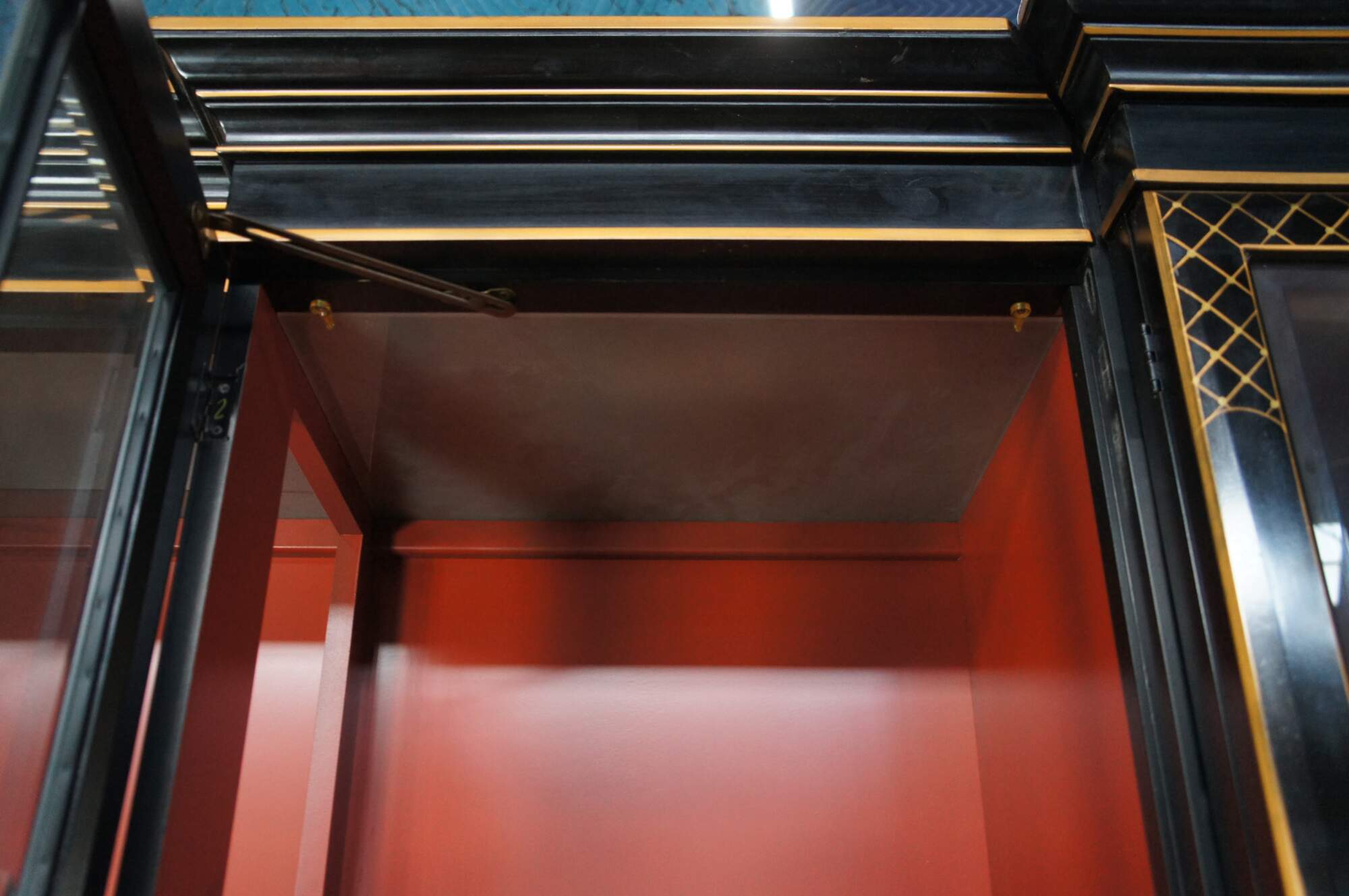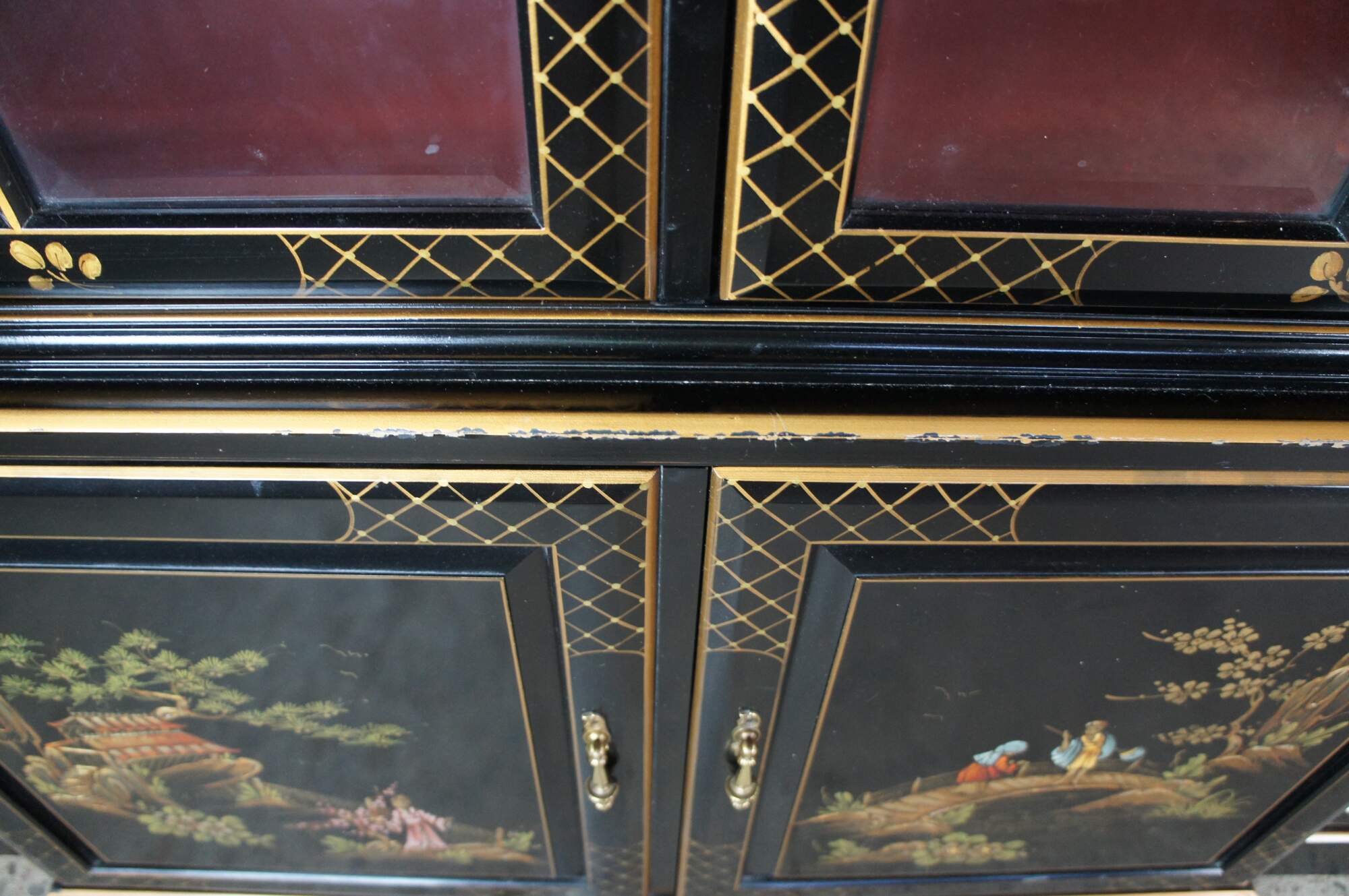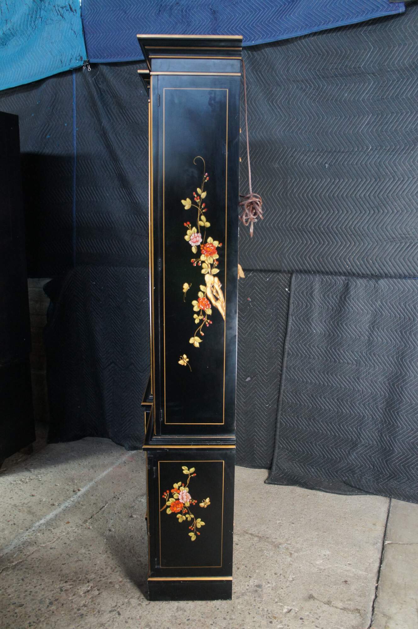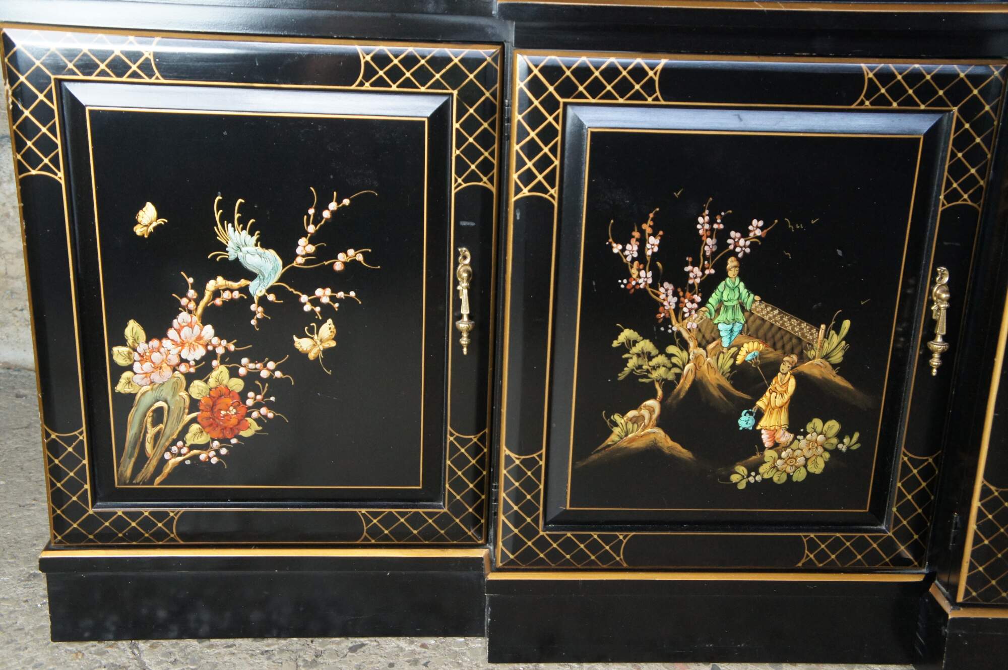 The Union National breakfront was rated as the finest breakfront in the world. In 1980, after flying in the magazines Lear jet to inspect the factory and the breakfront, the publisher of Leaders magazine rated it as the finest available anywhere in the world. If you've never heard of Leaders magazine, don't be surprised because if you aren't one of the worlds leaders, you can't even buy a copy. Built of solid maple and finished in hand rubbed black lacquer with 42 panes of hand beveled glass. The interior is painted in Chinese (Mandarin) red to contrast with the exterior and show off whatever is showcased within. The whole piece is hand striped in gold with snowflakes, fretwork and scrolls on each panel. To top it off Chinoiserie landscape designs were then hand painted on each door with birds, butterflys, flowers, figures / geishas and pagodas. Hand Signed along the lower right door by the artist P. Davis. Union National made fewer than 20 of these breakfronts per year while they were in business and even if 2 were ordered with the same description, each would be unique because the artwork was always original