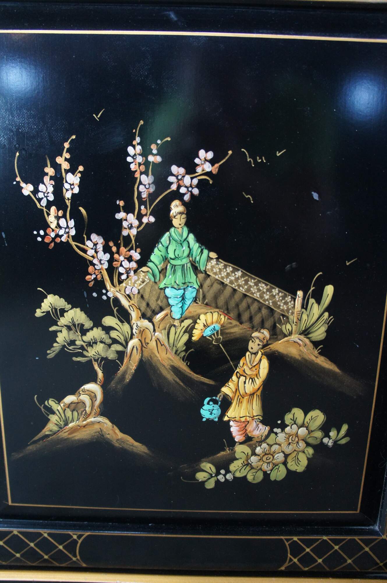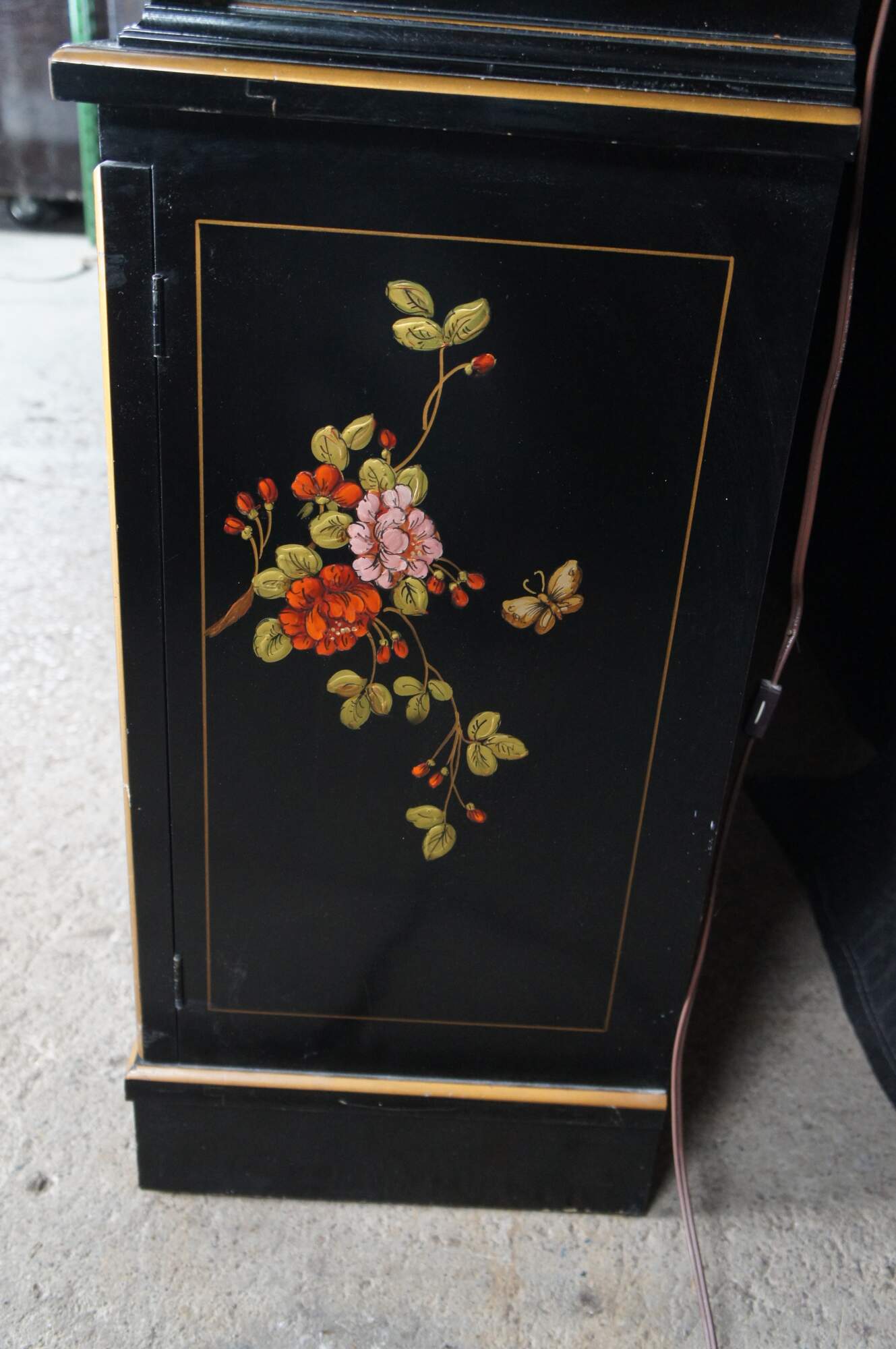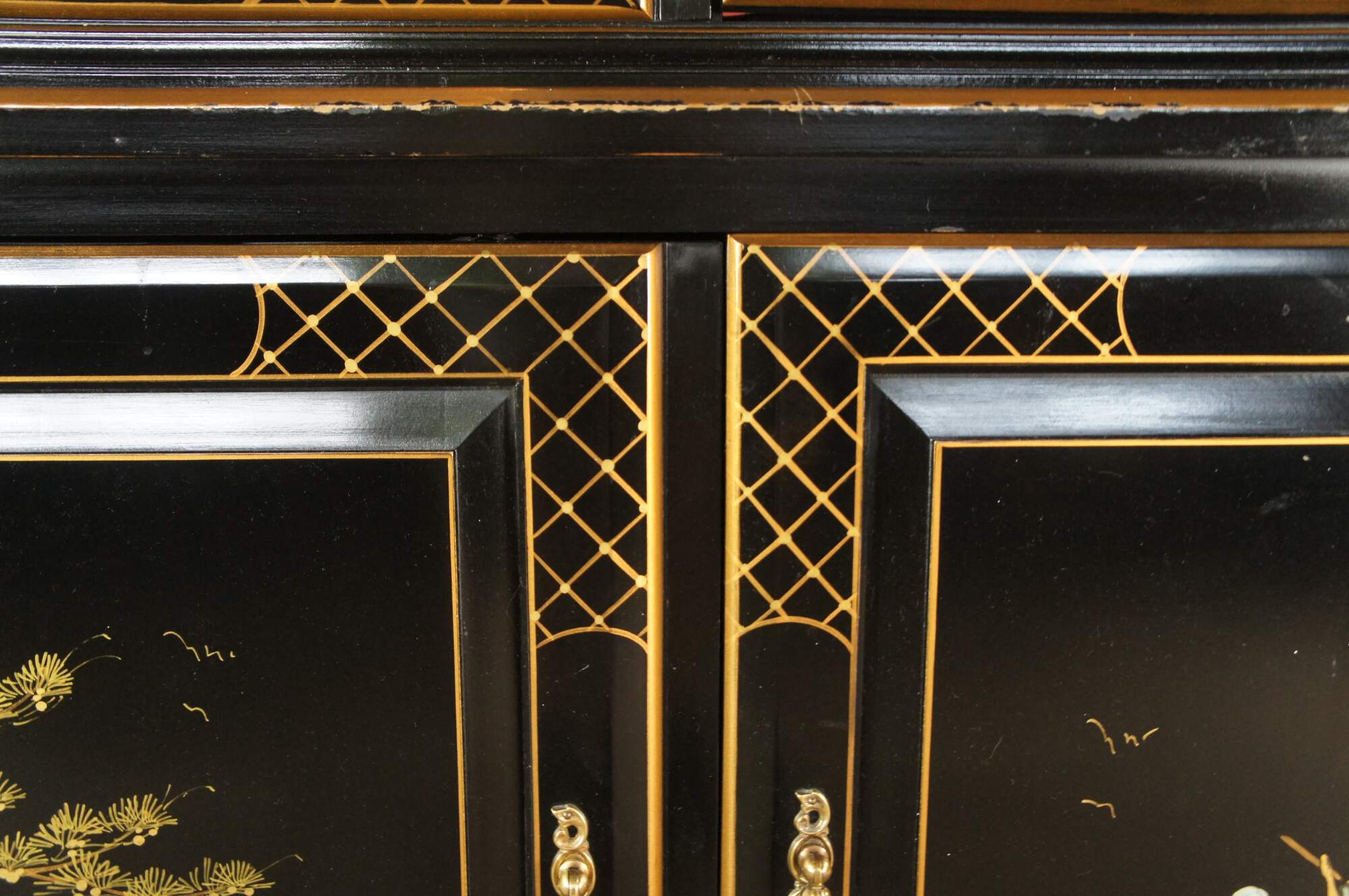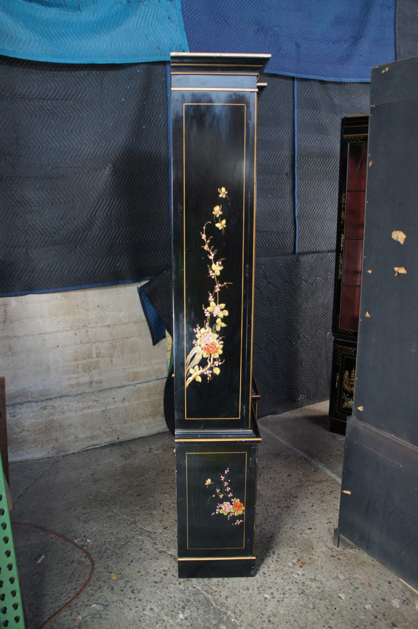 The Union National breakfront was rated as the finest breakfront in the world. In 1980, after flying in the magazines Lear jet to inspect the factory and the breakfront, the publisher of Leaders magazine rated it as the finest available anywhere in the world. If you've never heard of Leaders magazine, don't be surprised because if you aren't one of the worlds leaders, you can't even buy a copy. Built of solid maple and finished in hand rubbed black lacquer with 42 panes of hand beveled glass. The interior is painted in Chinese (Mandarin) red to contrast with the exterior and show off whatever is showcased within. The whole piece is hand striped in gold with snowflakes, fretwork and scrolls on each panel. To top it off Chinoiserie landscape designs were then hand painted on each door with birds, butterflys, flowers, figures / geishas and pagodas. Hand Signed along the lower right door by the artist P. Davis. Union National made fewer than 20 of these breakfronts per year while they were in business and even if 2 were ordered with the same description, each would be unique because the artwork was always original