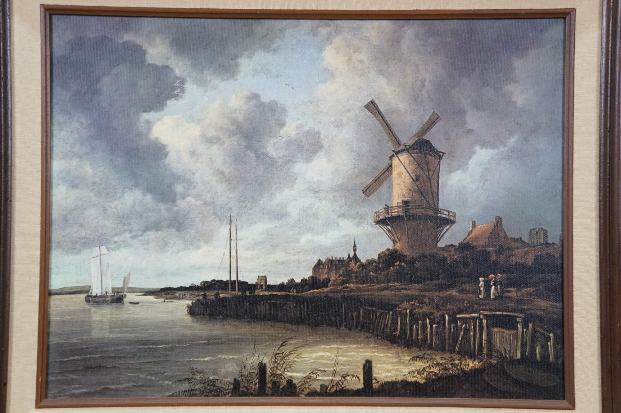 Vintage print on canvas depicting "The Windmill at Wijk bij Duurstede" by Jacob von Ruisdael. Show a landscape view of a large windmill at the edge of a river with boat and several figures on the shore. Framed in 1983. Beveled wood frame with white linen mat.