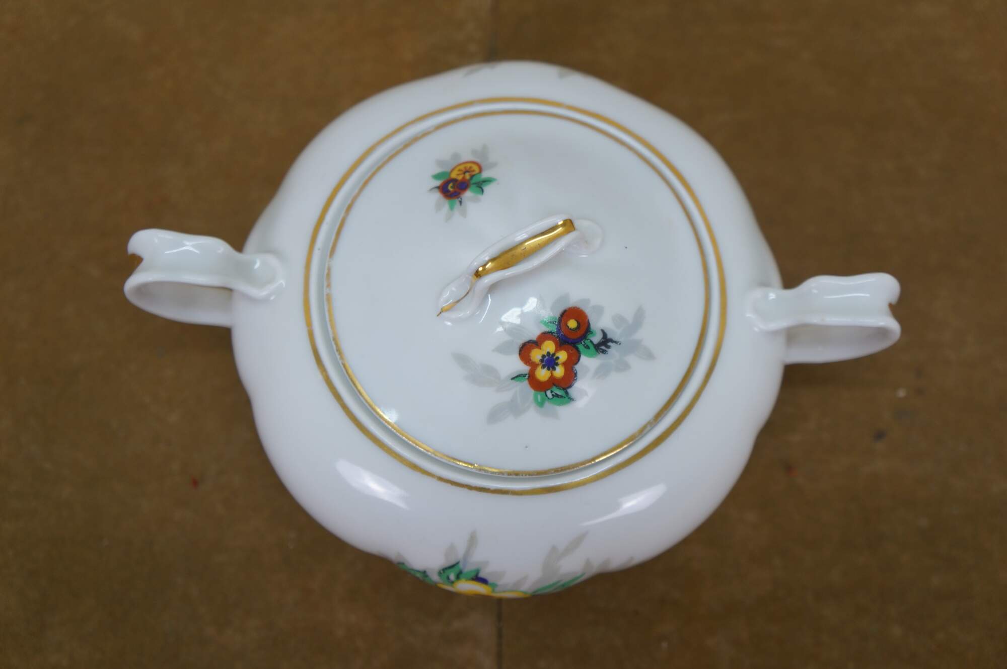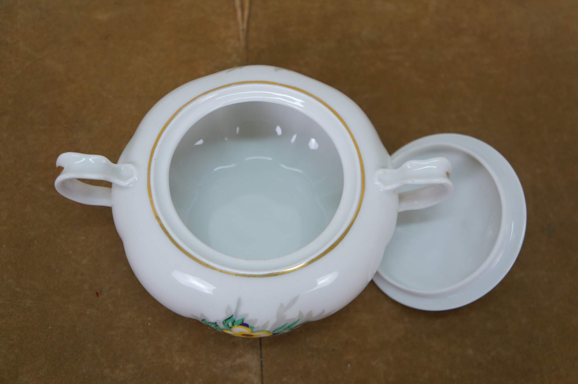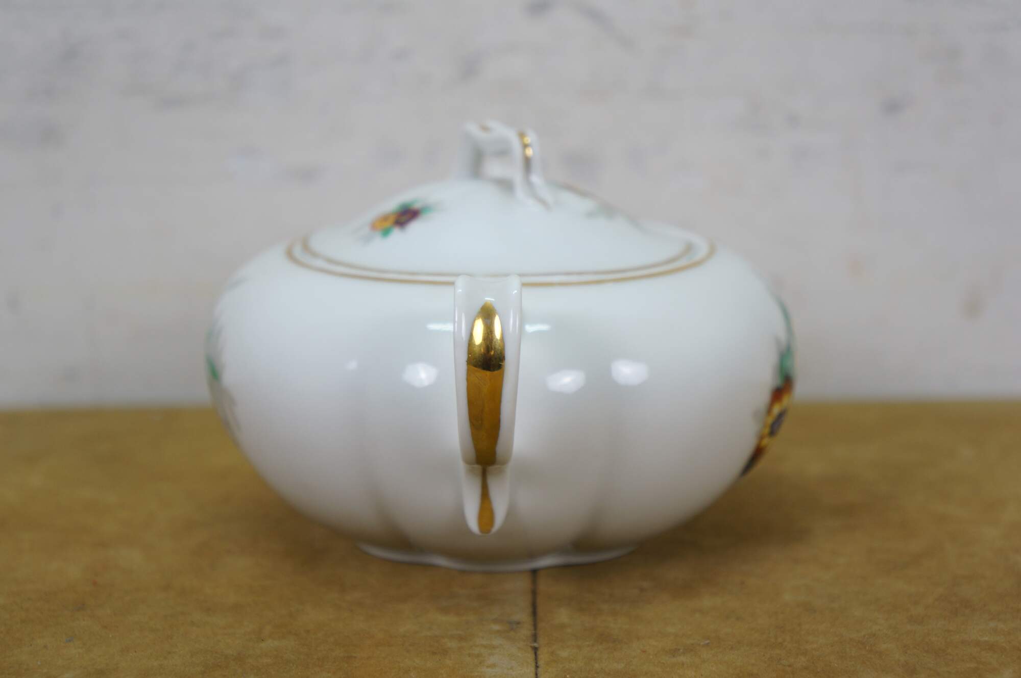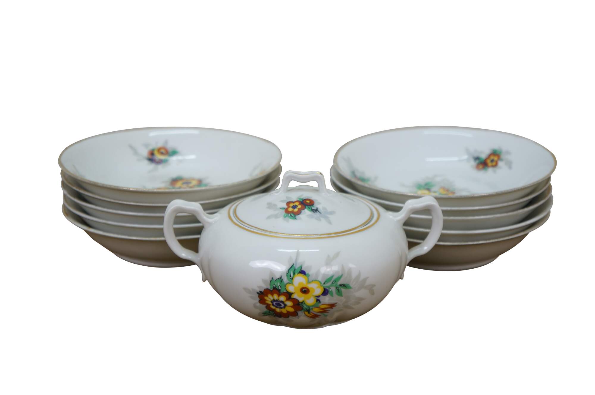 Early to mid 20th century set of ten custard dishes and sugar bowl with lid. White porcelain with gilr edge and printed floral design in red, yellow, green, and gray. Attributed to Pierre & Paul Paroutaud.
