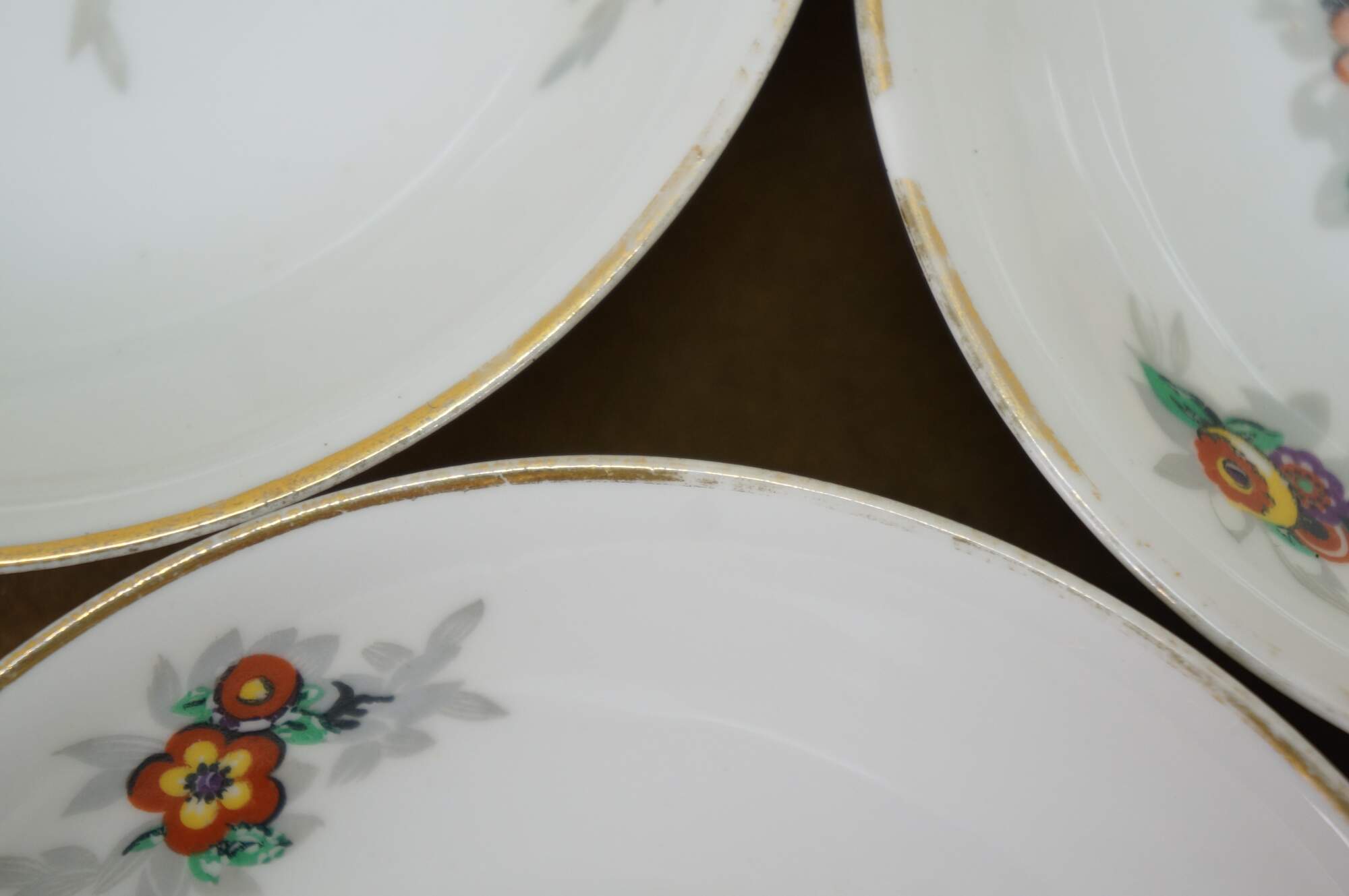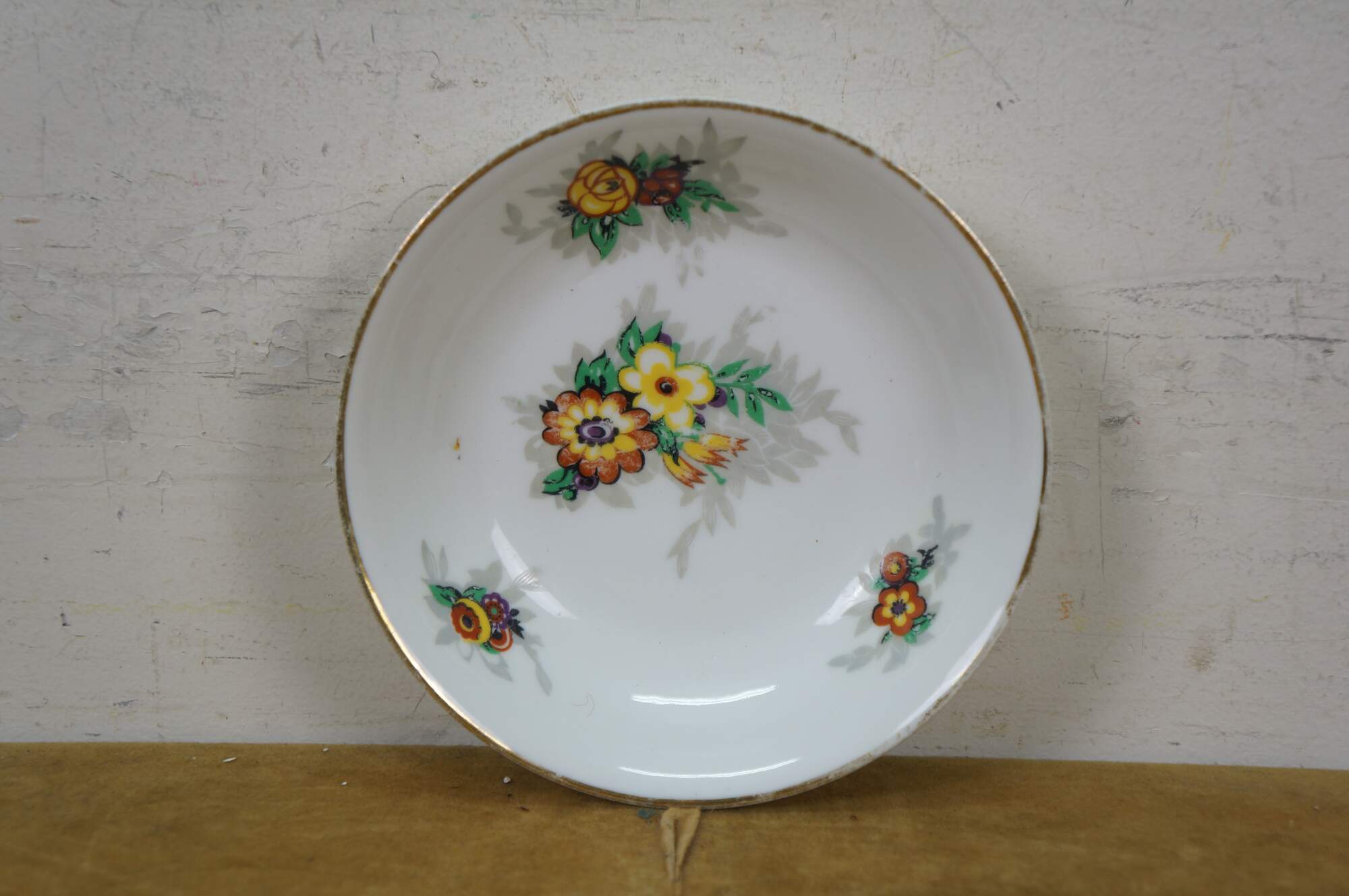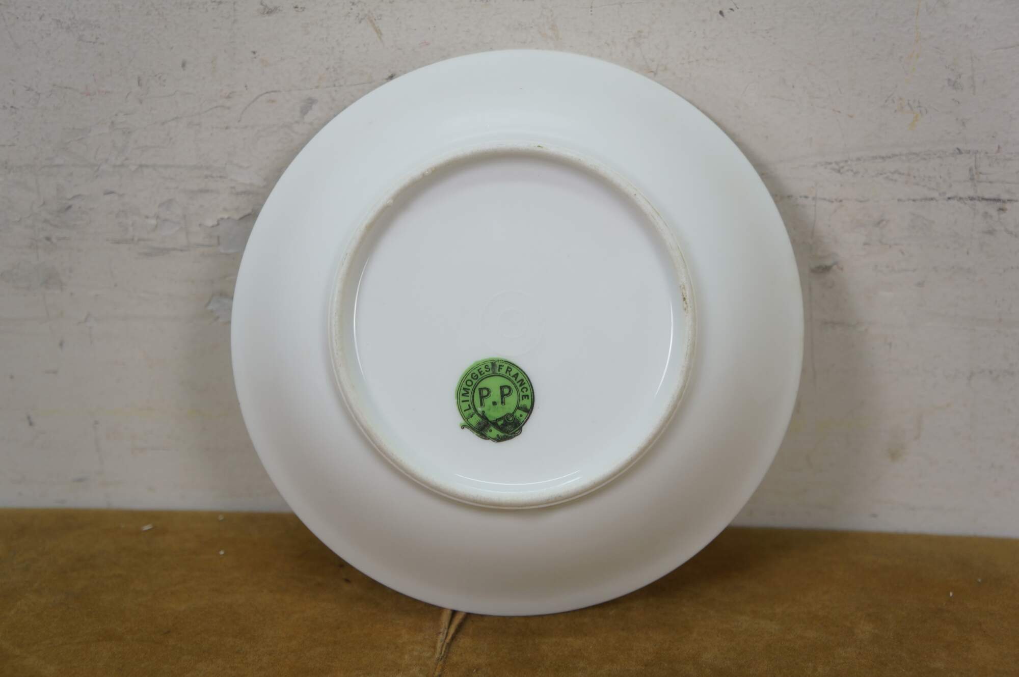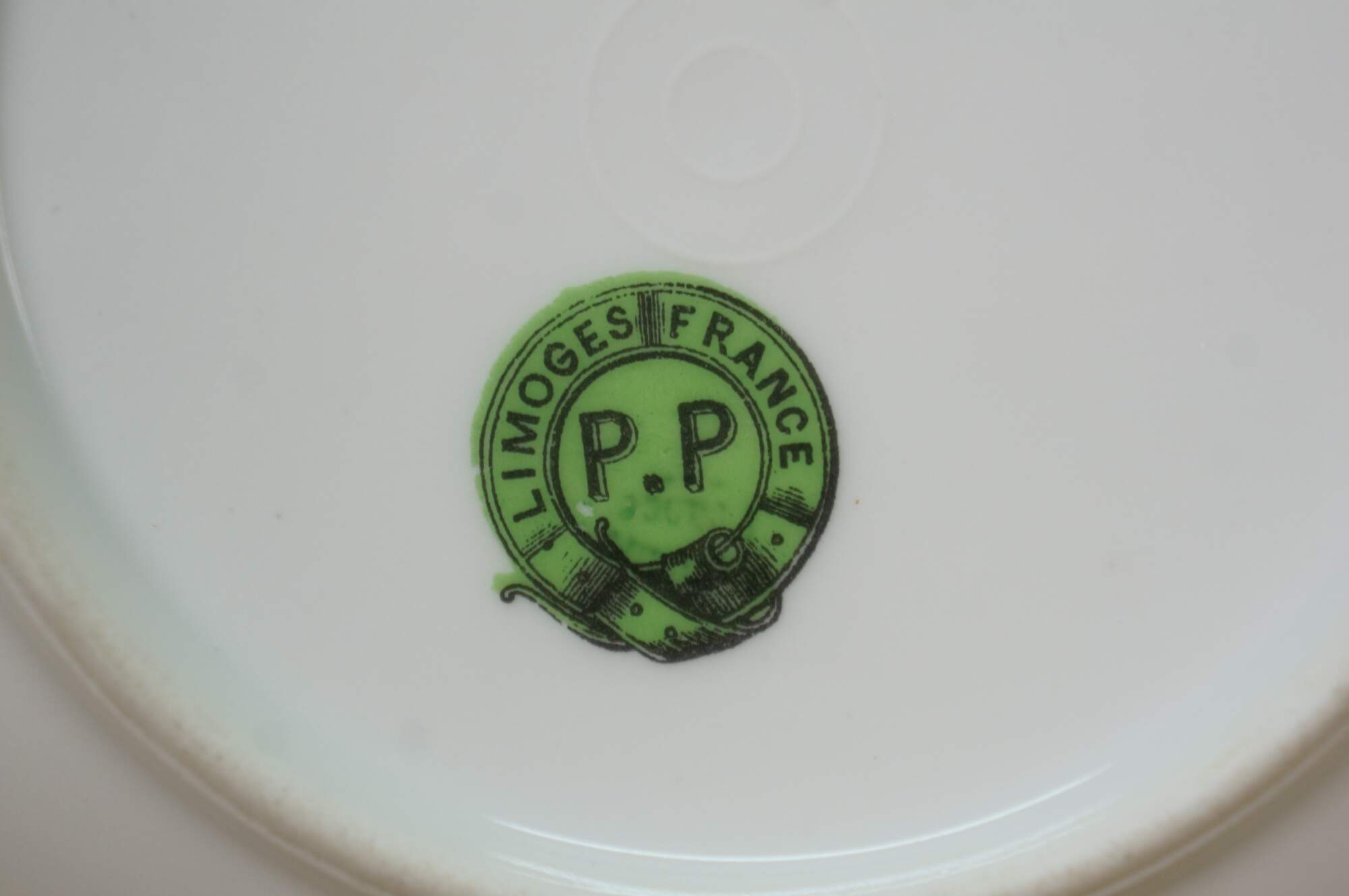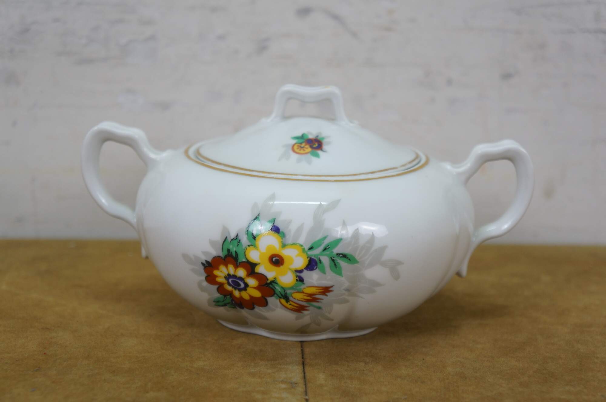 Early to mid 20th century set of ten custard dishes and sugar bowl with lid. White porcelain with gilr edge and printed floral design in red, yellow, green, and gray. Attributed to Pierre & Paul Paroutaud.