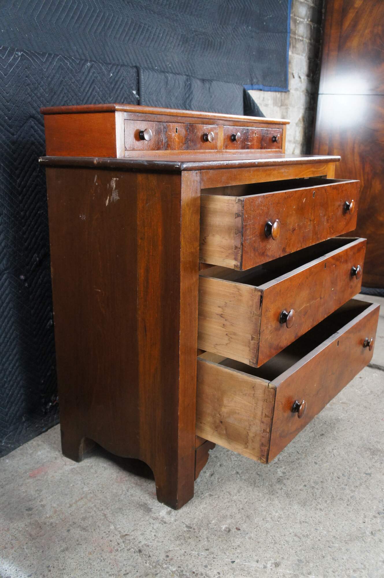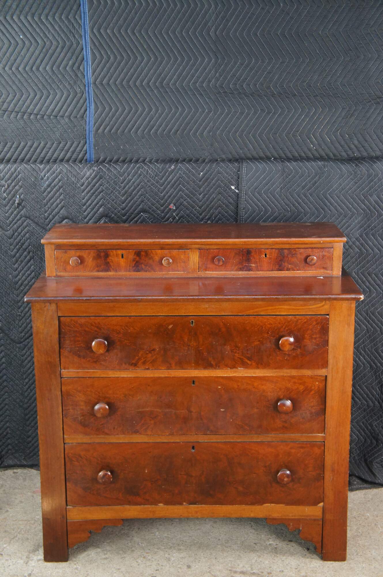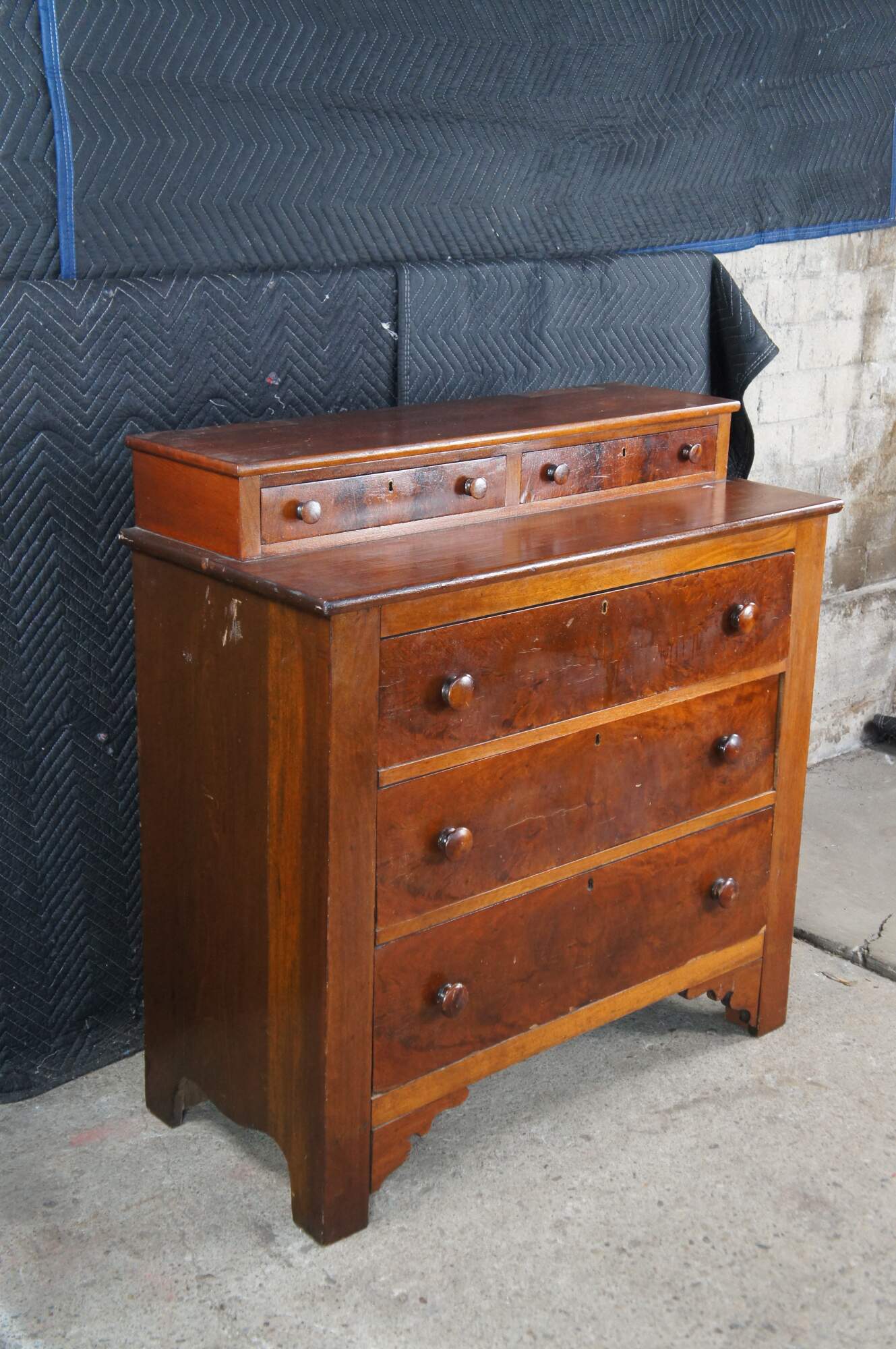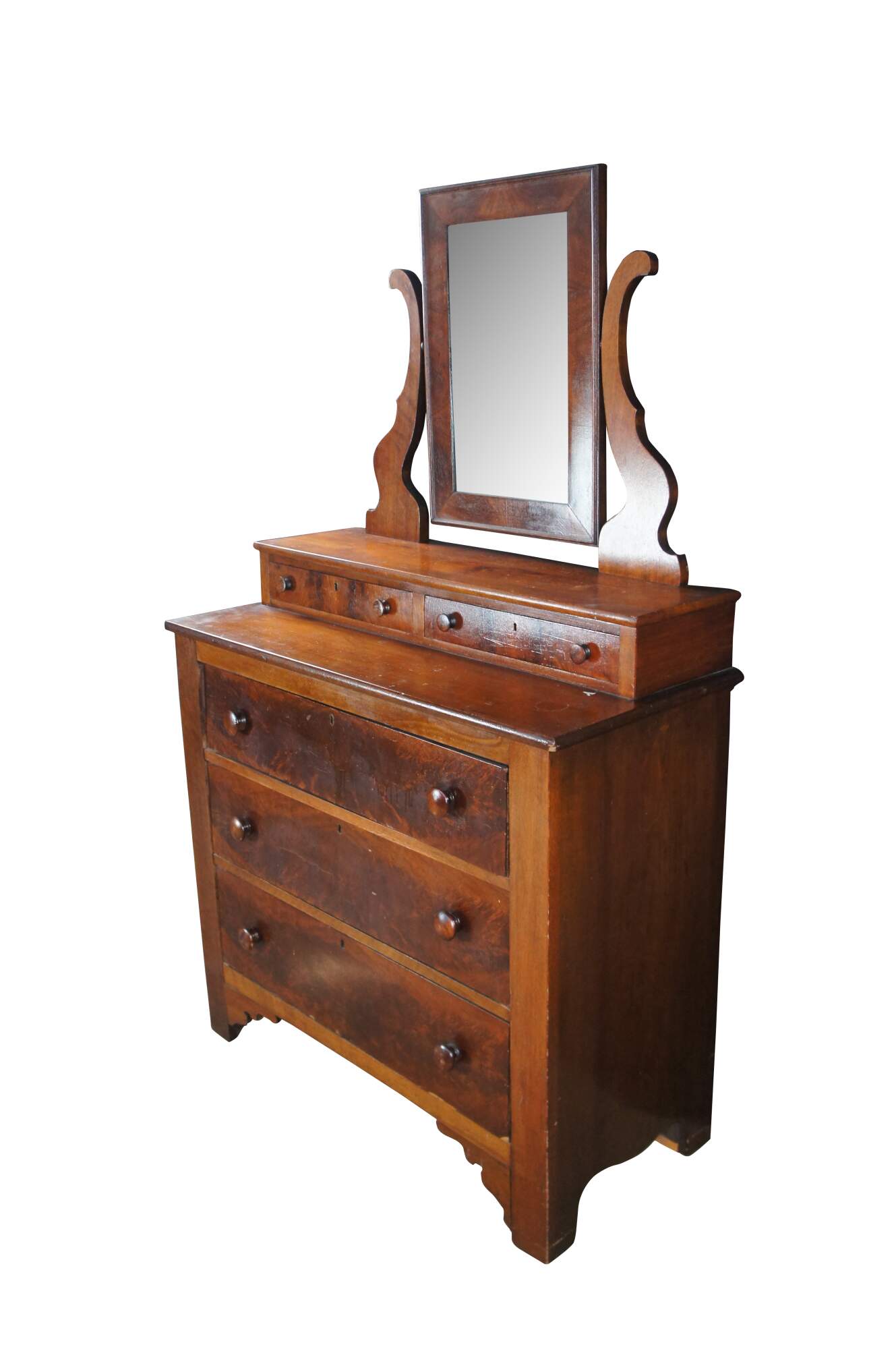 Antique Victorian Era Stepback Dresser & Mirror, c. 1870s. Made from walnut with crotch walnut veneered drawer fronts. Features a wishbone swivel mirror over two gloveboxes and a case with three hand dovetailed drawers.
