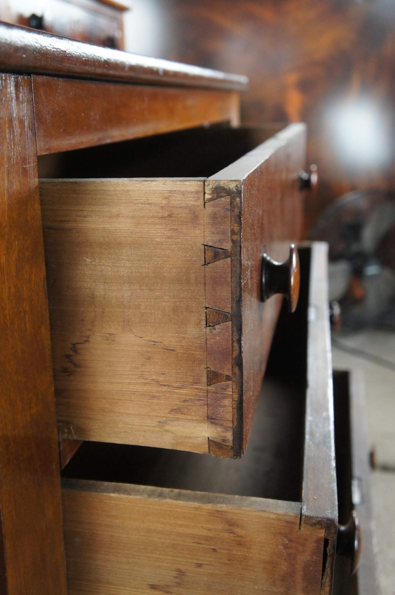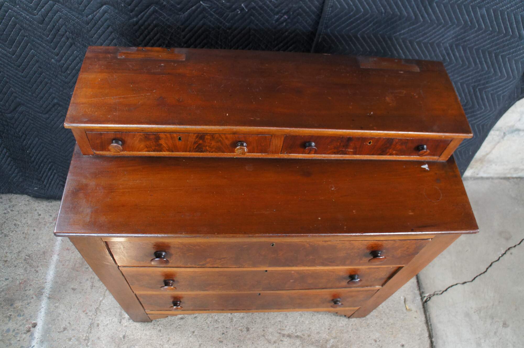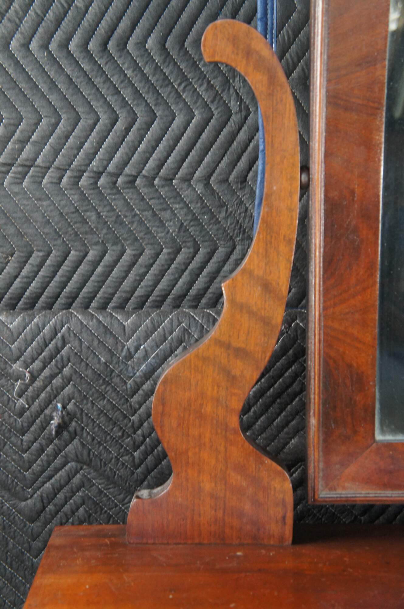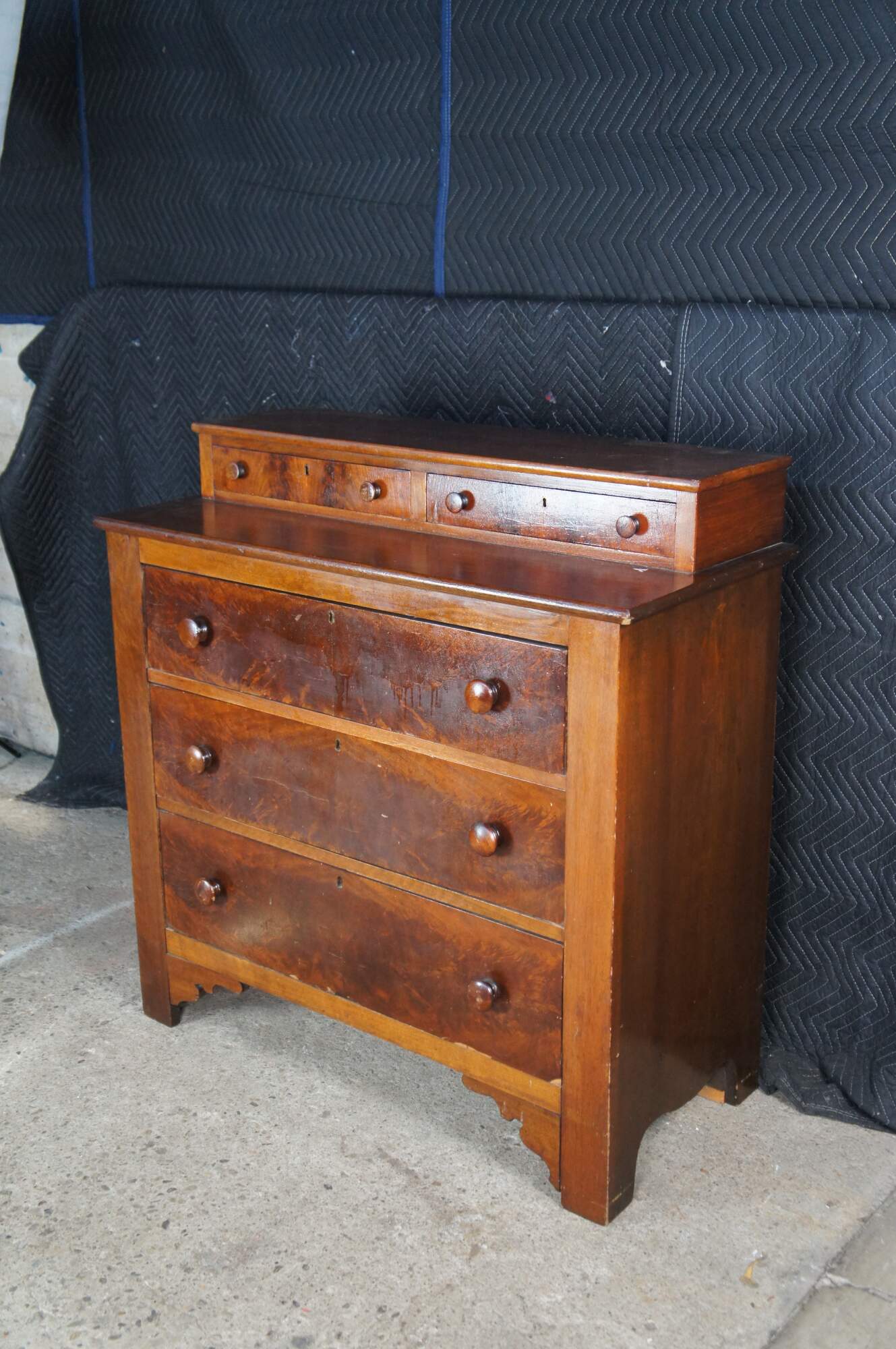 Antique Victorian Era Stepback Dresser & Mirror, c. 1870s. Made from walnut with crotch walnut veneered drawer fronts. Features a wishbone swivel mirror over two gloveboxes and a case with three hand dovetailed drawers.