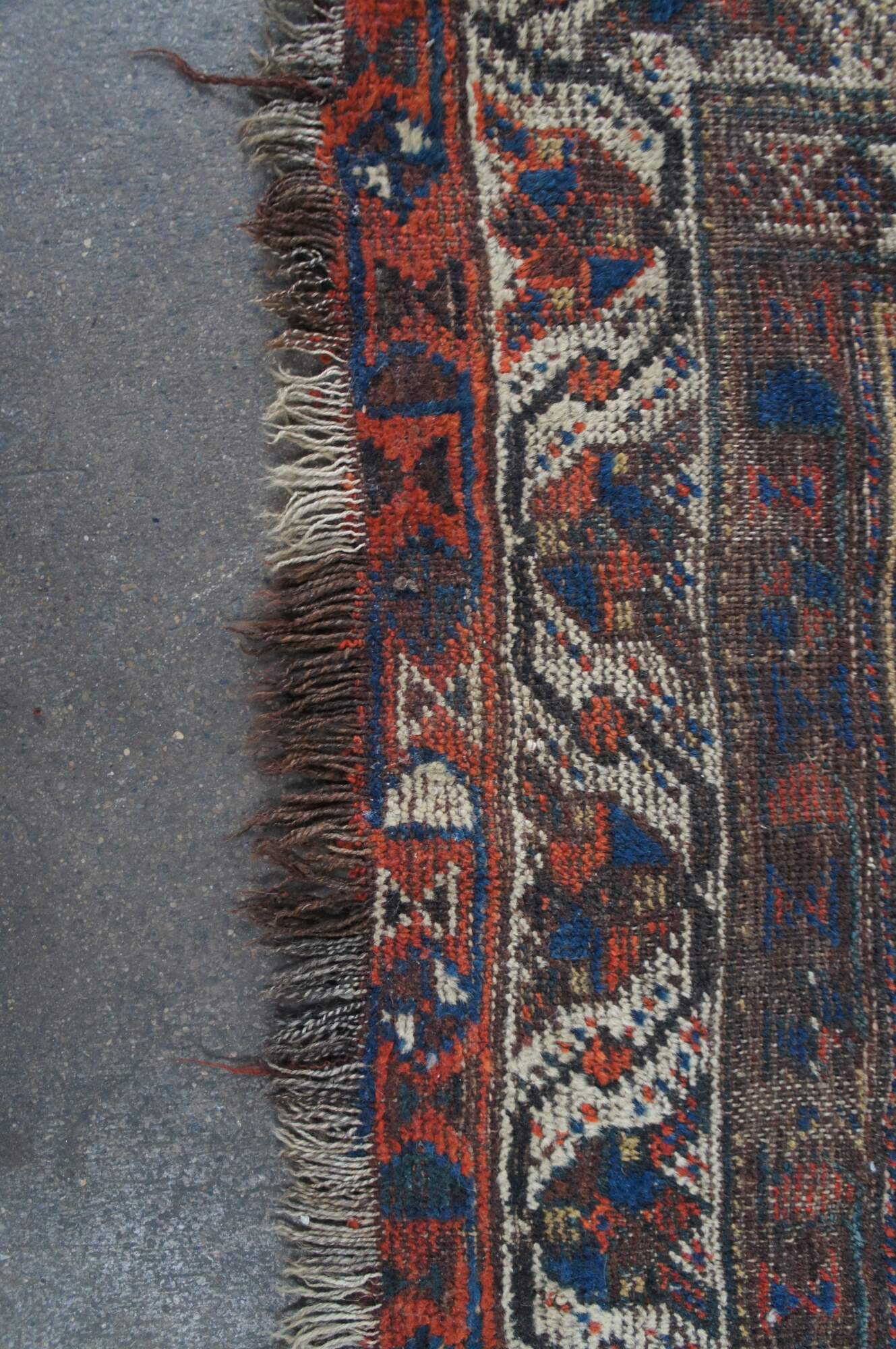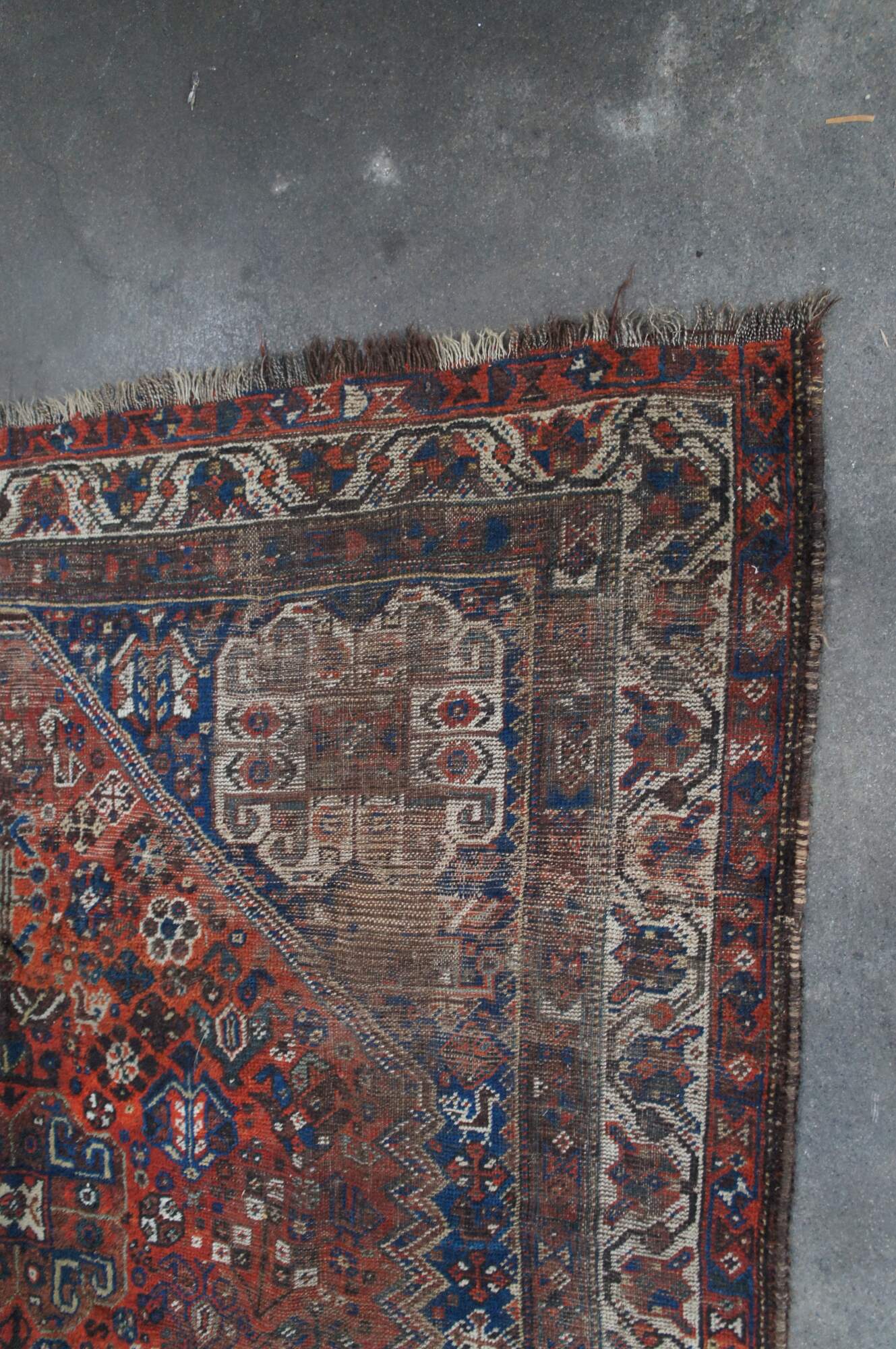 A beautiful vintage hand woven wool area rug. Features a geometric pattern with red and blue foreground accented by beige.