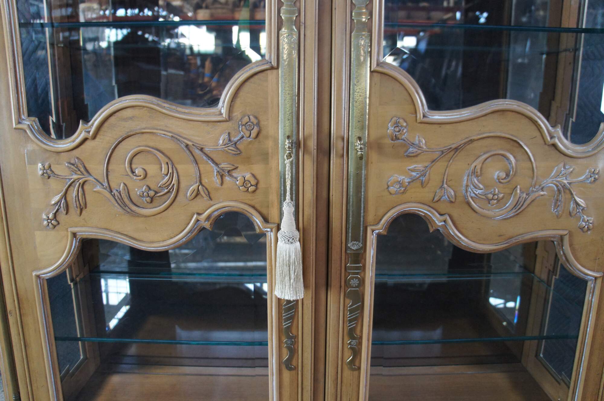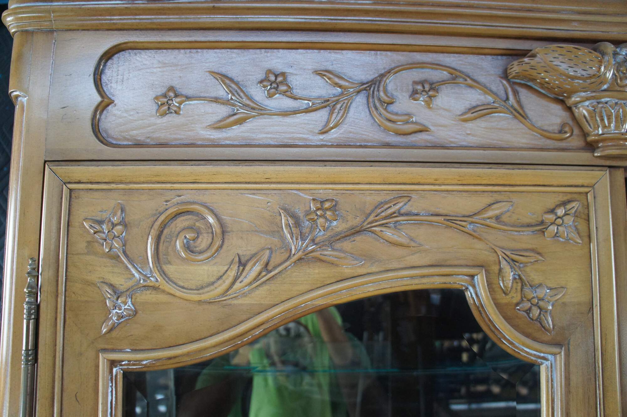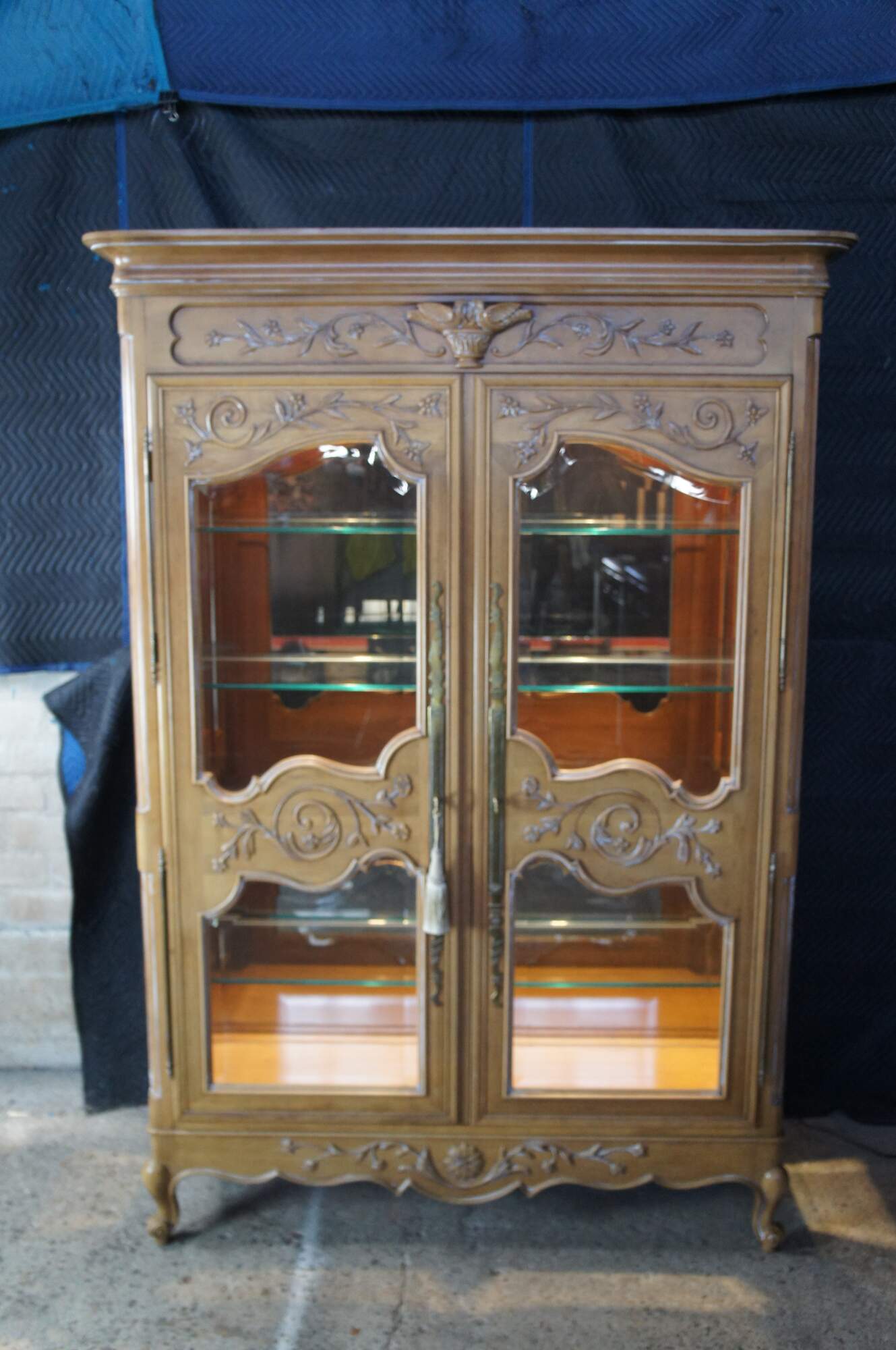 Large and impressive Louis XV / French Provincial style display cabinet, circa 1990. Features a stoud fruitwood frame with carved foliate and songbirds. The Cabinet opens to an illuminated interior with mirrored back and three glass shelves. The case is supported by cabriole scrolled legs along the front and tapered legs at the rear.