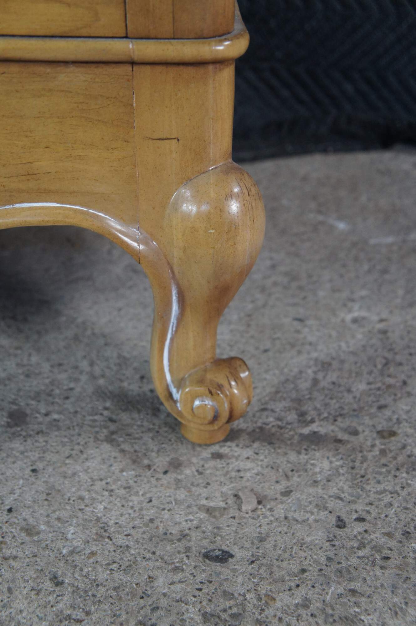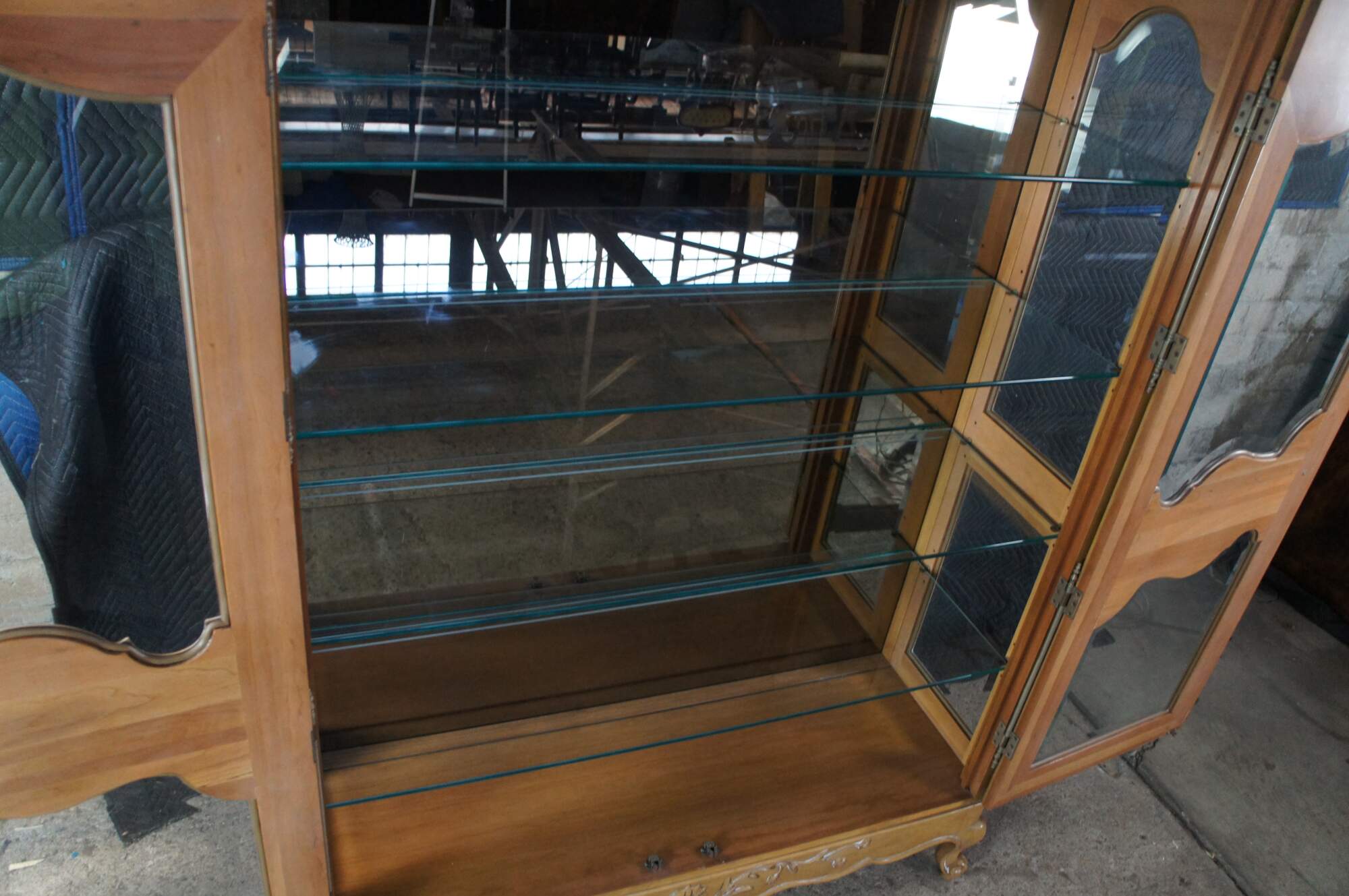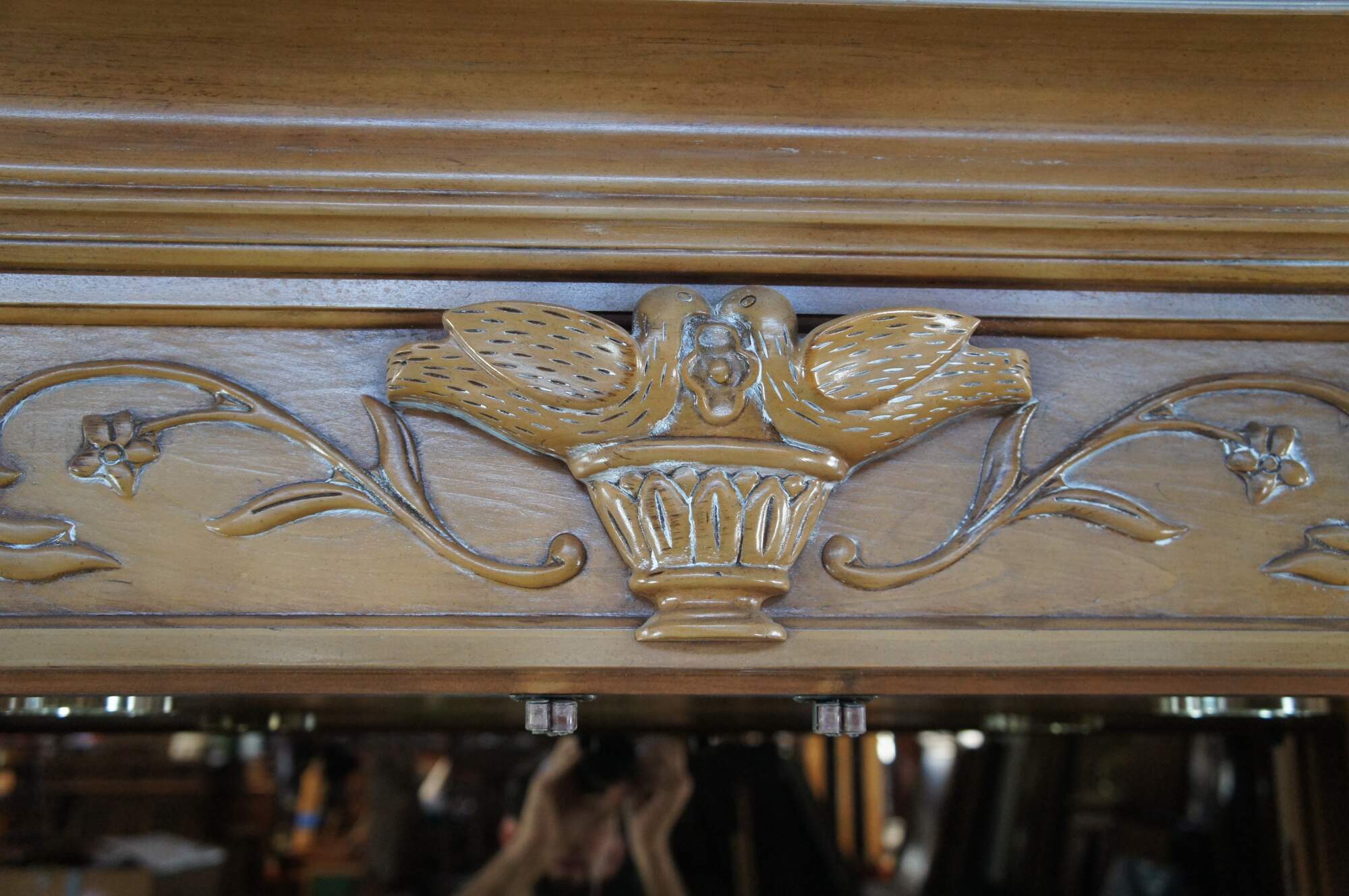 Large and impressive Louis XV / French Provincial style display cabinet, circa 1990. Features a stoud fruitwood frame with carved foliate and songbirds. The Cabinet opens to an illuminated interior with mirrored back and three glass shelves. The case is supported by cabriole scrolled legs along the front and tapered legs at the rear.