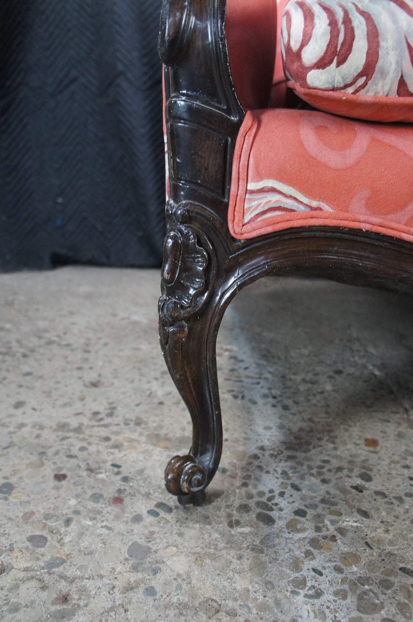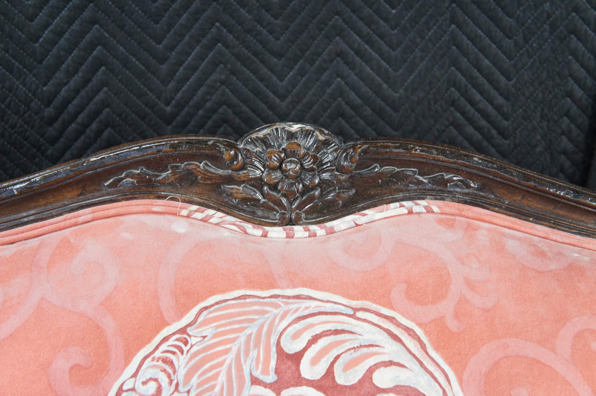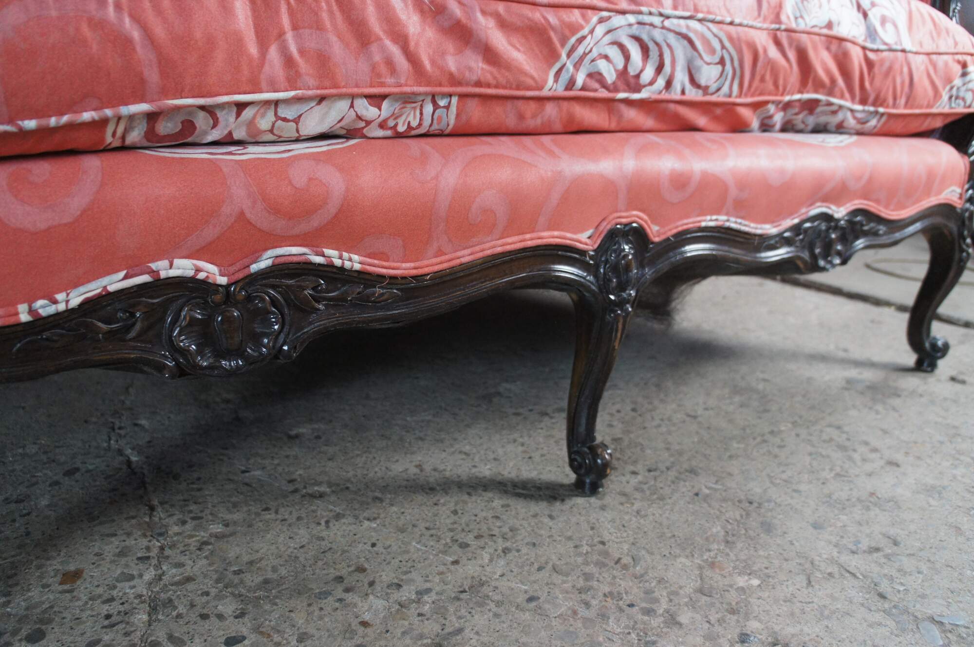 Vintage Meyer Gunther Martini Italian Baroque Louis XV Inspired Sofa, circa 1970. Features a hardwood frame with floral carved medallions and chinoiserie fabric. Supported by cabriole legs with scrolled feet.