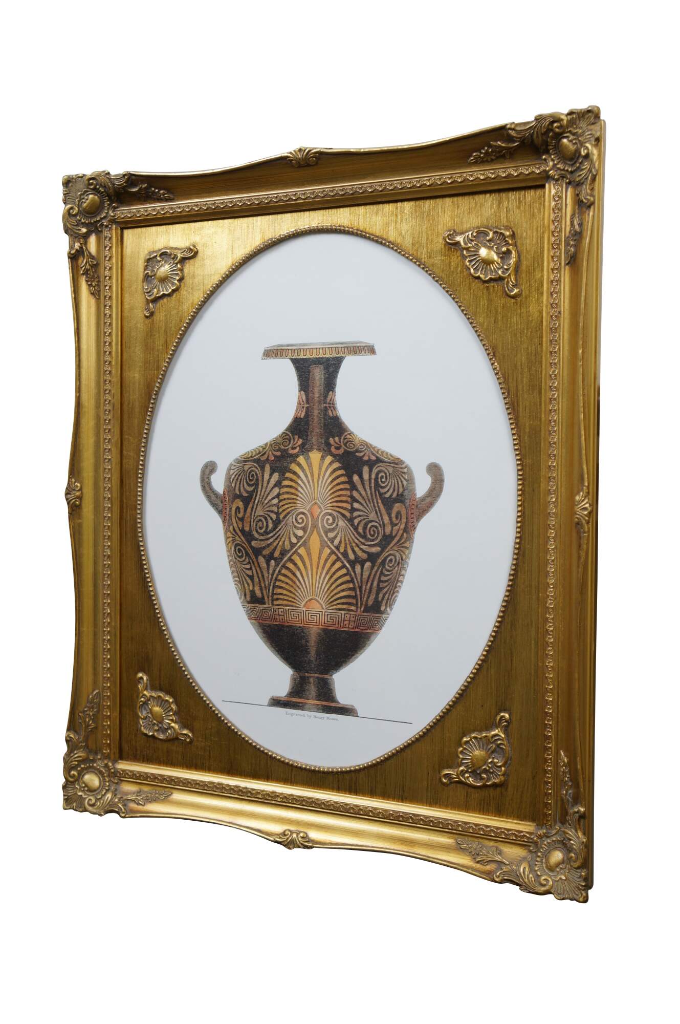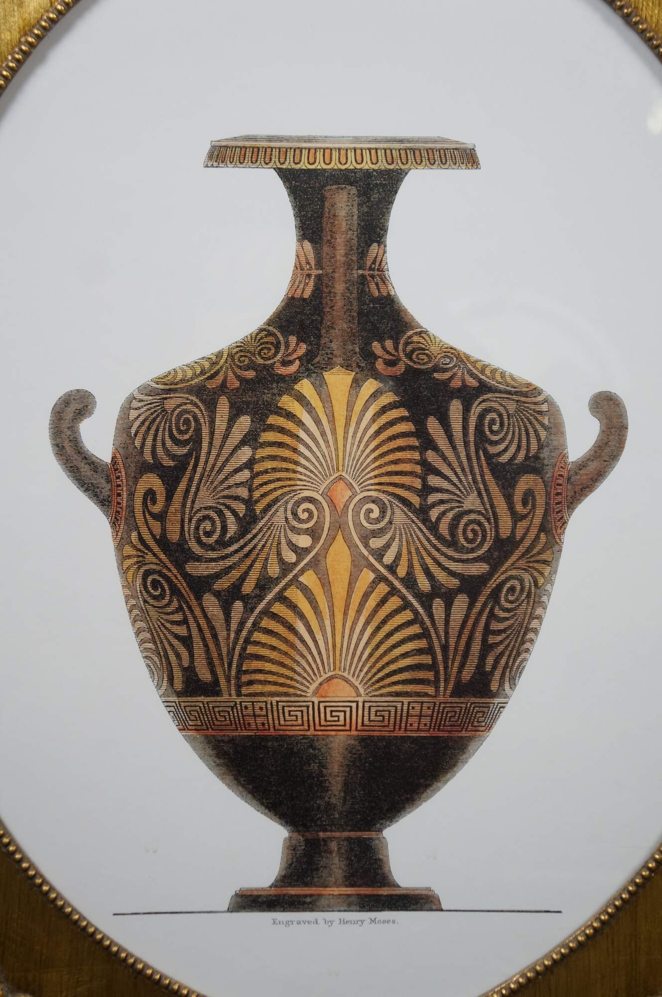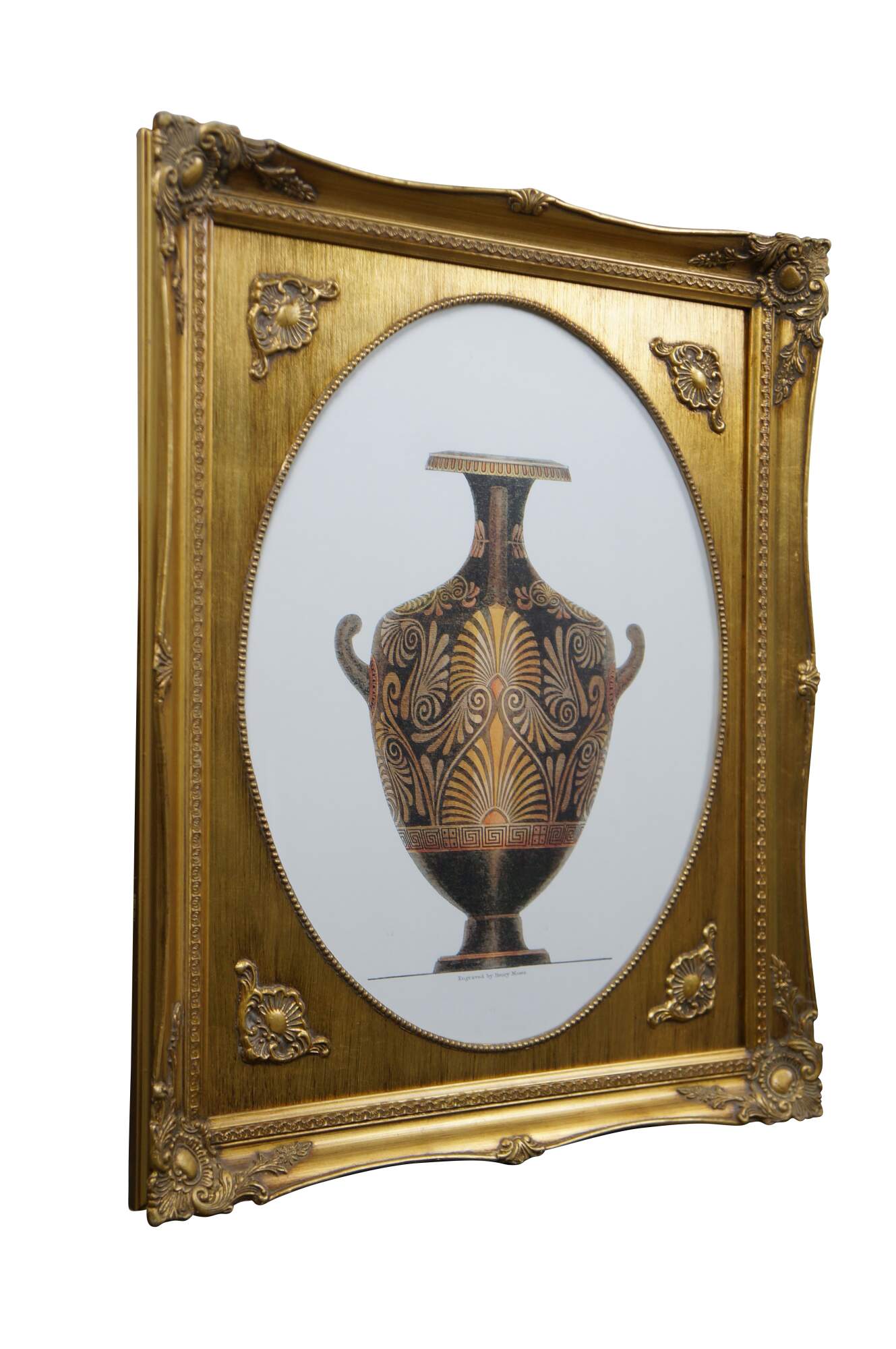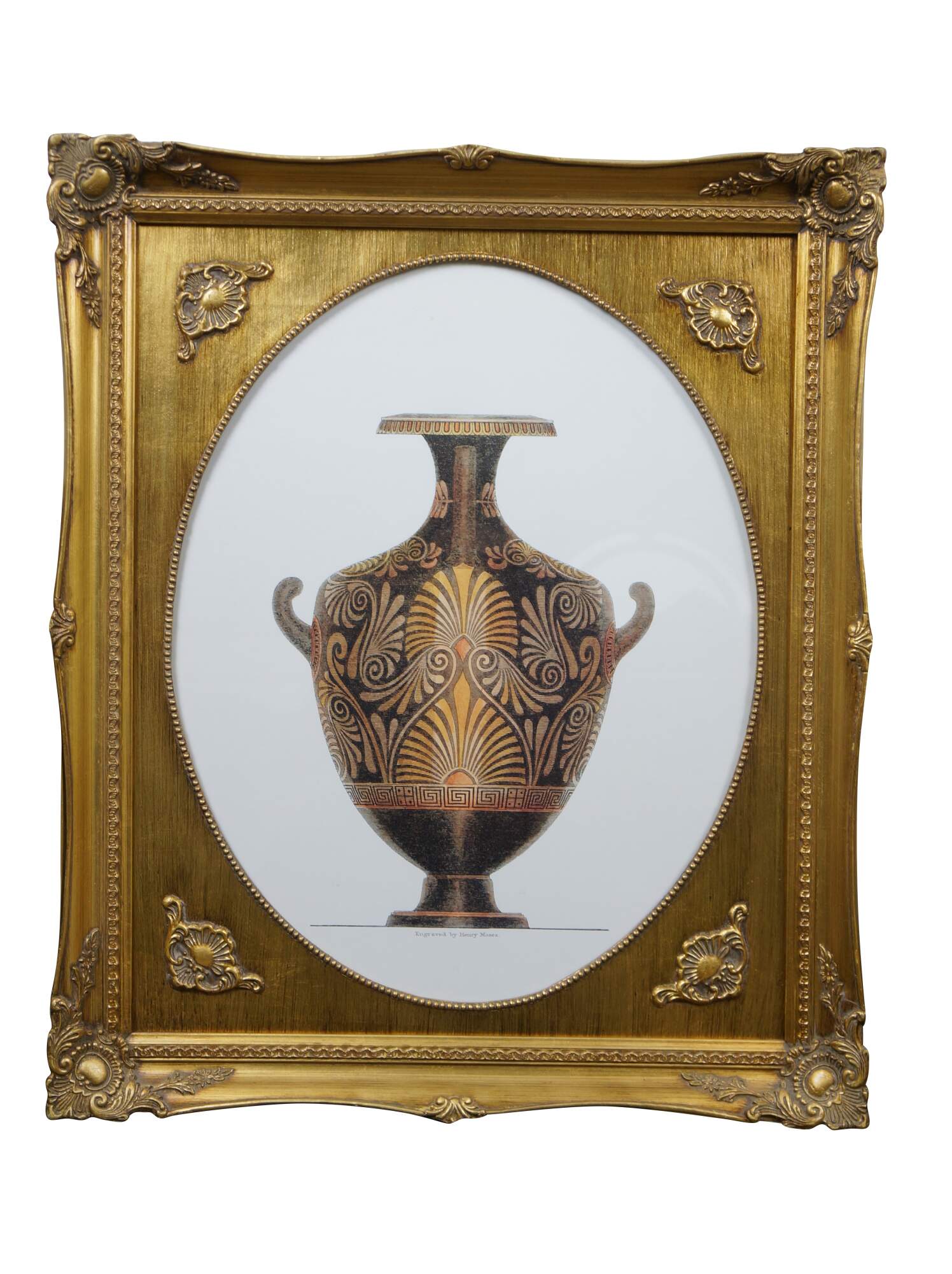 Late 20th century print after an engraving by Henry Moses, depicting a black and gold ancient Etruscan vase / urn. Broad gilt frame with scallop and foliate corners / accents.