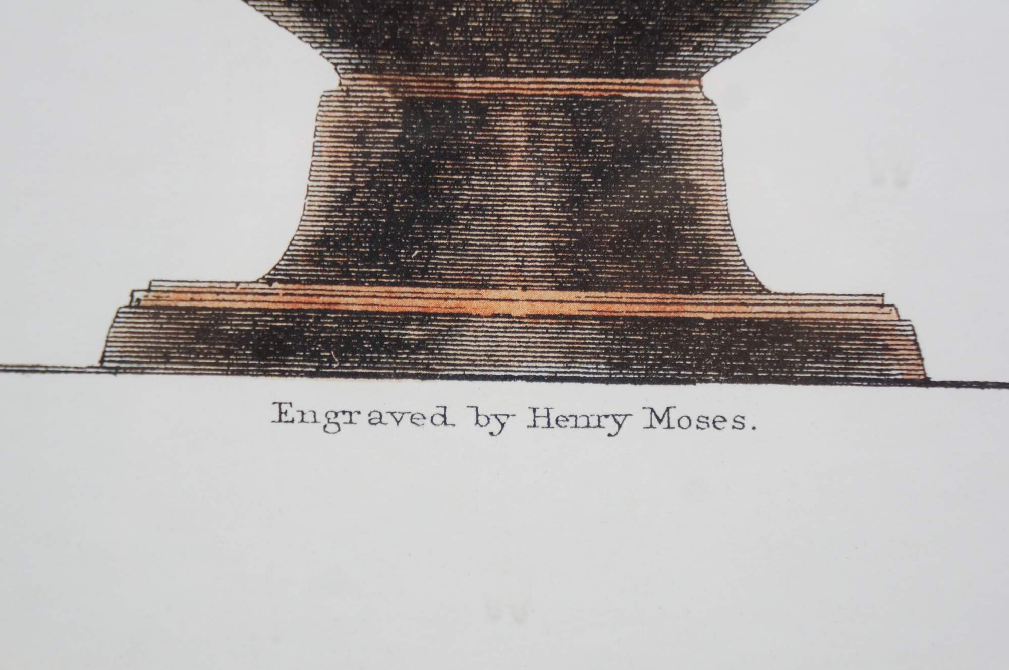 "Henry Moses was an English engraver. He died at Cowley, Middlesex, 28 February 1870. He was one of the engravers employed on the official publication Ancient Marbles in the British Museum, 1812-1845. Other works included: The Decision of the Flower by Henry Moses after Moritz Retzsch, illustration to Goethe's Faust I The Gallery of Pictures painted by Benjamin West, 12 plates, 1811 (patronage of Thomas Hope); A Collection of Antique Vases, Altars, &c., from various Museums and Collections, 170 plates, 1814; Select Greek and Roman Antiquities, 36 plates, 1817; Vases from the Collection of Sir Henry Englefield, 40 plates, 1819; Examples of Ornamental Sculpture in Architecture, drawn by L. Vulliamy, 36 plates, 1823; Illustrations to Goethe's Faust, after Moritz Retzsch, 26 plates, 1821; Illustrations to Schiller's Fridolin and Fight with the Dragon, 1824 and 1825; Georg Heinrich Noehden's Specimens of Ancient Coins of Magna Graecia and Sicily, 24 stipple plates, 1826; Works of Canova, with text by Countess Albrizzi, 3 vols. 1824-8; and Selections of Ornamental Sculpture from the Louvre, 9 plates, 1828. Moses contributed many of the illustrations to James Hakewill's Tour of Italy, 1820, and Woburn Abbey Marbles, 1822. He etched from his own designs Picturesque Views of Ramsgate, 23 plates, 1817; Sketches of Shipping and Marine Sketch Book, 1824 (reissued by Ackermann, 1837); and Visit of William IV, when Duke of Clarence, to Portsmouth in 1827, 17 plates, 1830. Moses's final work was a set of twenty-two illustrations to Pilgrim's Progress, after Henry Courtney Selous, executed for the Art Union of London, 1844." (askART)