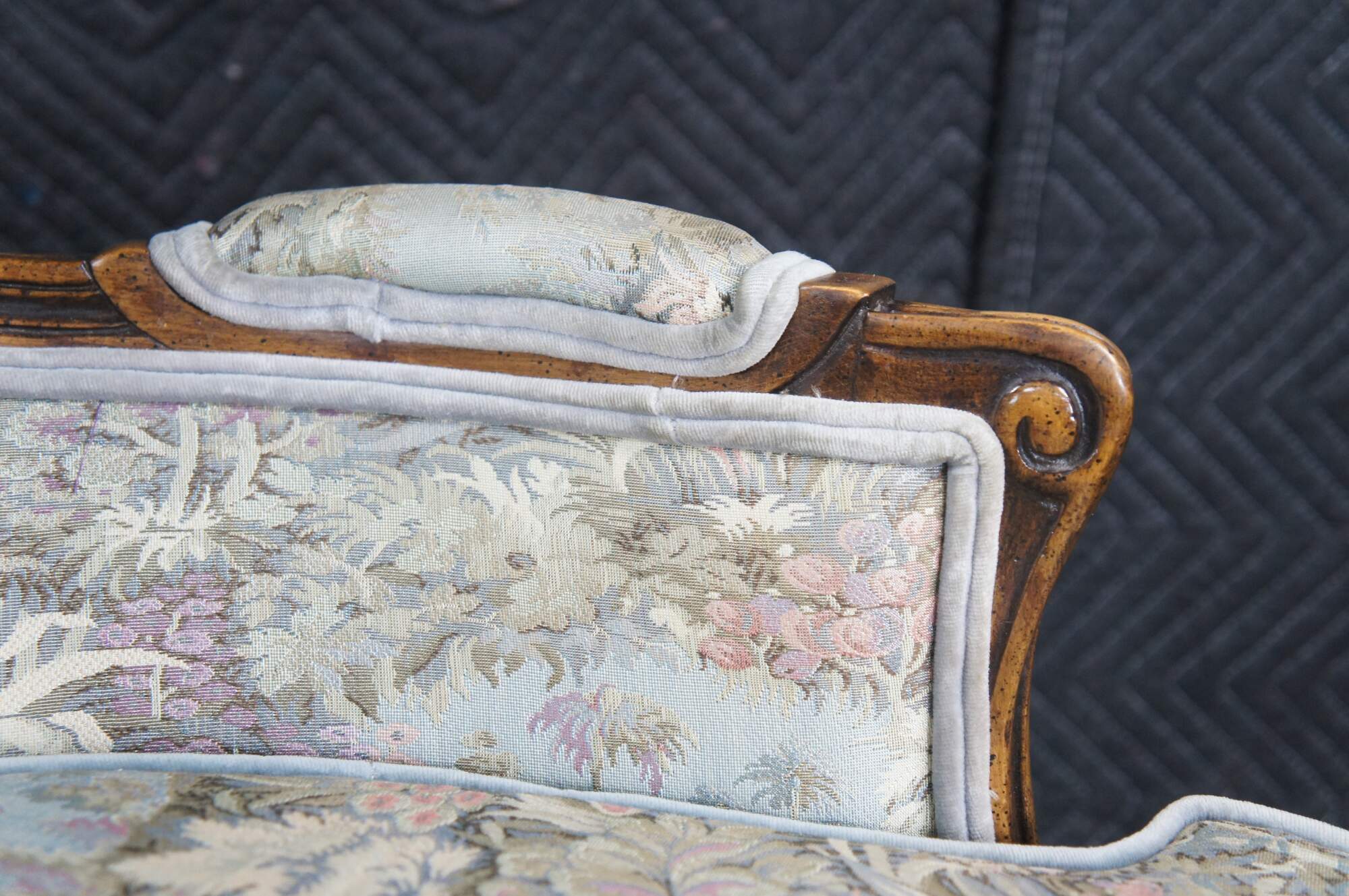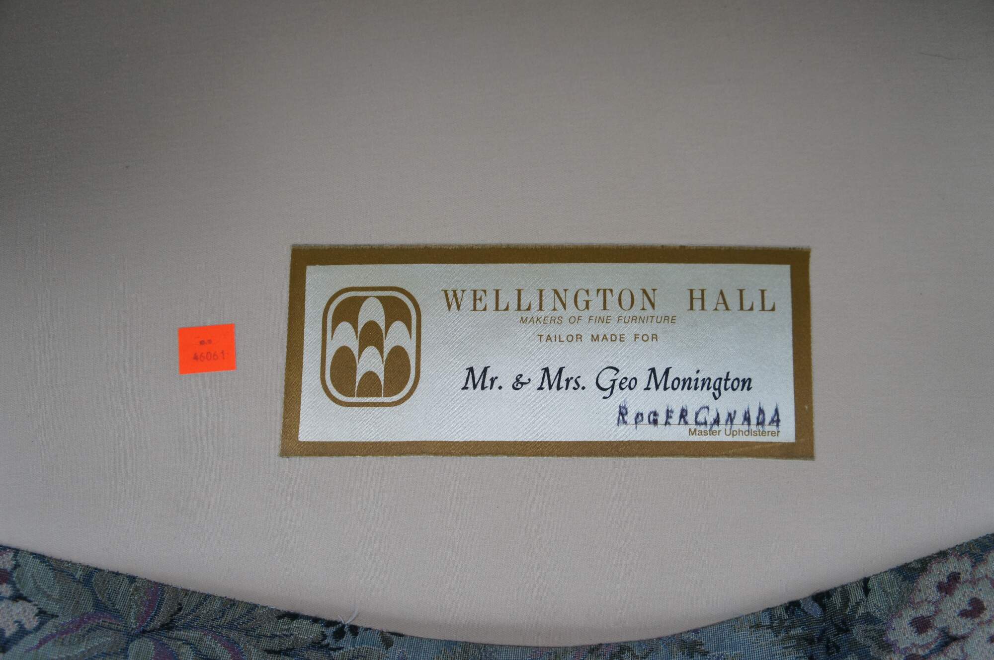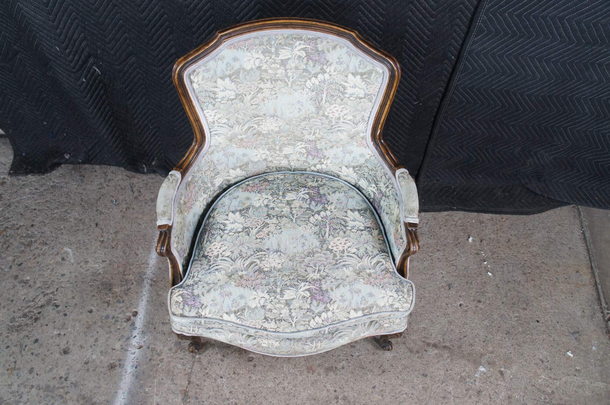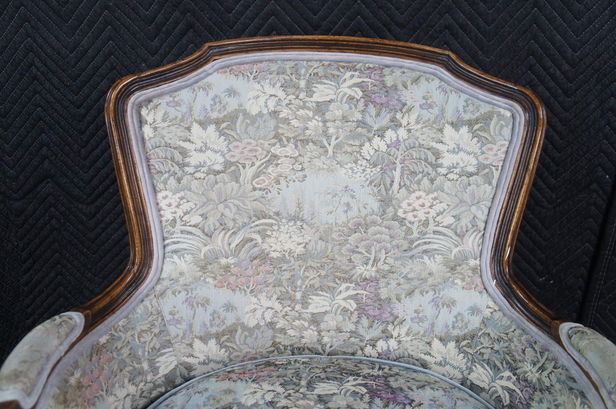 Pair of two vintage Wellington Hall floral upholstered fauteuil arm chairs. Made of walnut featuring French styling with domed wingback design, padded arms, serpentine accents and cabriole legs. Floral upholstered front, velvet back.