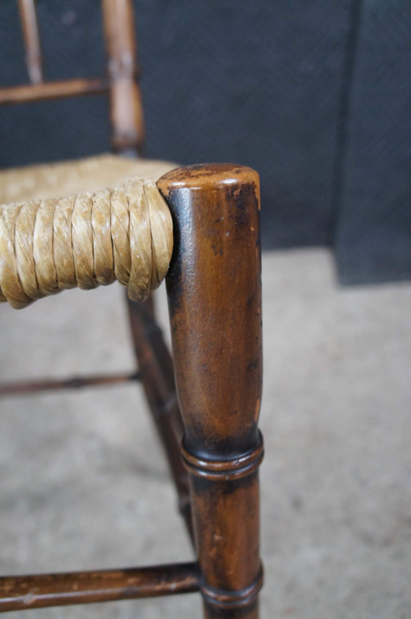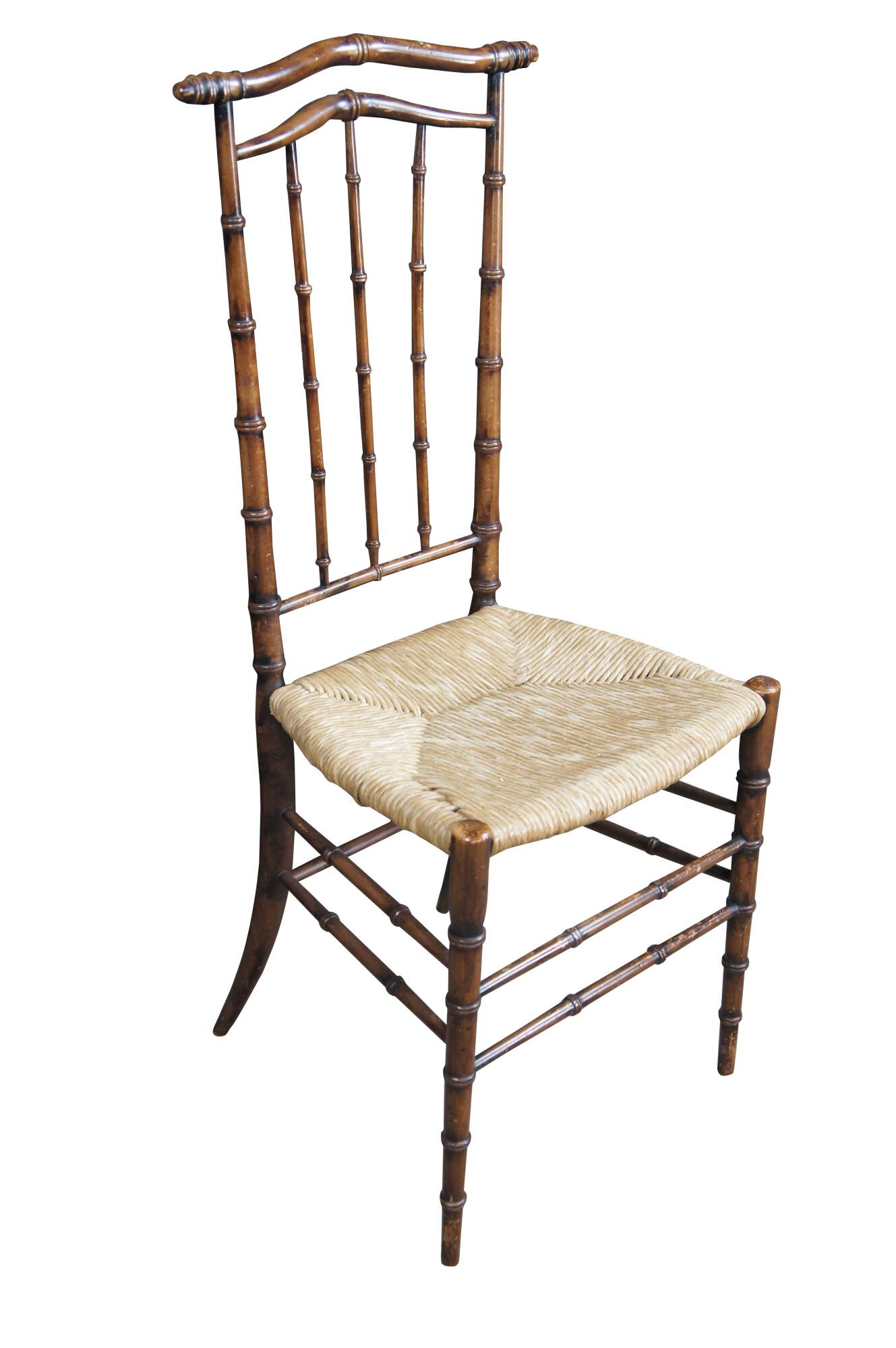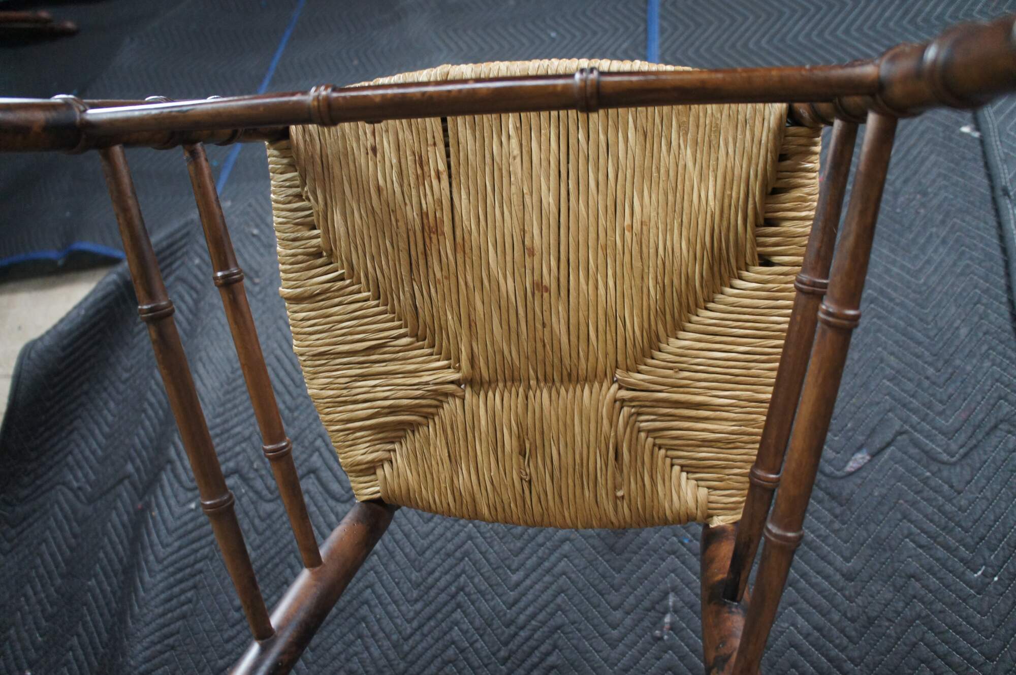 Pair of two mid century circa 1970s high back side dining chairs. Made of Beech or Beechwood featuring a chinoiserie design with faux bamboo slatted supports and rush seats.