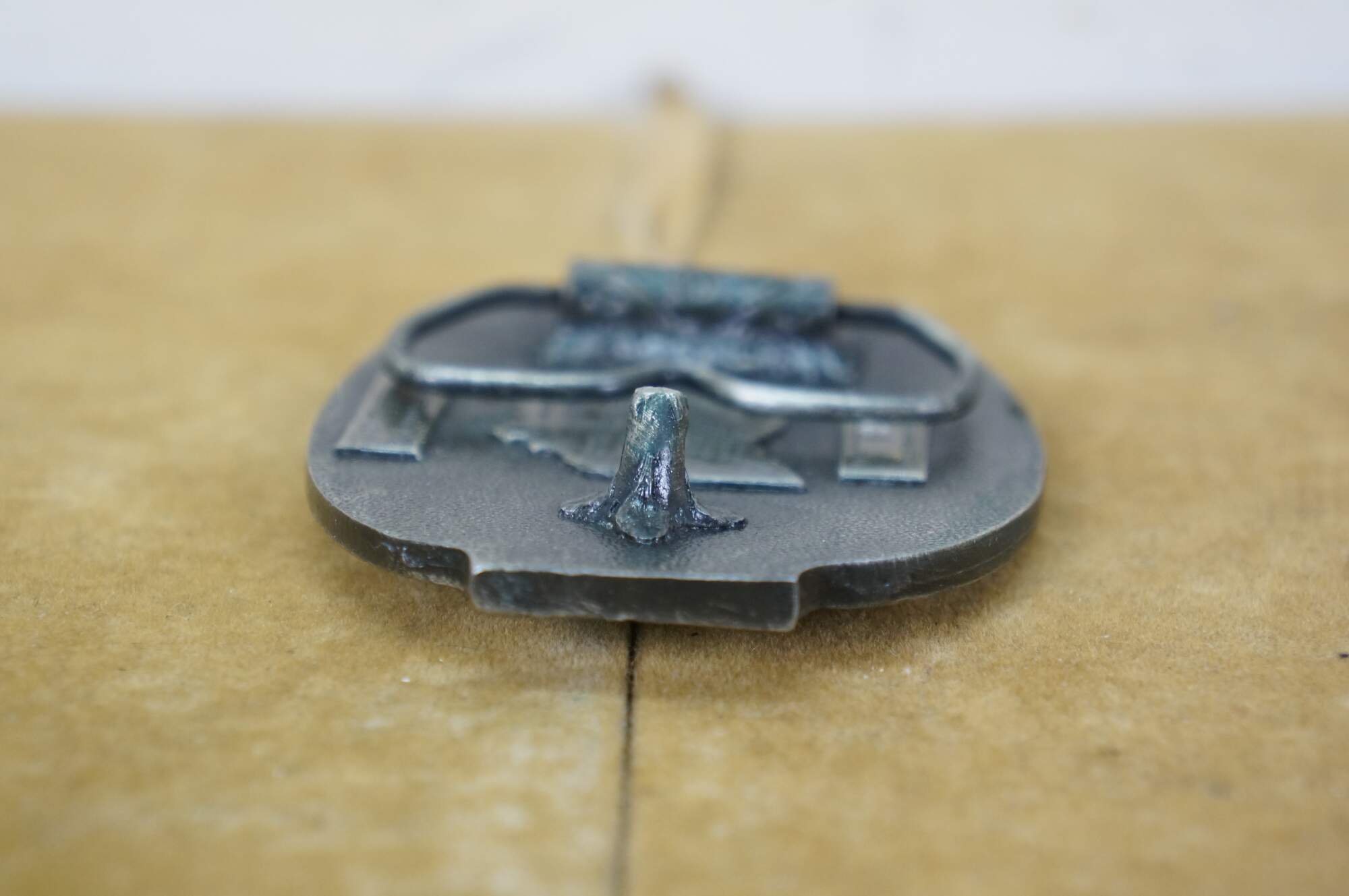 Vintage 1982 limited edition belt buckle showing a bird's eye view of the William H. Zimmer Nuclear Power Station Unit 1 facility in Moscow, Ohio. Numbered 381/500. Copyrighted 1982 for K&K Ltd.