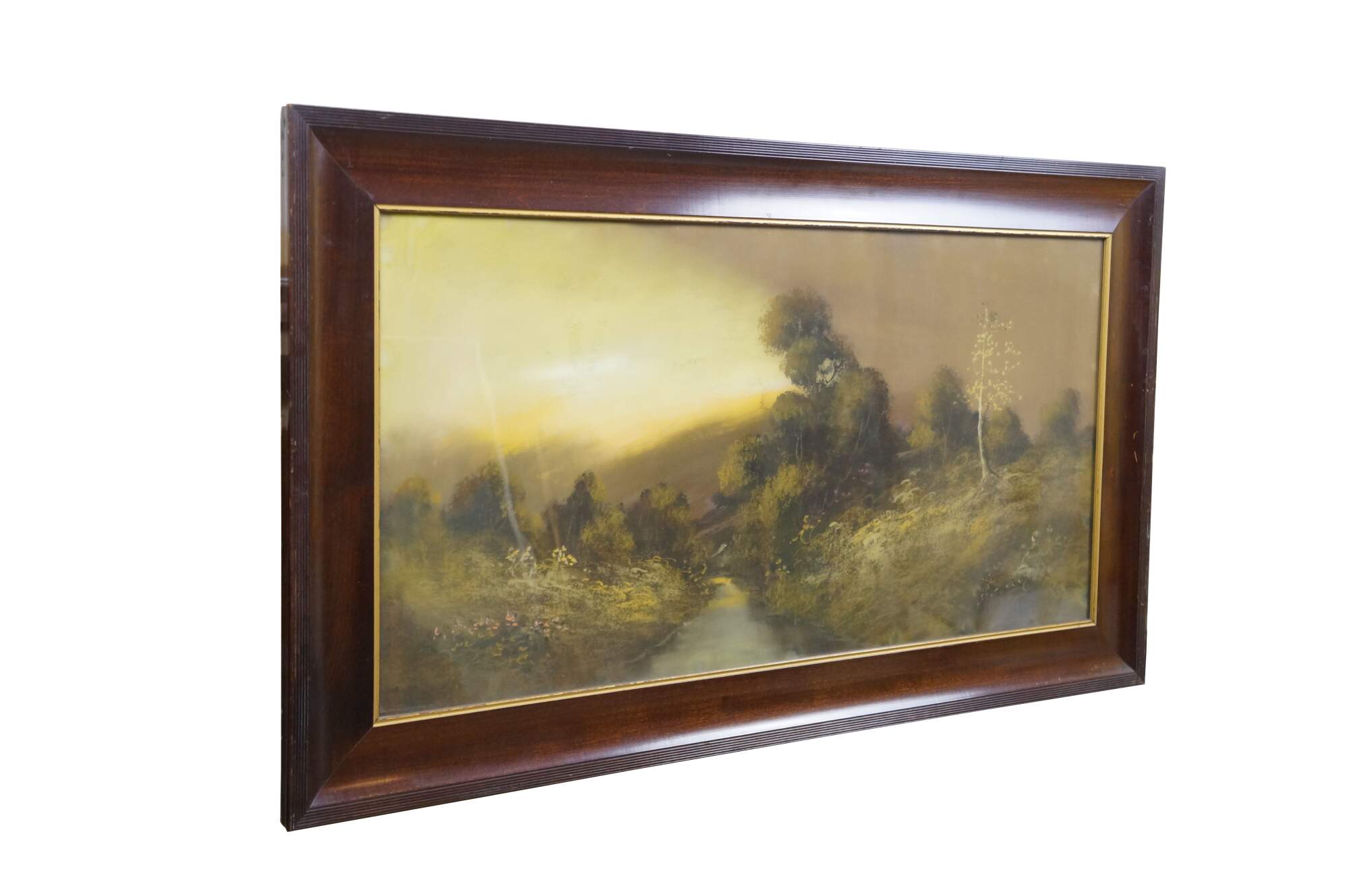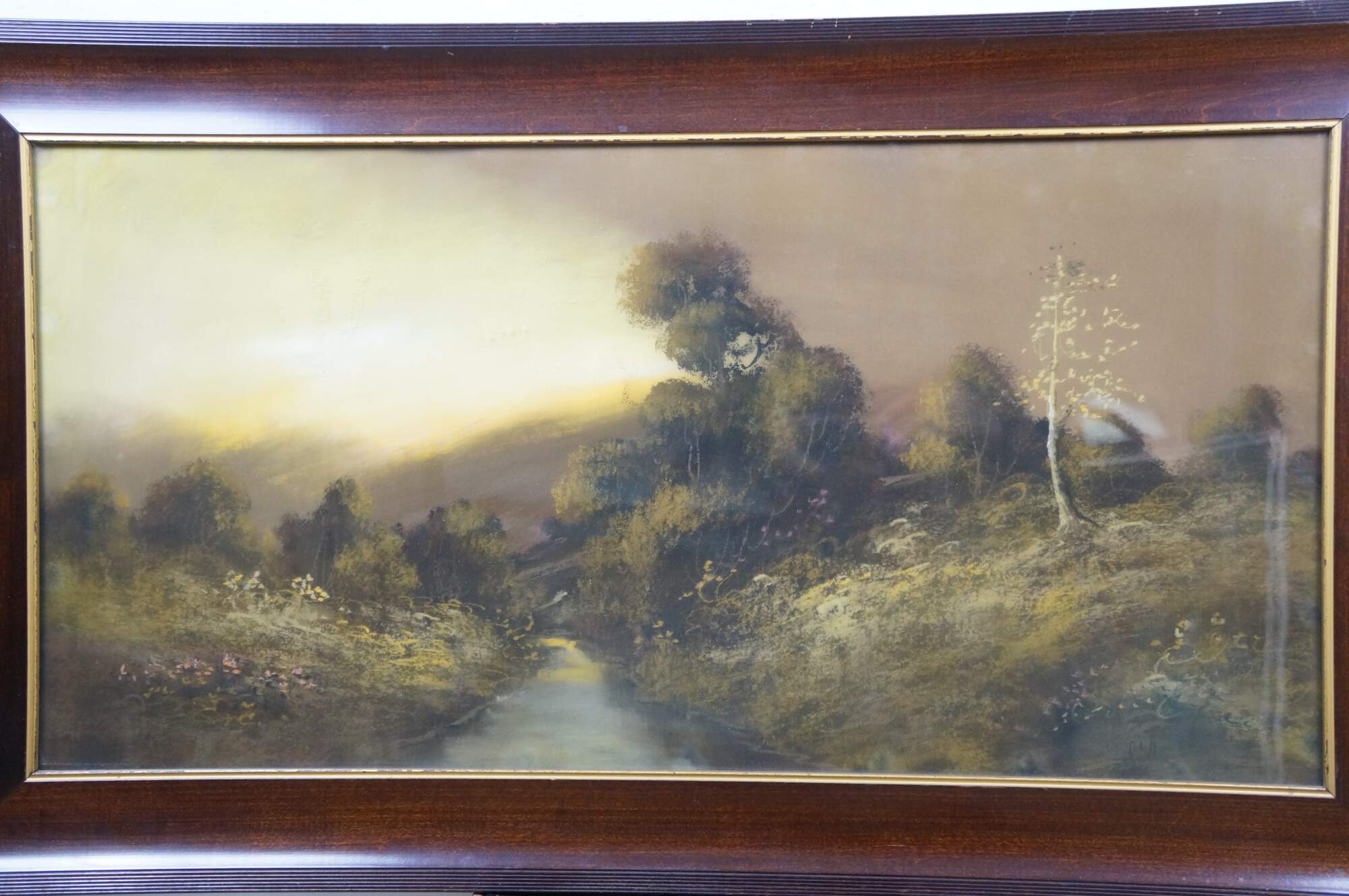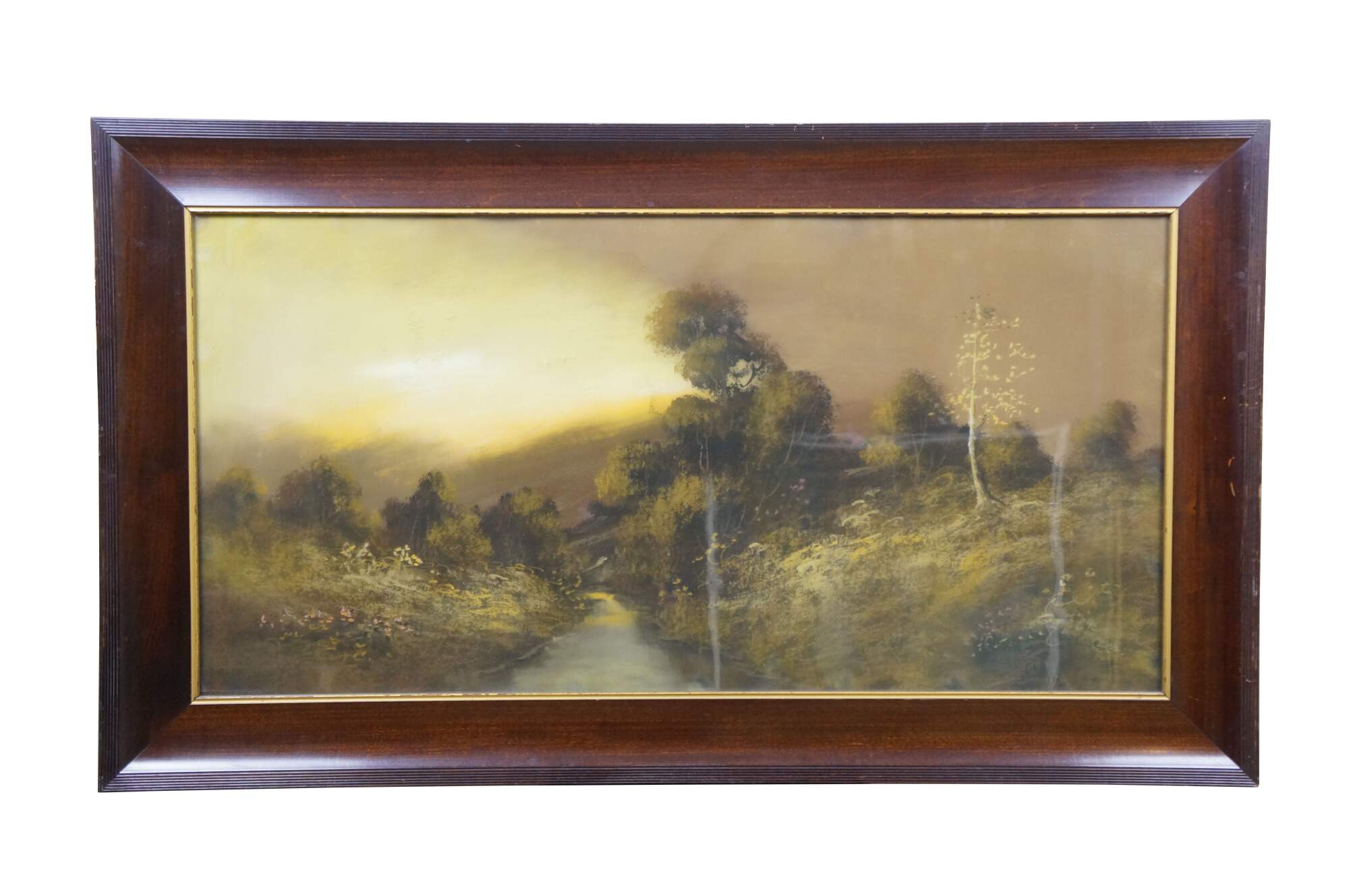 Circa early 20th century pastel landscape painting depicting a lush country landscape cut by a small stream. Signed in lower right, attributed to William Henry Chandler. Beveled wood frame with grooved detail and gilt inner border.