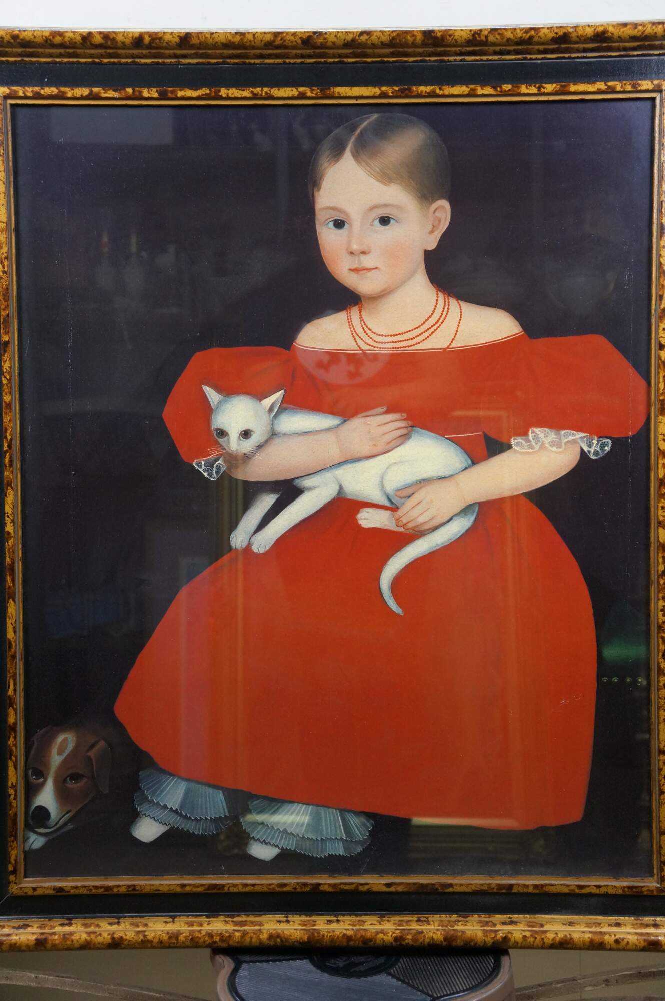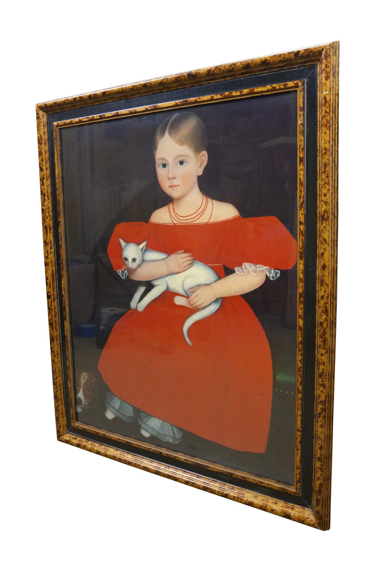 Large vintage print depicting "Girl in Red Dress with cat and Dog" by American portrait artist Ammi Phillips, originally painted circa 1830-1835. Shows a young girl dressed in a bright red dress, holding a white cat on her lap and a small dog at her feet. Black and faux tortoiseshell painted frame, print under museum glass..