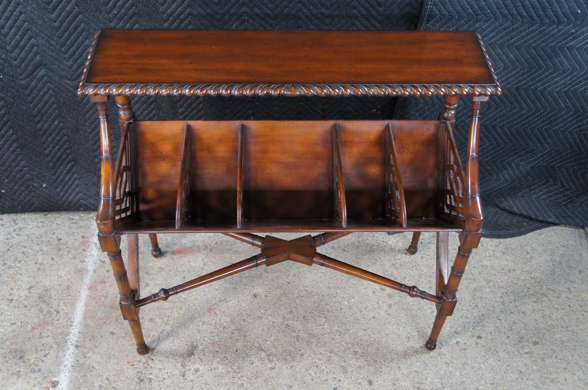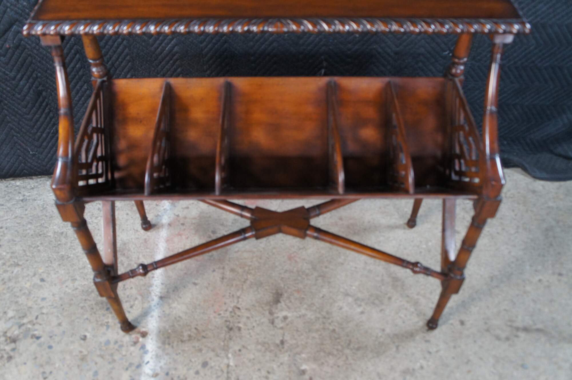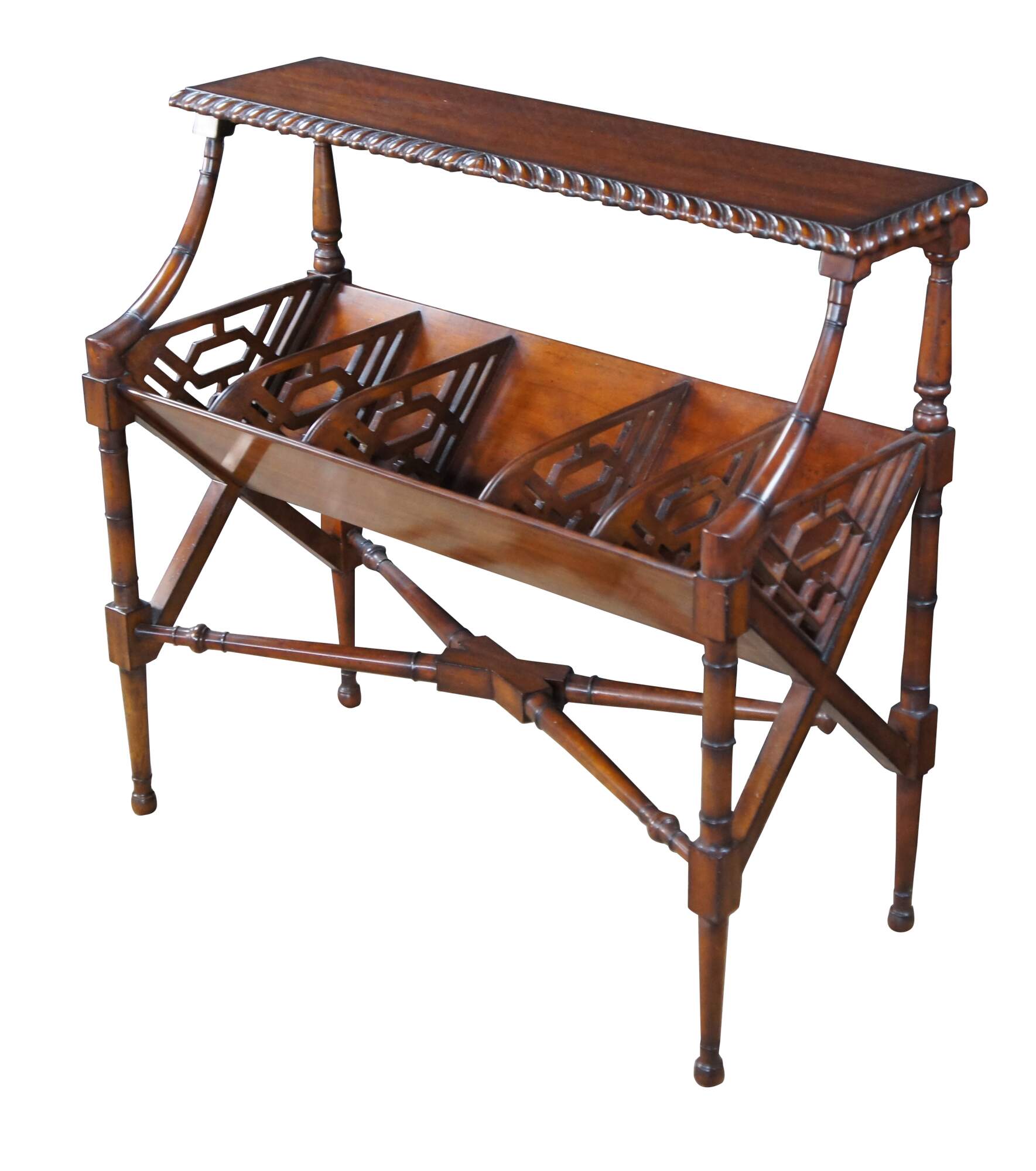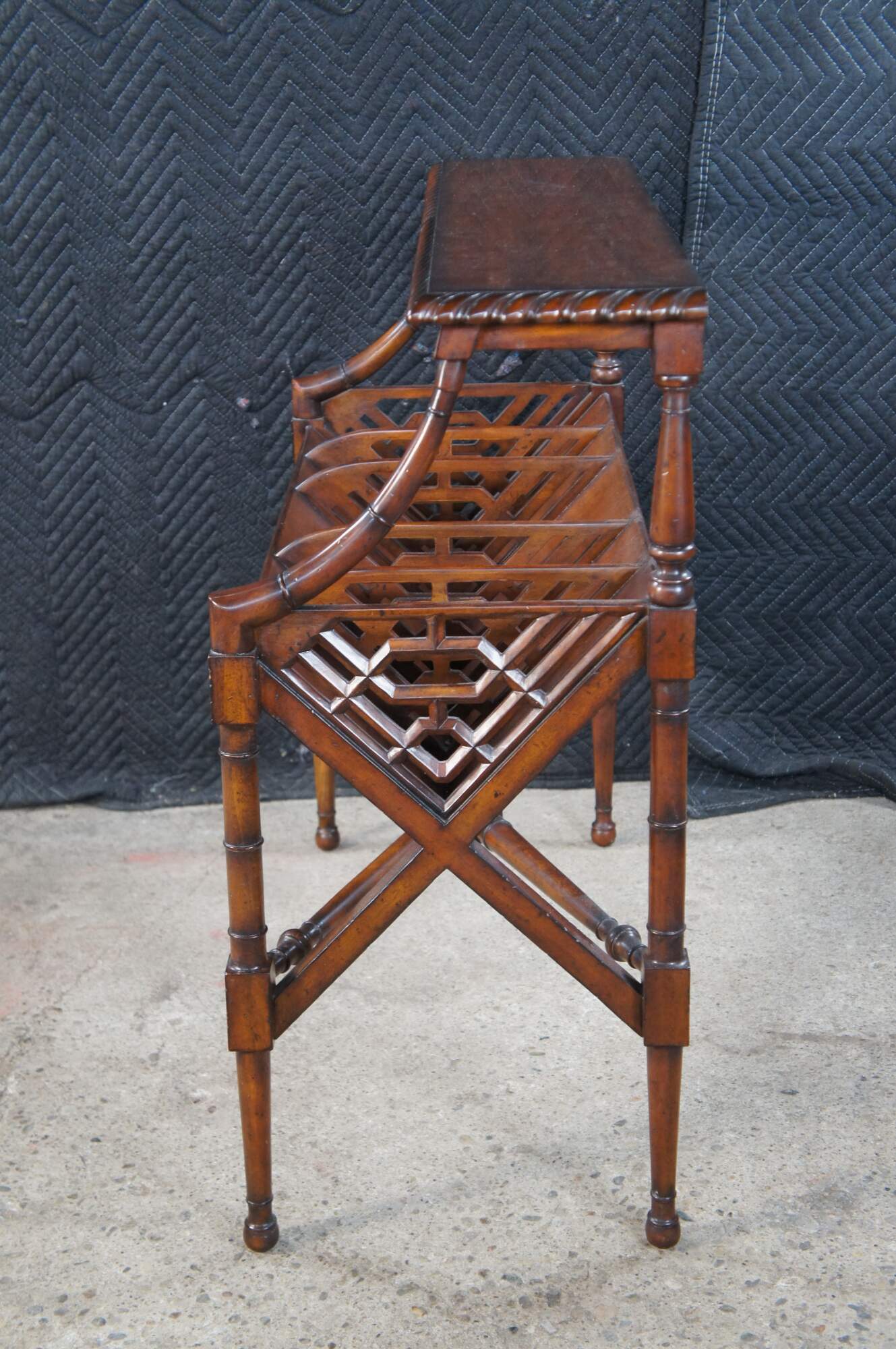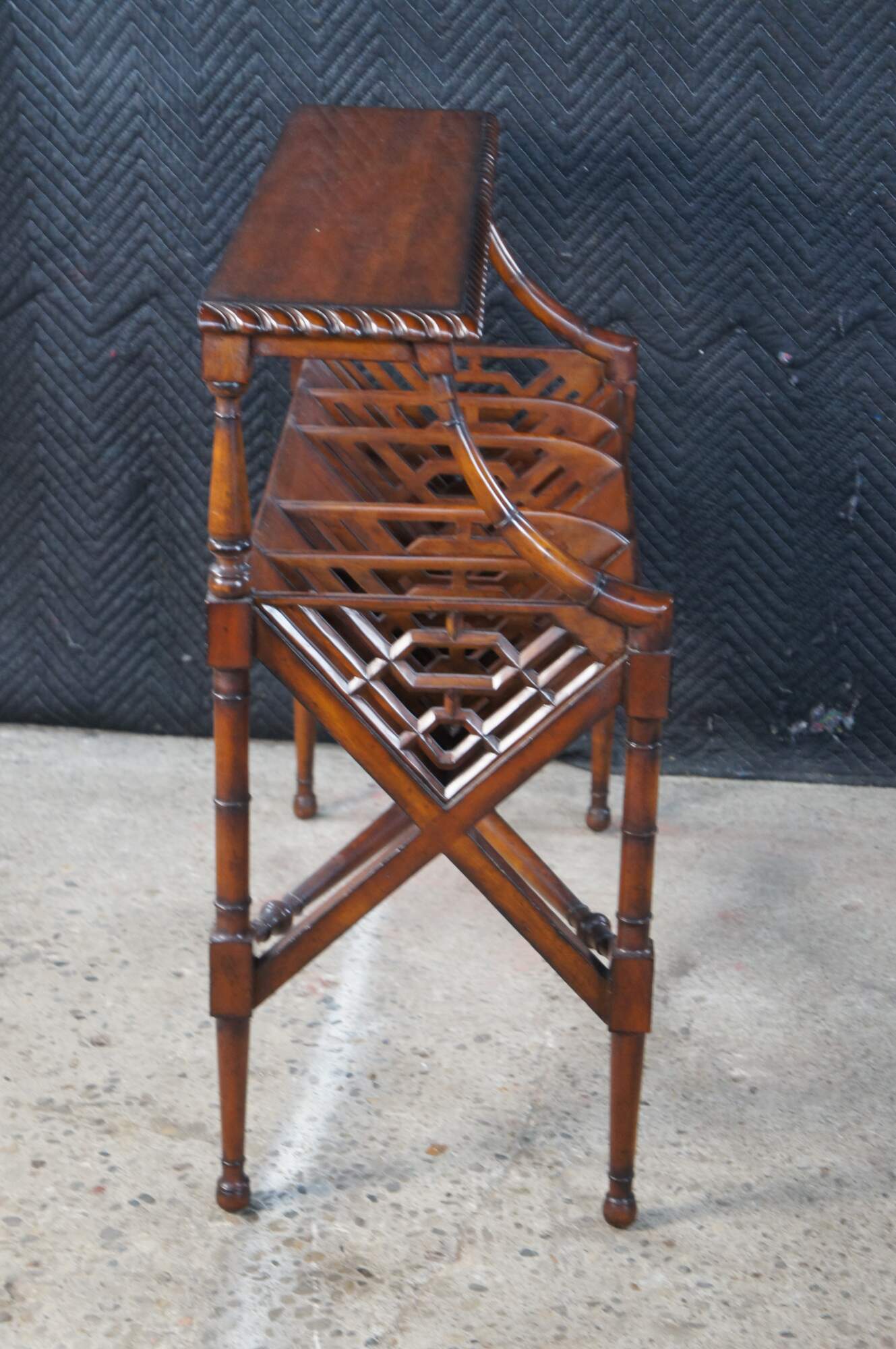 Vintage Maitland Smith Chinese Chippendale style bookcase / book stand / trough side table / library console. Made of mahogany featuring a tiered design with upper gadrooning edged shelf and lower reticulated / pierced book divider, supported by faux bamboo form legs and stretchers.