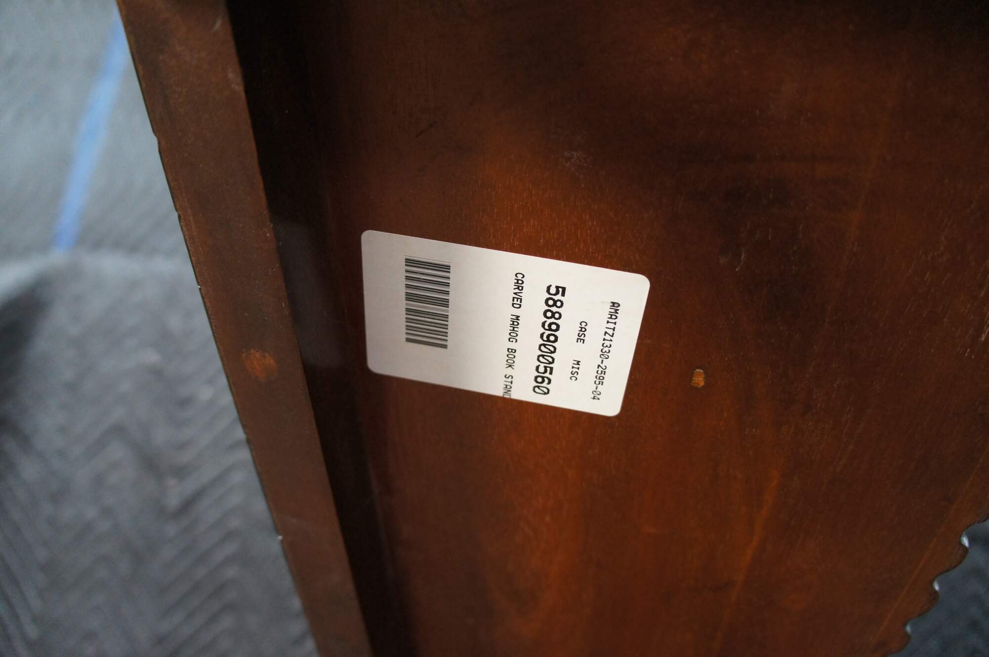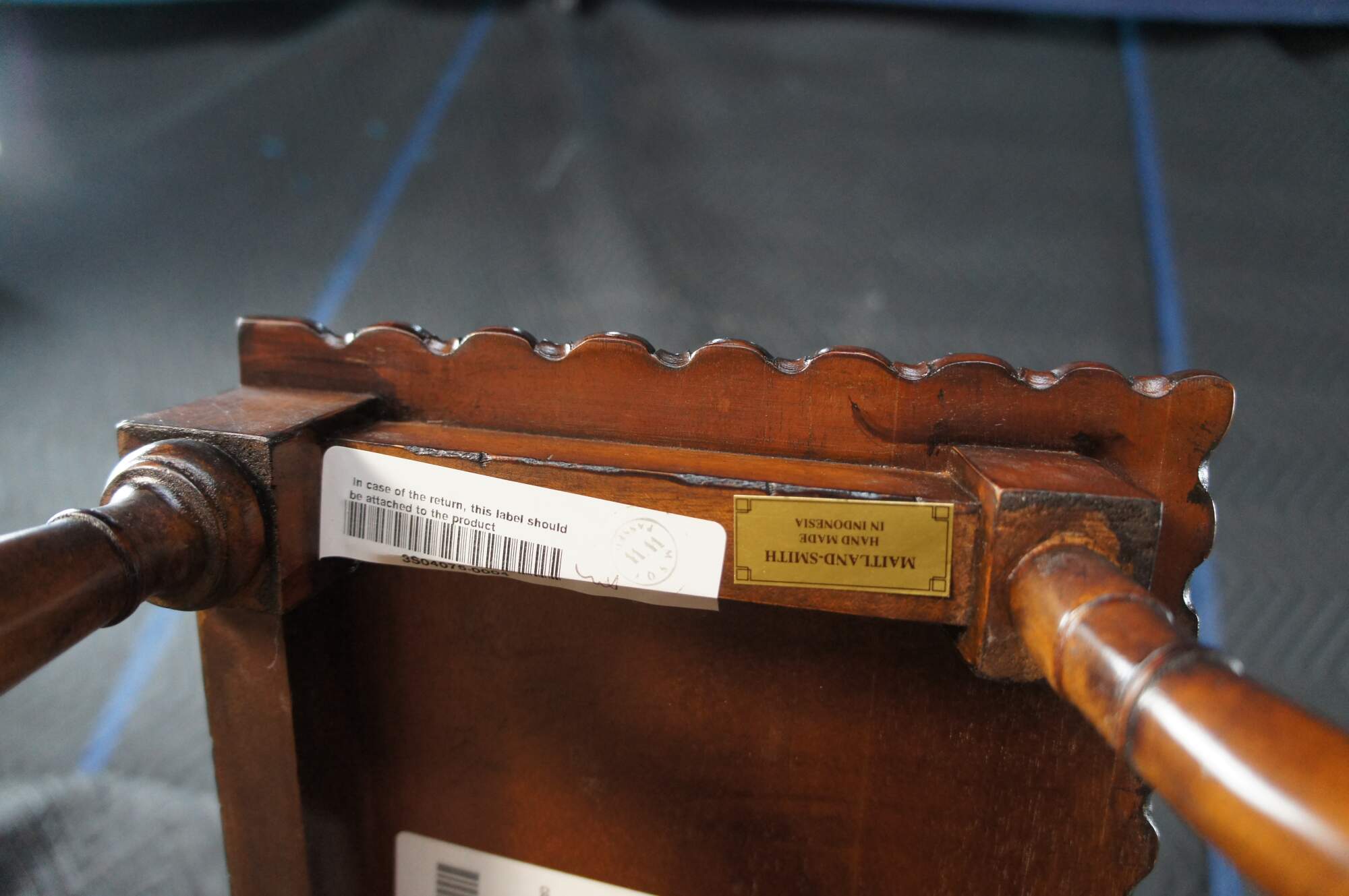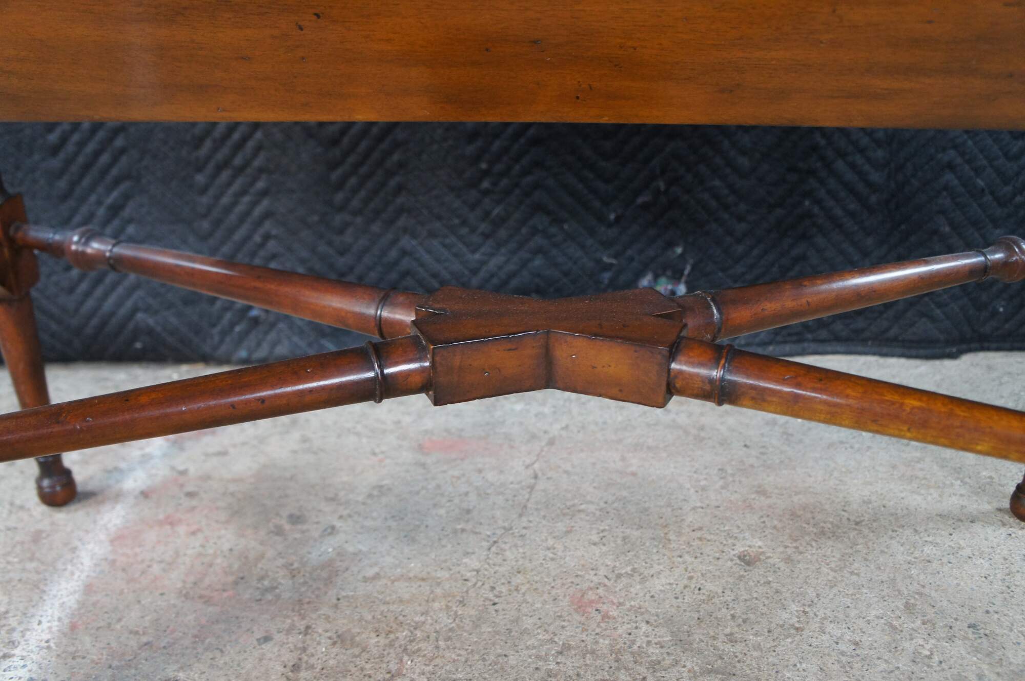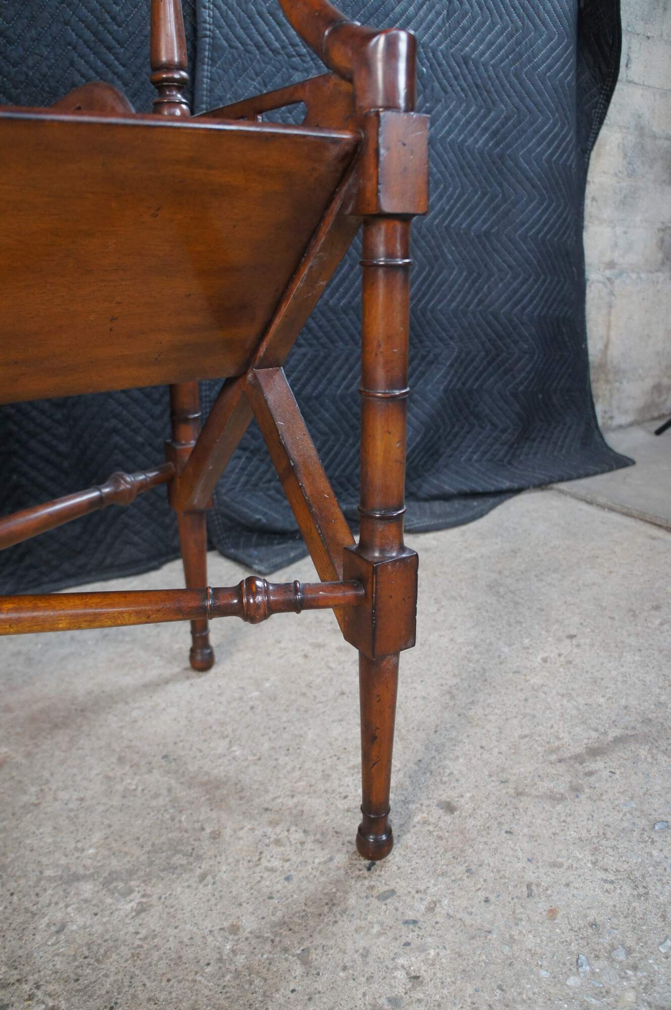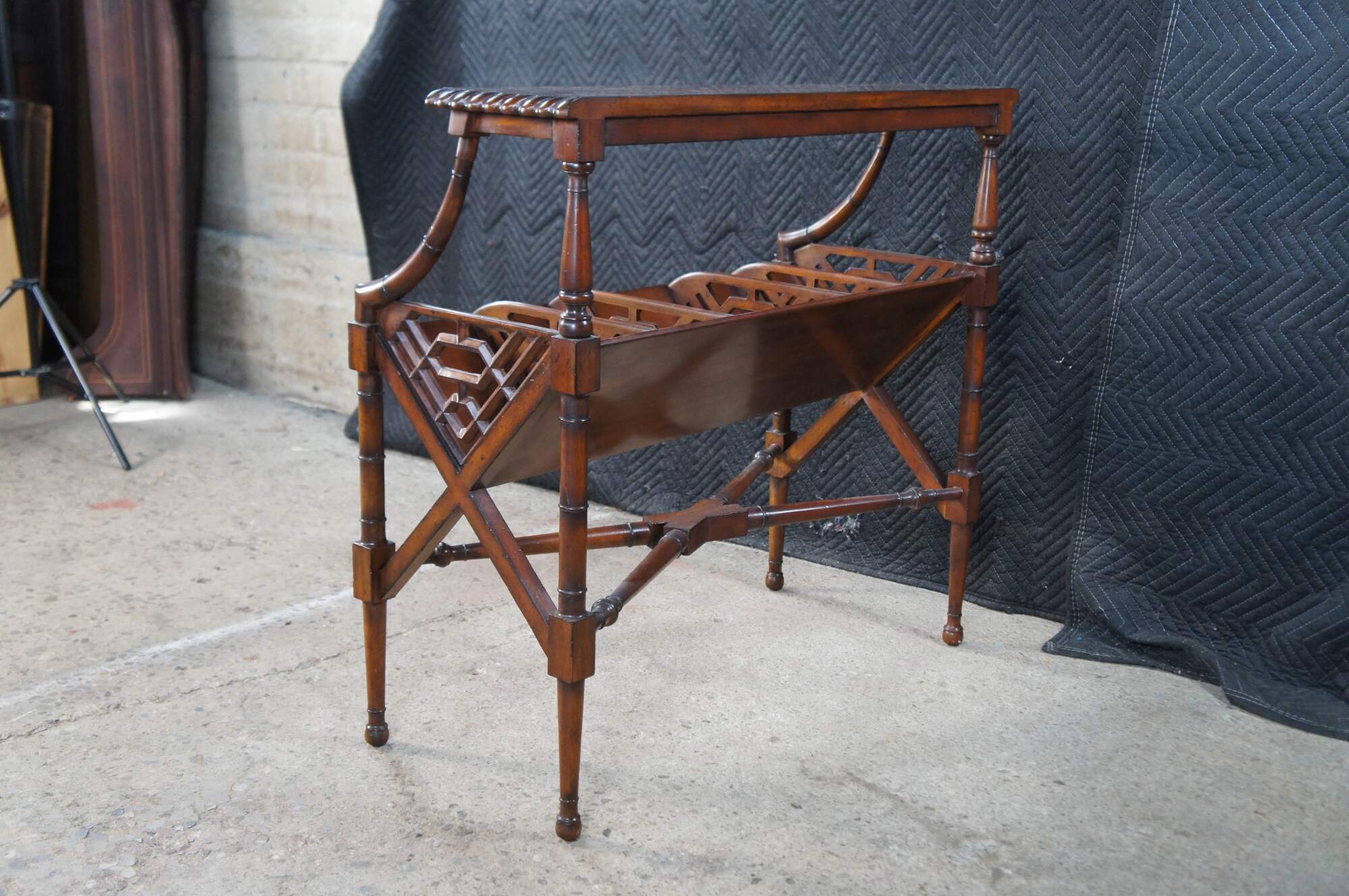 Vintage Maitland Smith Chinese Chippendale style bookcase / book stand / trough side table / library console. Made of mahogany featuring a tiered design with upper gadrooning edged shelf and lower reticulated / pierced book divider, supported by faux bamboo form legs and stretchers.